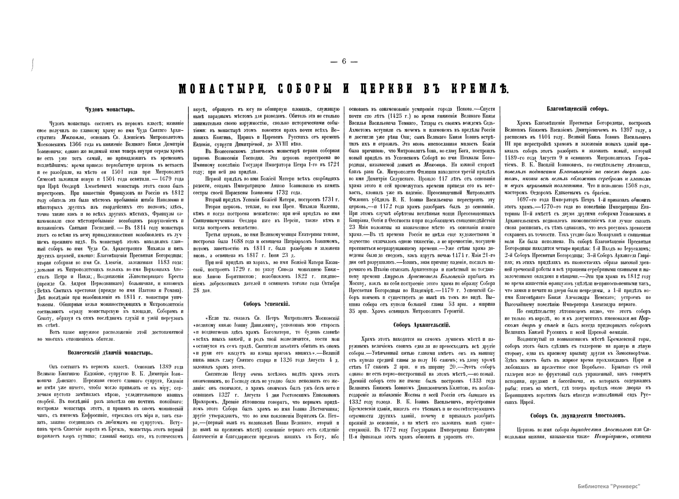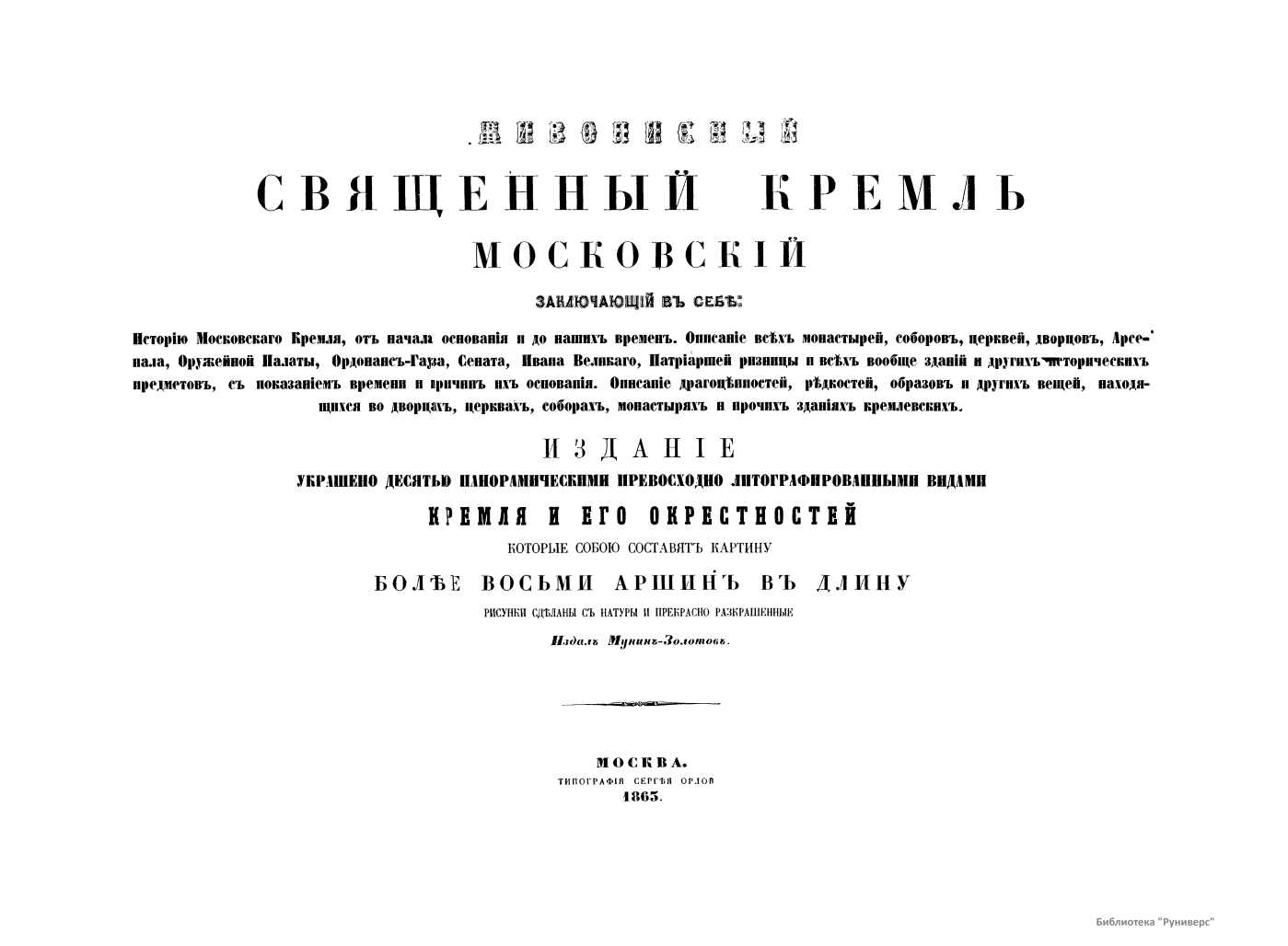 Издание включает историю Московского Кремля от начала основания до 60-х годов XIX века. Описание всех исторических памятников Кремля с указанием времени и причин их основания. Описание драгоценностей, редкостей, образов и других вещей, находящихся в кремлевских зданиях. Книга украшена десятью литографиями с видами Кремля и его окрестностей.