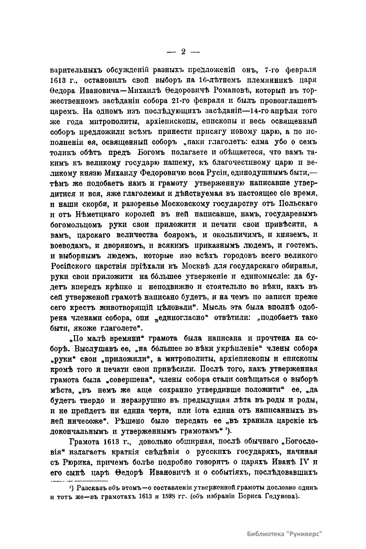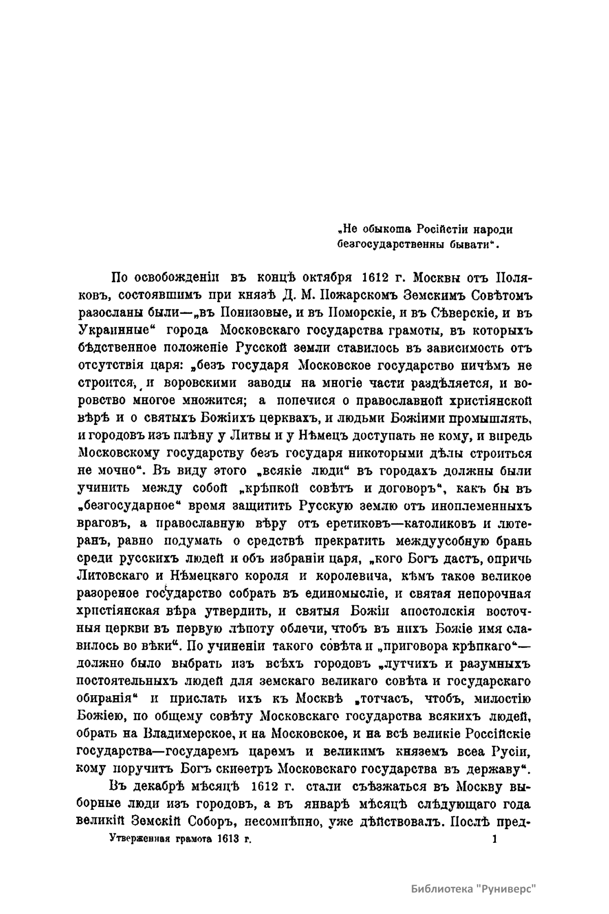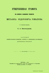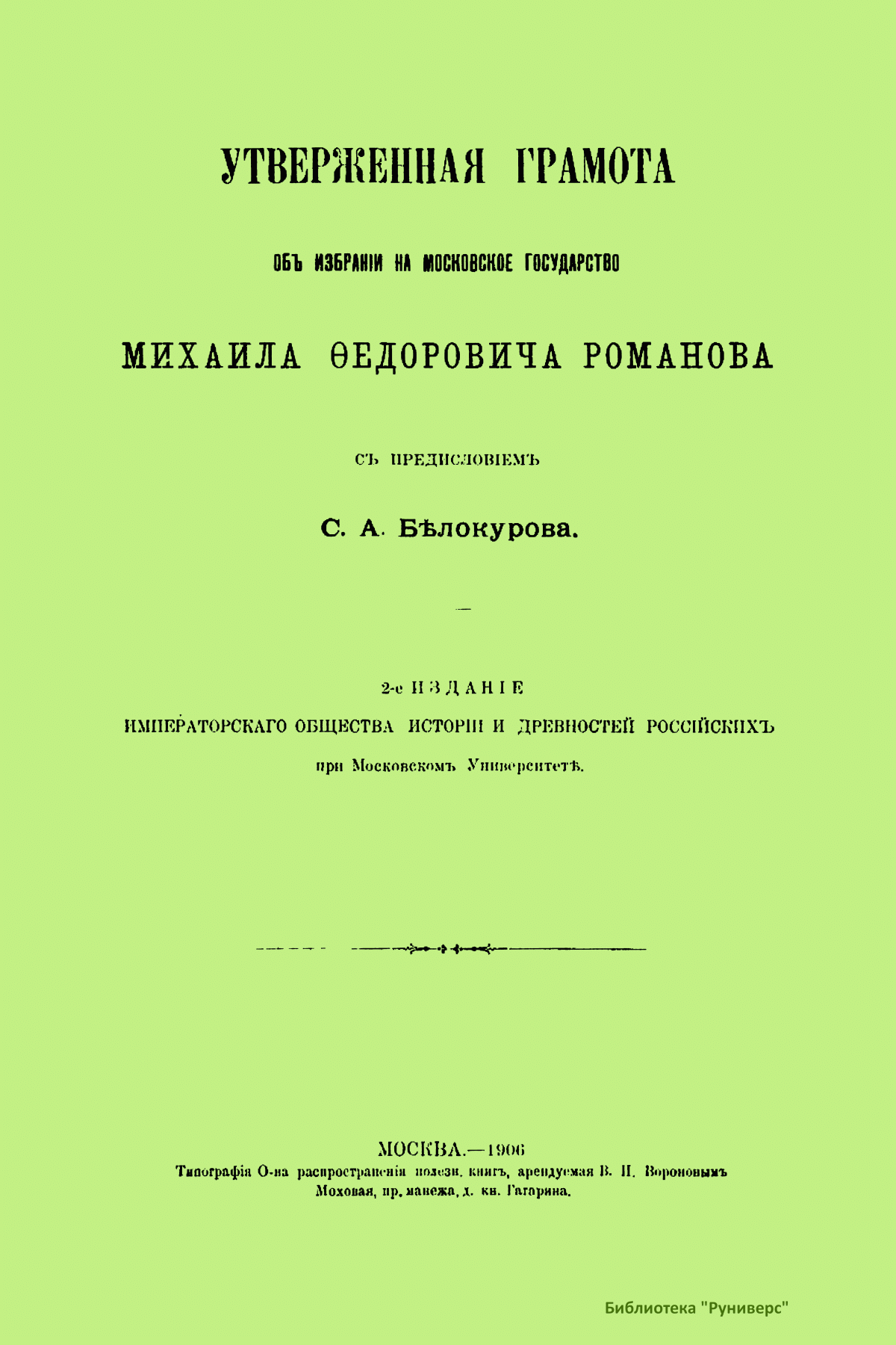 21 февраля 1613 года на торжественном заседании Земского собора 16-летний племянник царя Федора Ивановича Михаил Федорович Романов был провозглашен царем Русского государства. 14 апреля того же года митрополиты, епископы, архиепископы и весь освященный собор предложили всем принести присягу новому царю, а по исполнении ее – принять «утверженную грамоту» «да будет впредь крепко и неподвижно и стоятельно во веки, как в сей утверженной грамоте написано будет». Эта обширная грамота излагает краткие сведения о русских государях начиная с Рюрика, причем более подробно говорит о царе Иване IV и его сыне Федоре Ивановиче и о событиях, последовавших за смертью последнего: об избрании на Московский царский престол Бориса Годунова и его правлении; о появлении Лжедмитрия; царствовании Лжедмитрия и Василия Шуйского; об избрании на Московский престол польского королевича Владислава; о хозяйничании поляков в Москве и их распоряжениях по Московскому государству; о деятельности патриарха Гермогена против поляков и последовавшем затем восстании русских под руководством князя Д. Т. Трубецкого и князя Д. М. Пожарского; об освобождении ими Москвы и избрании царем Михаила Федоровича Романова; об отправлении к последнему с известием об этом особого посольства в Кострому. Грамота приводит речь, которую посольство должно было сказать царю при первой встрече, и затем влагает в уста и царю, и его матери, и посольству целый ряд речей при отказе Михаила Федоровича от царского престола. Она сообщает и о последовавших после согласия царя событиях в Москве и Костроме. Сведения о списках грамоты приведены в обширном вступлении С. А. Белокурова.