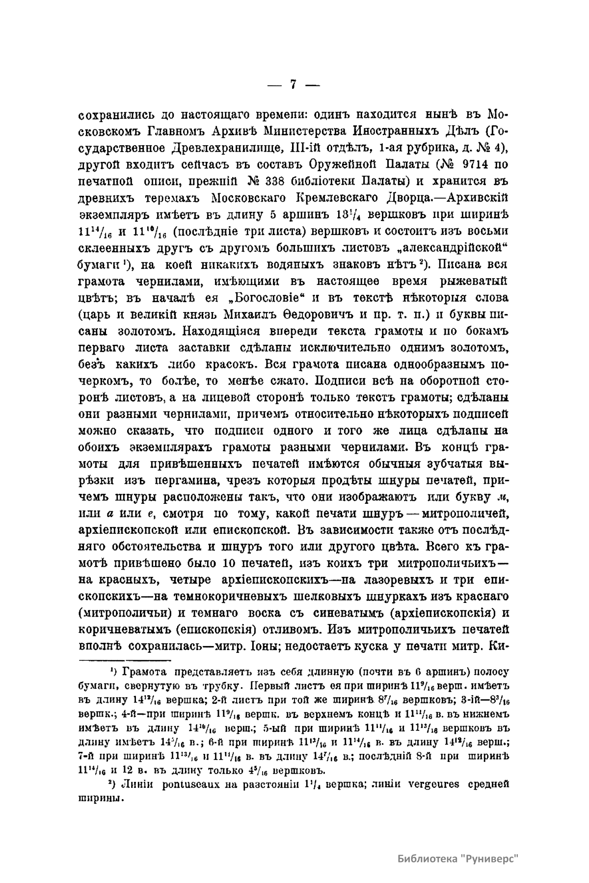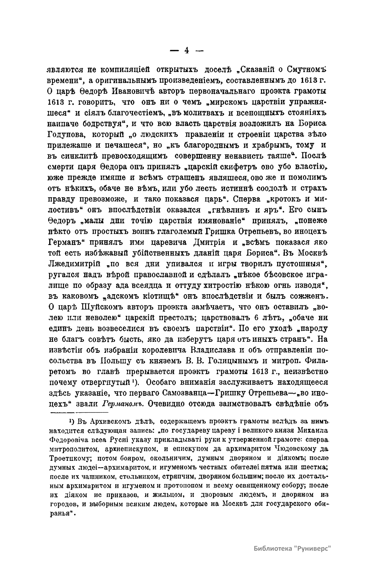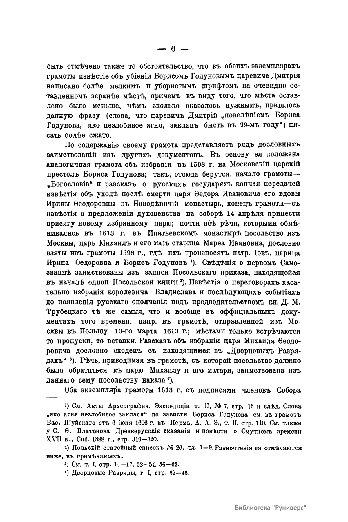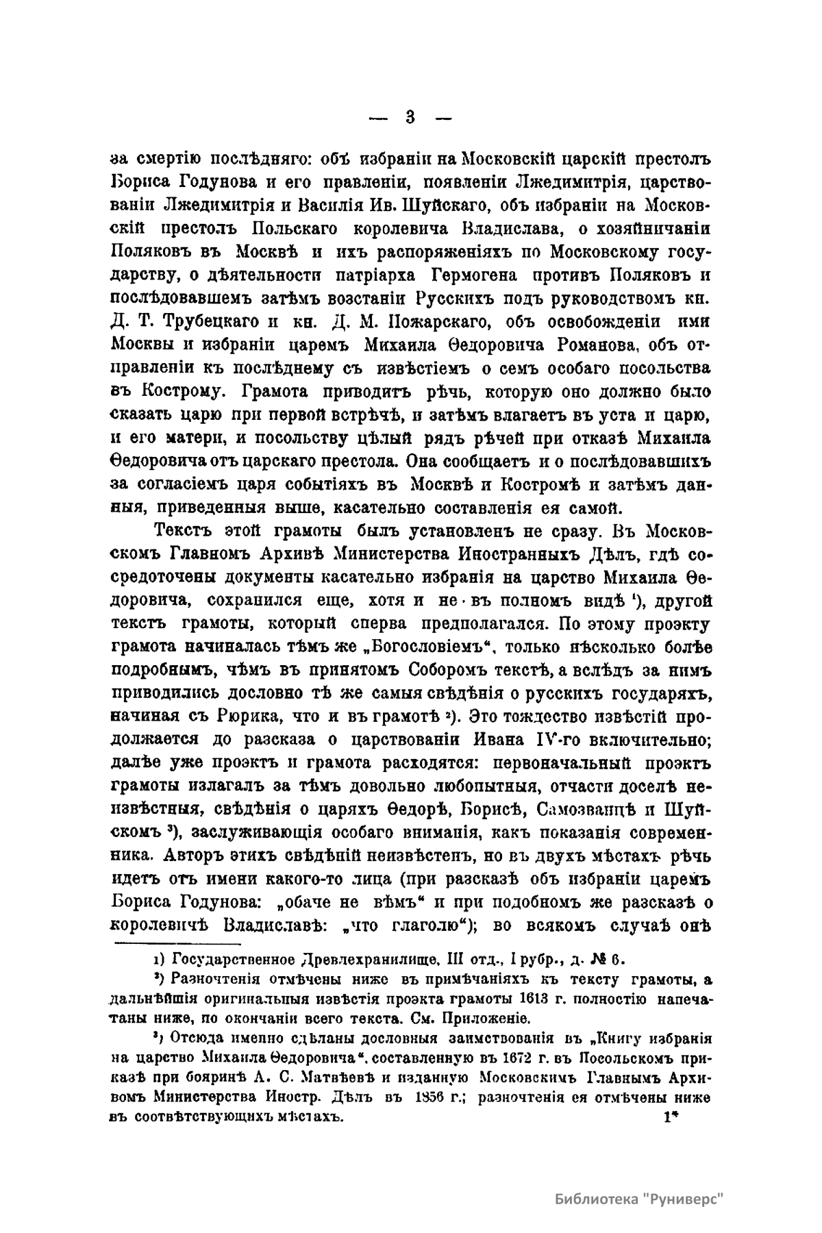 21 февраля 1613 года на торжественном заседании Земского собора 16-летний племянник царя Федора Ивановича Михаил Федорович Романов был провозглашен царем Русского государства. 14 апреля того же года митрополиты, епископы, архиепископы и весь освященный собор предложили всем принести присягу новому царю, а по исполнении ее – принять «утверженную грамоту» «да будет впредь крепко и неподвижно и стоятельно во веки, как в сей утверженной грамоте написано будет». Эта обширная грамота излагает краткие сведения о русских государях начиная с Рюрика, причем более подробно говорит о царе Иване IV и его сыне Федоре Ивановиче и о событиях, последовавших за смертью последнего: об избрании на Московский царский престол Бориса Годунова и его правлении; о появлении Лжедмитрия; царствовании Лжедмитрия и Василия Шуйского; об избрании на Московский престол польского королевича Владислава; о хозяйничании поляков в Москве и их распоряжениях по Московскому государству; о деятельности патриарха Гермогена против поляков и последовавшем затем восстании русских под руководством князя Д. Т. Трубецкого и князя Д. М. Пожарского; об освобождении ими Москвы и избрании царем Михаила Федоровича Романова; об отправлении к последнему с известием об этом особого посольства в Кострому. Грамота приводит речь, которую посольство должно было сказать царю при первой встрече, и затем влагает в уста и царю, и его матери, и посольству целый ряд речей при отказе Михаила Федоровича от царского престола. Она сообщает и о последовавших после согласия царя событиях в Москве и Костроме. Сведения о списках грамоты приведены в обширном вступлении С. А. Белокурова.