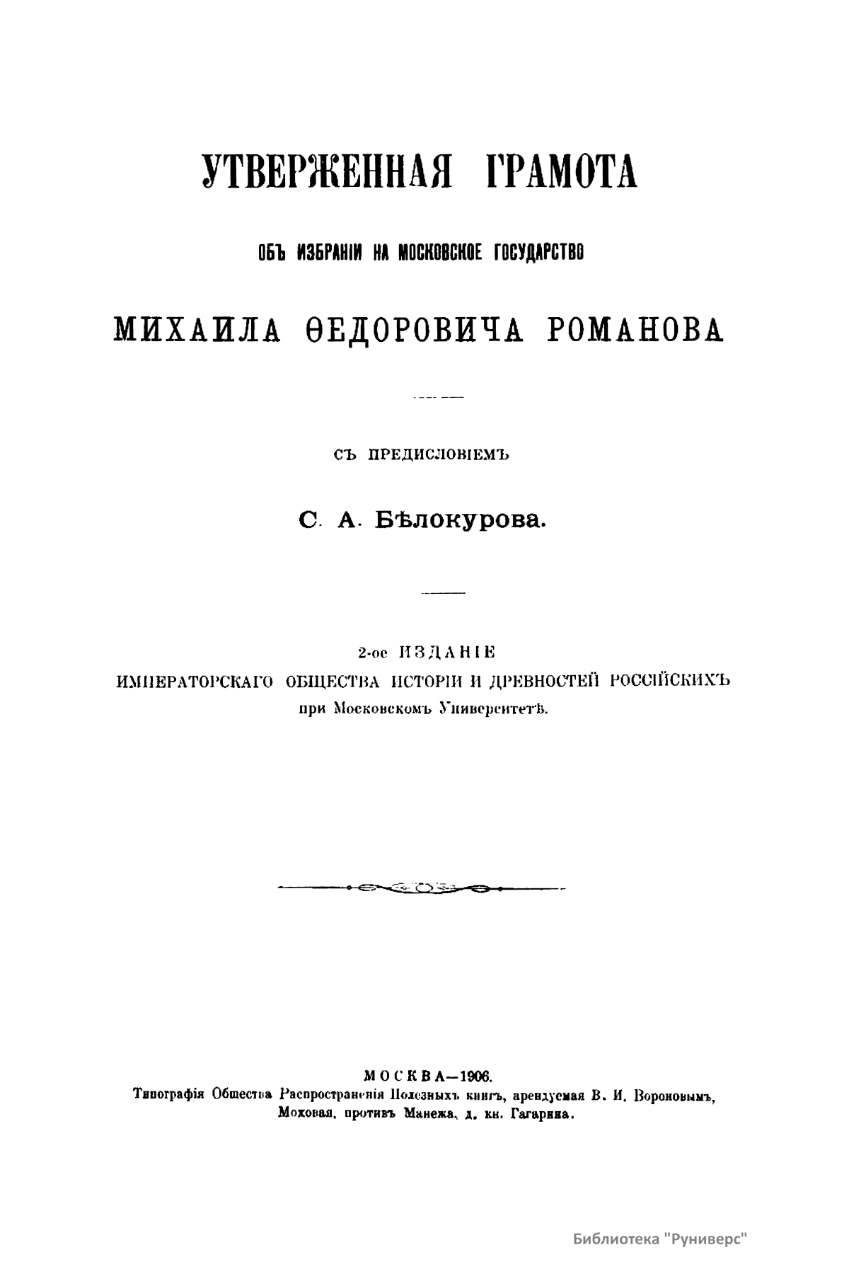 Утверженная грамота объ избранiи на московское государство Михаила ѳедоровича Романова