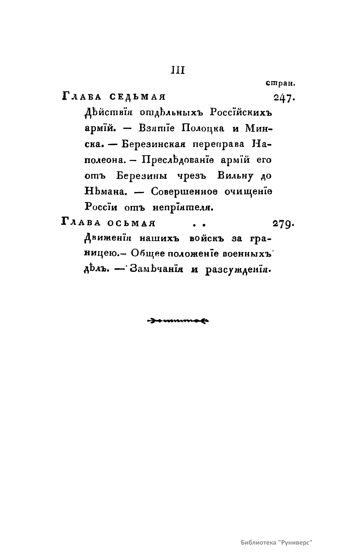 В книге описана освободительная война России против Наполеона Бонапарта. «Год сей пребудет незабвенным в позднейшем потомстве. К побиению орд Мамая, к поражению Карла под Полтавой история приобщит отныне сокрушение сил Наполеона. Россия, сражаясь с целою Европой, познала более, нежели в другое какое время, всю великость сил своих и способов и достигла в глазах целого света величайшей, никем не оспориваемой и неувядаемой славы».