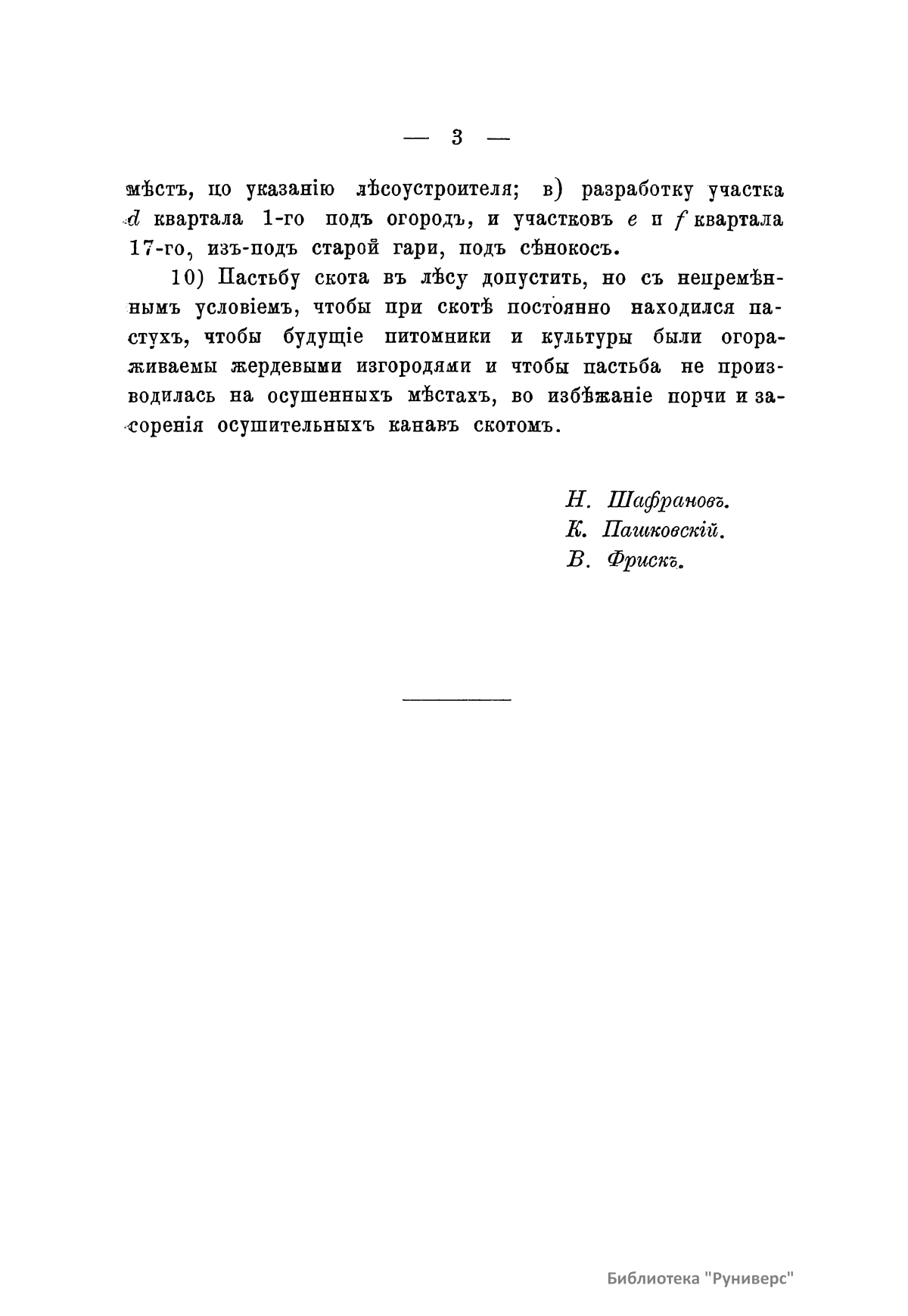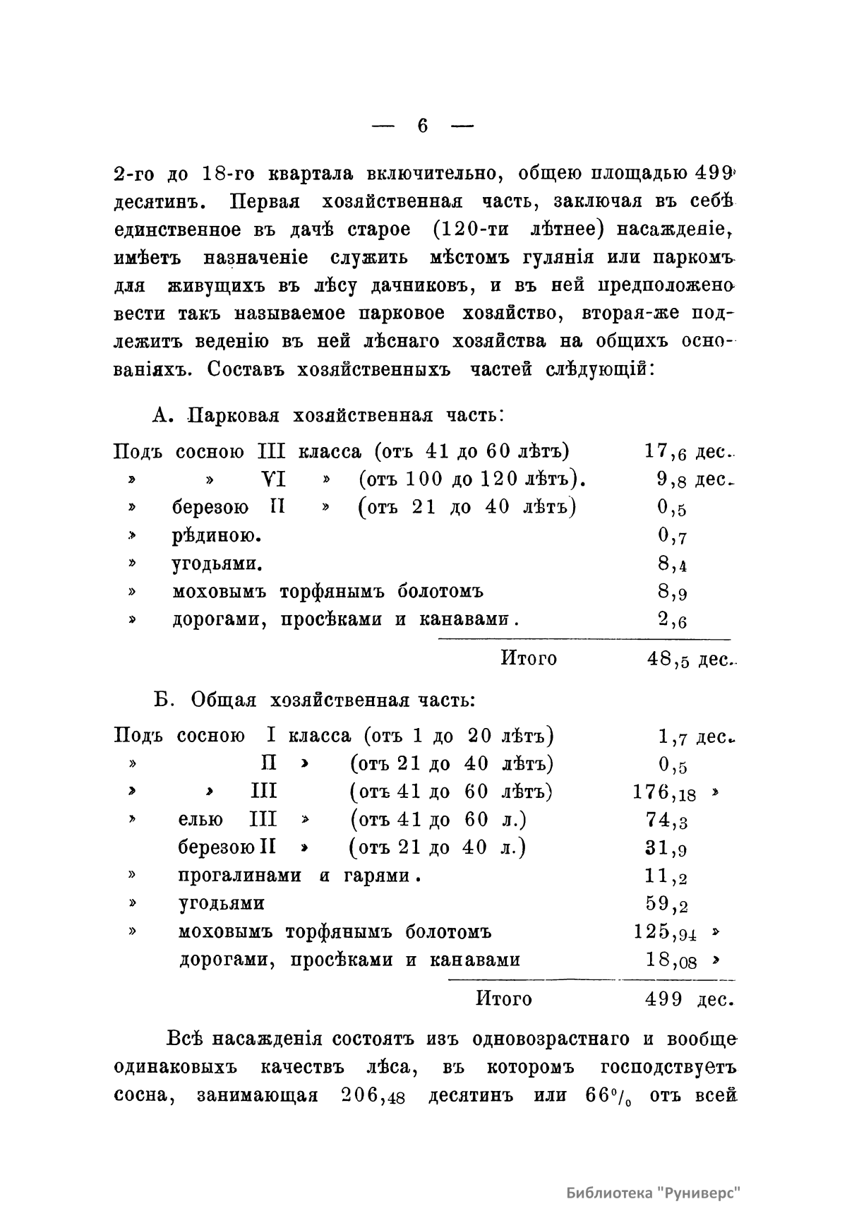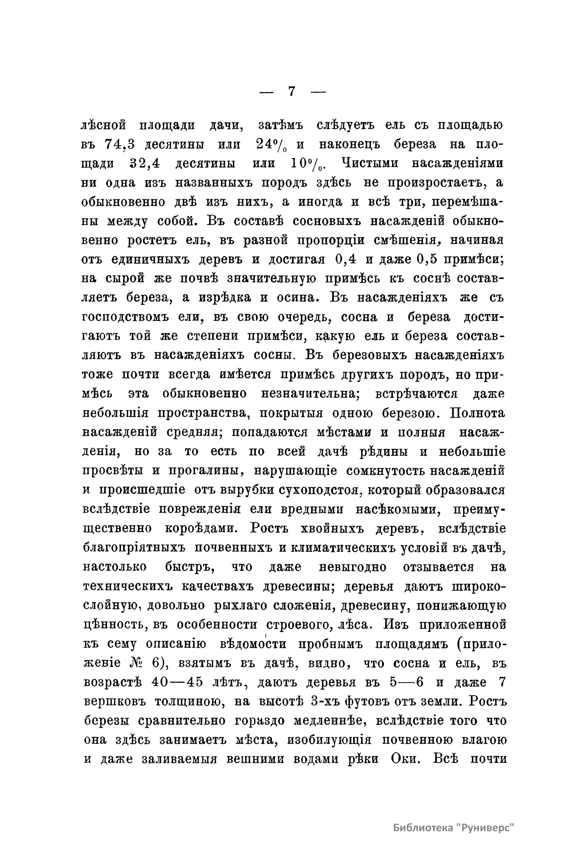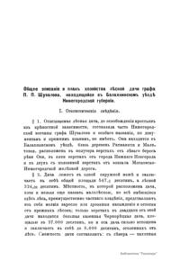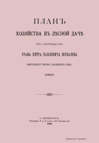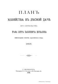 В книге опубликованы: протокол совещания по установлению оснований плана хозяйства (1); общее описание и план хозяйства (4); инвентарная опись участков (17); ведомость площадям классов возраста насаждений (40); ведомость участкам, в коих назначены промежуточные пользования на первое десятилетие (43); ведомость участкам, требующим культур и воспособления естественному осеменению (44); ведомость лесным работам, предположенным на ближайшее десятилетие (45); ведомость пробным площадям (47). Шувалов, Петр Павлович, граф (1827(?) – 1899(?)) – сын графа Павла Андреевича Шувалова, младший брат Андрея Павловича Шувалова (СПб. предводителя дворянства). Также петербургский губернский предводитель дворянства, председатель Петербургского дворянского комитета по подготовке крестьянской реформы 1861 года.