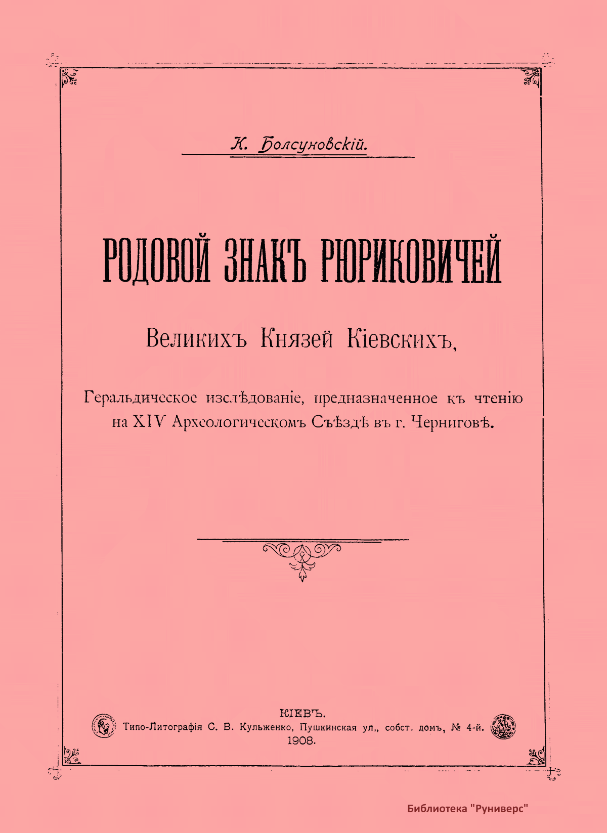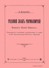Родовой знакъ Рюриковичей Великихъ Князей Кiевскихъ. Геральдическое изслѣдованiе, предназначенное къ чтенiю на XIV Археологическомъ Съѣздѣ въ г. Черниговѣ