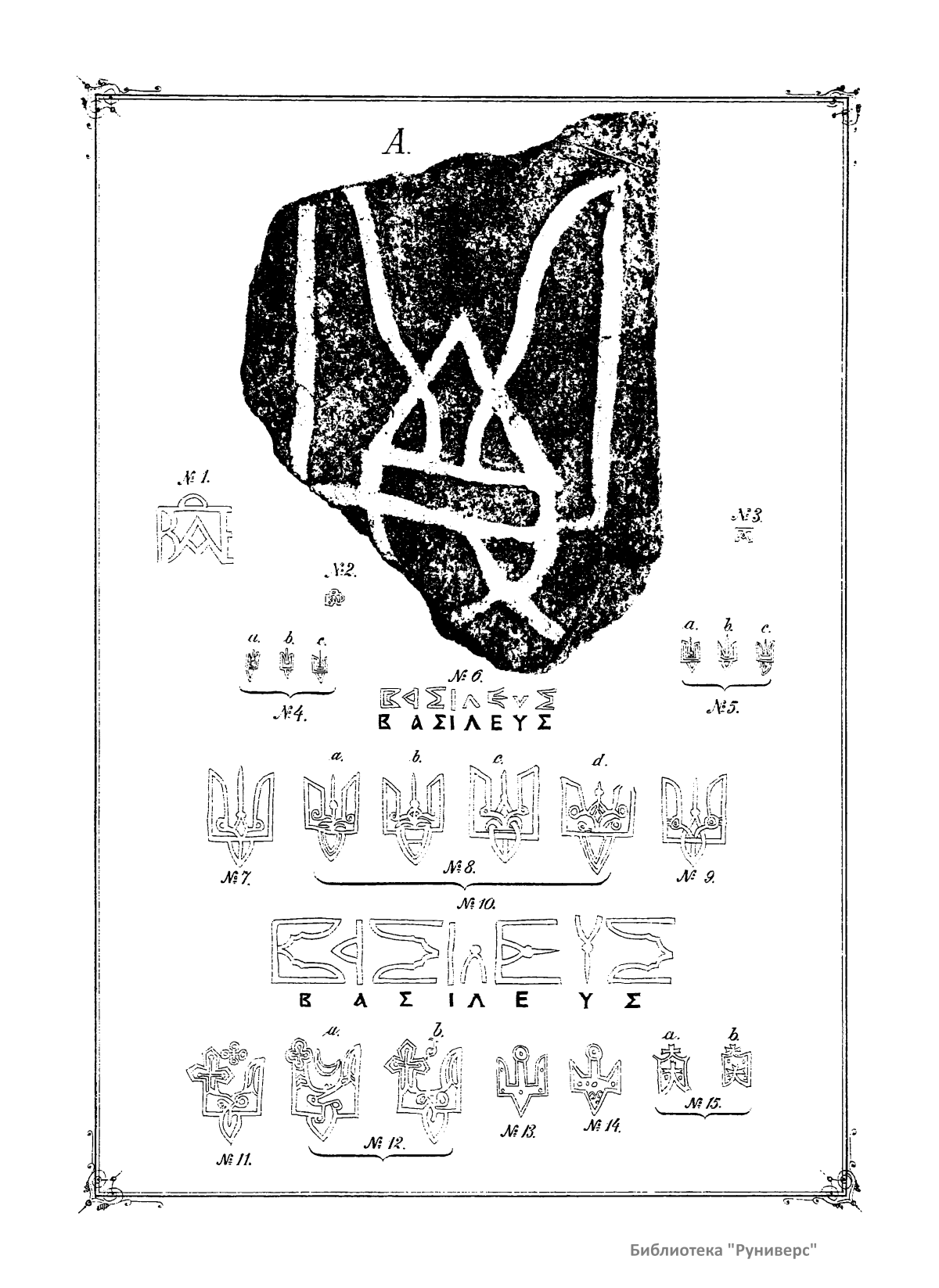 Геральдическое исследование, в котором автор отвечает на вопрос, что означает загадочный знак на монетах, приписываемых великому князю Владимиру Святому. Сделать вывод ему помогают результаты раскопок в усадьбе Г. Петровского в 1907 г., когда был обнаружен кусок изразца с начертаниями своеобразной фигуры, аналогичной изображению на монетах.