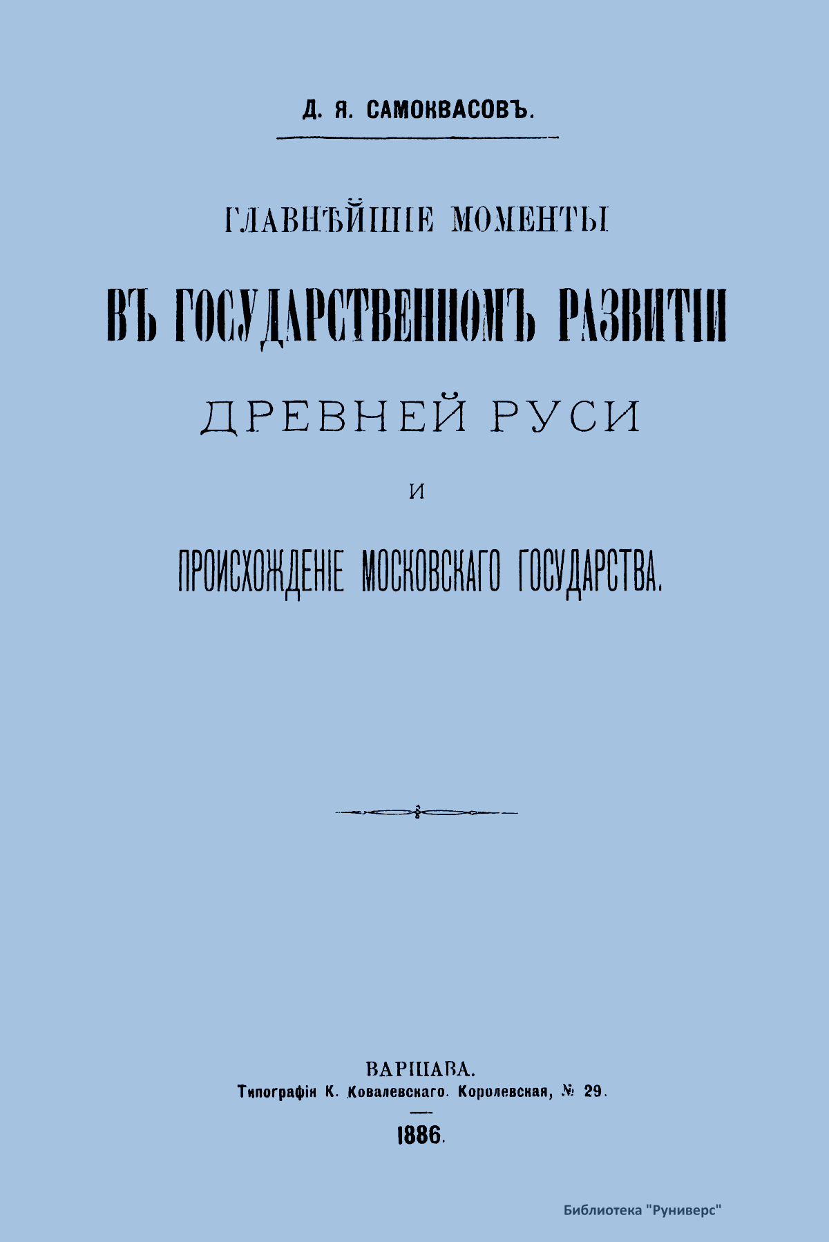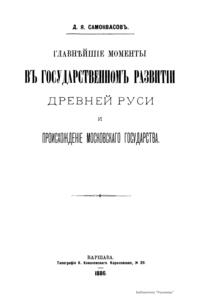 В книге объединены две работы юриста и археолога Самоквасова Дмитрия Яковлевича, написанные им во время службы профессором русского права в Варшавском университете: «Главнейшие моменты в государственном развитии Древней Руси» и «Происхождение Московского государства (история порядка преемства великокняжеской власти в Московском государстве)».