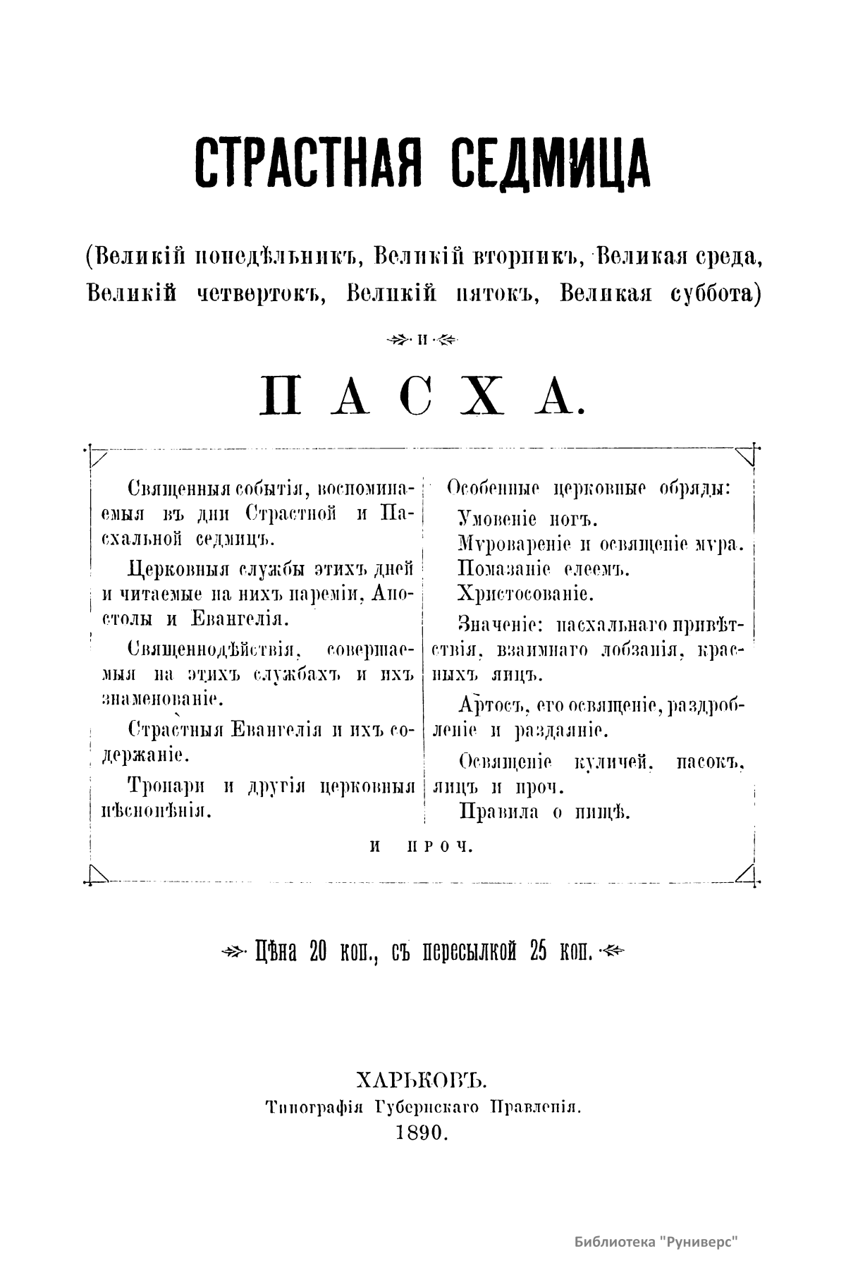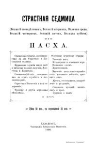 Страстная седмица – последняя неделя перед праздником Пасхи (воскресение Христа) – посвящена воспоминанию последних дней земной жизни Иисуса Христа, его страданий, смерти и погребения. Небольшое популярное издание описывает: священные события, вспоминаемые в дни Страстной и Пасхальной седмиц; церковные службы этих дней и читаемые на них паремии, Апостолы и Евангелия; священнодействия, совершаемые на этих службах, и их значение; страстные Евангелия и их содержание; тропари и другие церковные песнопения; особенные церковные обряды; значение пасхального приветствия, взаимного лобзания, красных яиц; артос, его освящение, раздробление и раздачу; освящение куличей, пасох и яиц; правила о пище.