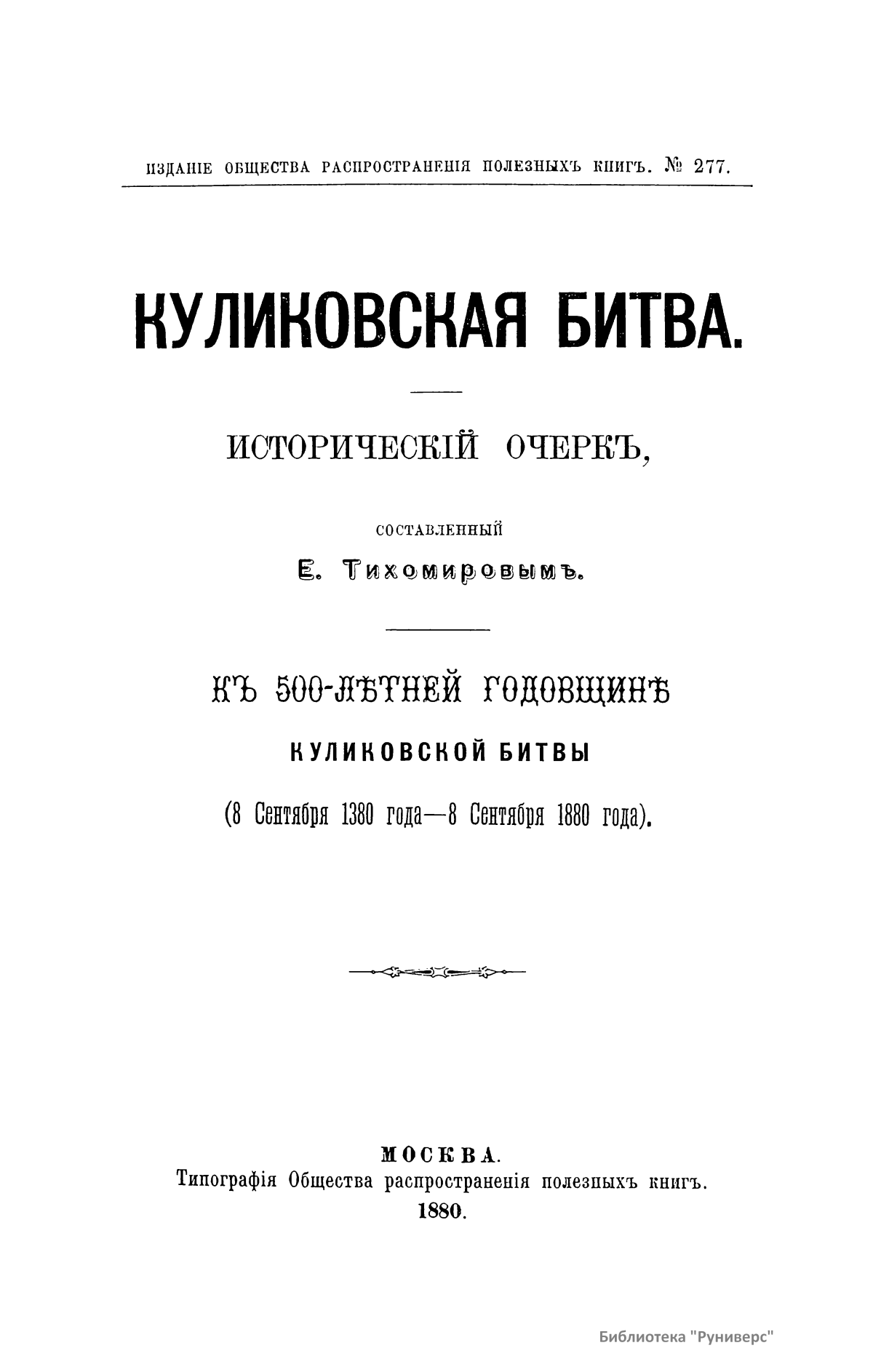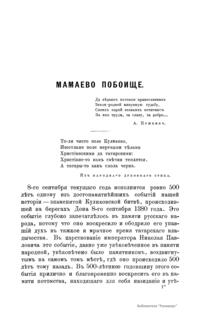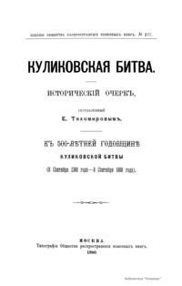 Популярное издание общества распространения полезных книг к 500-летней годовщине Куликовской битвы. Куликовская битва – битва русских полков во главе с Дмитрием Донским и монголо-татарских войск под началом Мамая 8 сентября 1380 г. на Куликовом поле (между реками Непрядвой и Доном). Завершилась разгромом монголо-татар. Явилась началом освобождения русского и других народов от монголо-татарского ига.