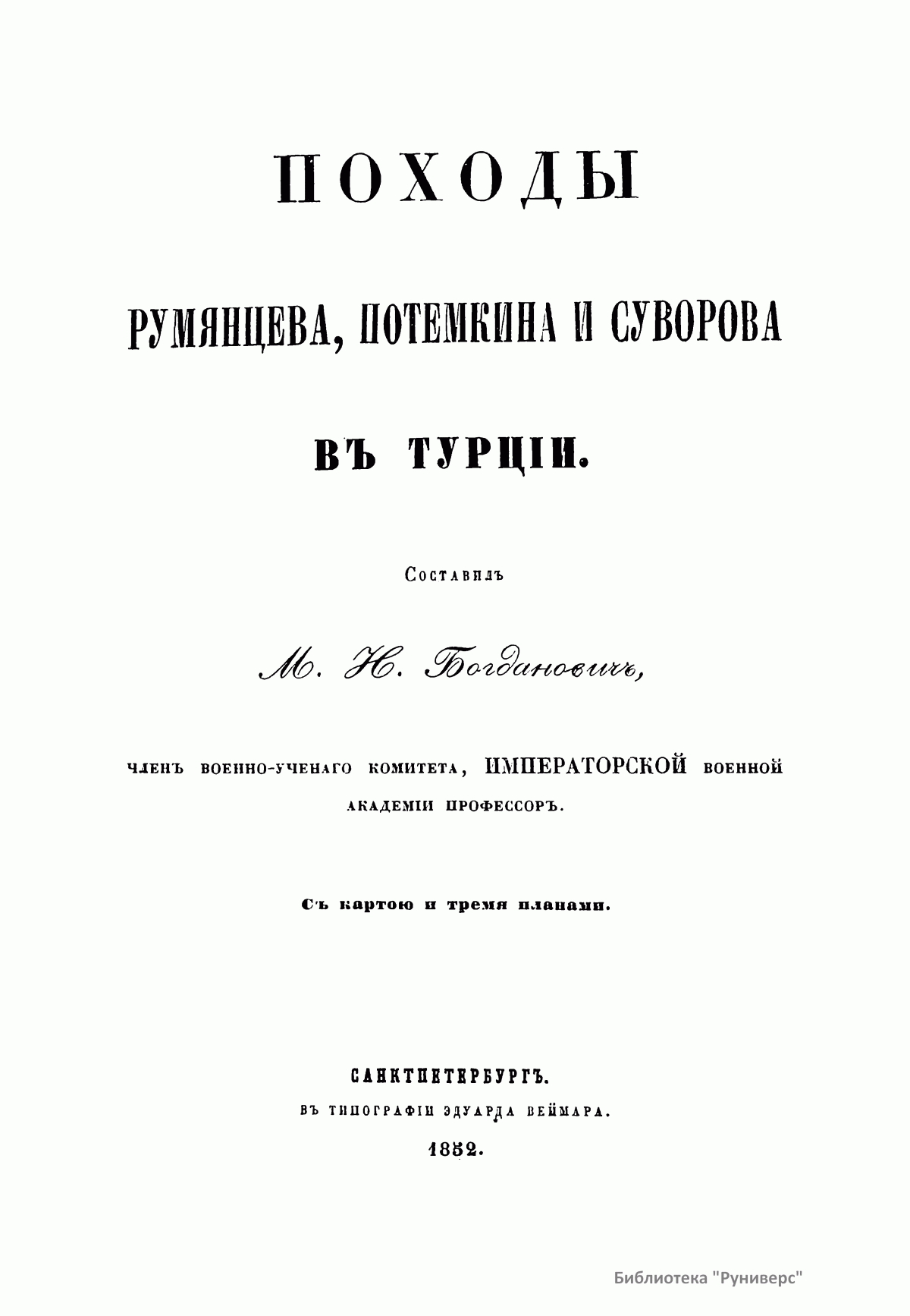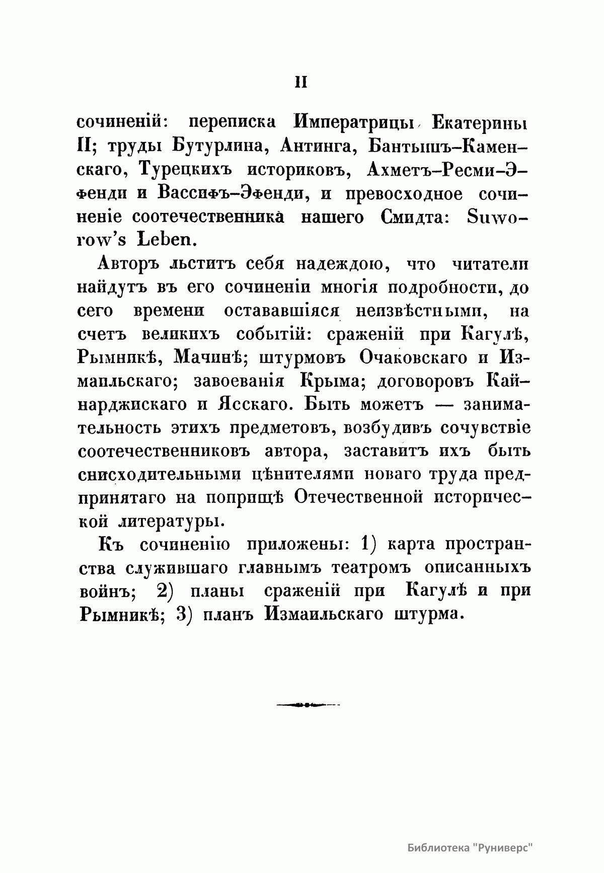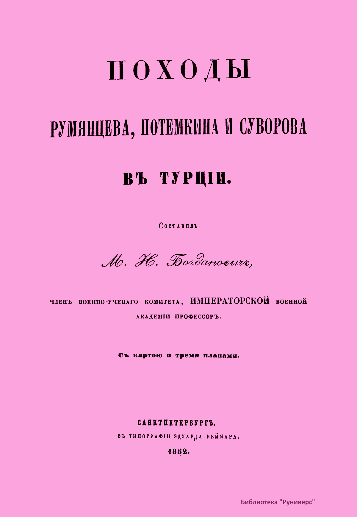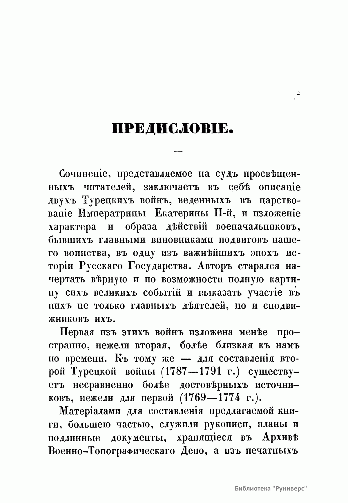 В настоящем сочинении подробно описаны две русско-турецкие войны в царствование императрицы Екатерины II (1769 – 1774; 1787 – 1791). К изданию прилагаются: карта пространства, служившего главным театром описанных войн; планы сражений при Кагуле и Рымнике; план Измаильского штурма. Потемкин Григорий Александрович (1739 – 1791) – русский государственный и военный деятель, генерал-фельдмаршал, организатор дворцового переворота 1762 г., фаворит и ближайший помощник Екатерины II. Способствовал освоению Северного Причерноморья, руководил строительством Черноморского флота. После присоединения Крыма получил титул светлейшего князя Таврического. Главнокомандующий русской армией в русско-турецкой войне 1787 – 1791 гг. Румянцев-Задунайский Петр Александрович (1725 – 1796) – граф (1744), русский полководец, генерал-фельдмаршал (1770). В Семилетней войне овладел крепостью Кольберг (Колобжег). С 1764 г. – президент Малороссийской коллегии. В русско-турецкой войне 1768 – 1774 гг. одержал победы при Рябой Могиле, Ларге и Кагуле (1770). Впервые применил сочетание каре, колонн и легких батальонов, положив начало зарождению новой тактики колонн и рассыпного строя. Имеет военно-теоретические работы. Суворов Александр Васильевич (1729 или 1730 – 1800), граф Рымникский (1789), князь Италийский (1799), русский полководец, генералиссимус (1799). Начал службу капралом в 1748 г. Участник семилетней войны. Во время русско-турецких войн (1749 – 1774, 1787 – 1791) одержал победы при Козлудже (1774), Кинбурне (1787), Фокшанах (1789), Рымнике (1789) и штурмом овладел крепостью Измаил (1790). При императоре Павле I в опале. В 1799 г. блестяще провел Итальянский и Швейцарские походы, разбив французские войска на рр. Адда и Требия и при Нови, а затем перешел швейцарские Альпы и вышел из окружения. Автор военно-теоретических работ. Создал оригинальную и прогрессивную систему взглядов на способы ведения войны и боя, воспитания и обучения войск, во многом опередив свое время. Стратегия Суворова носила наступательный характер, ставила главной задачей полный разгром противника в полевом сражении. Развил тактику колонн и рассыпного строя. Не проиграл ни одного сражения.