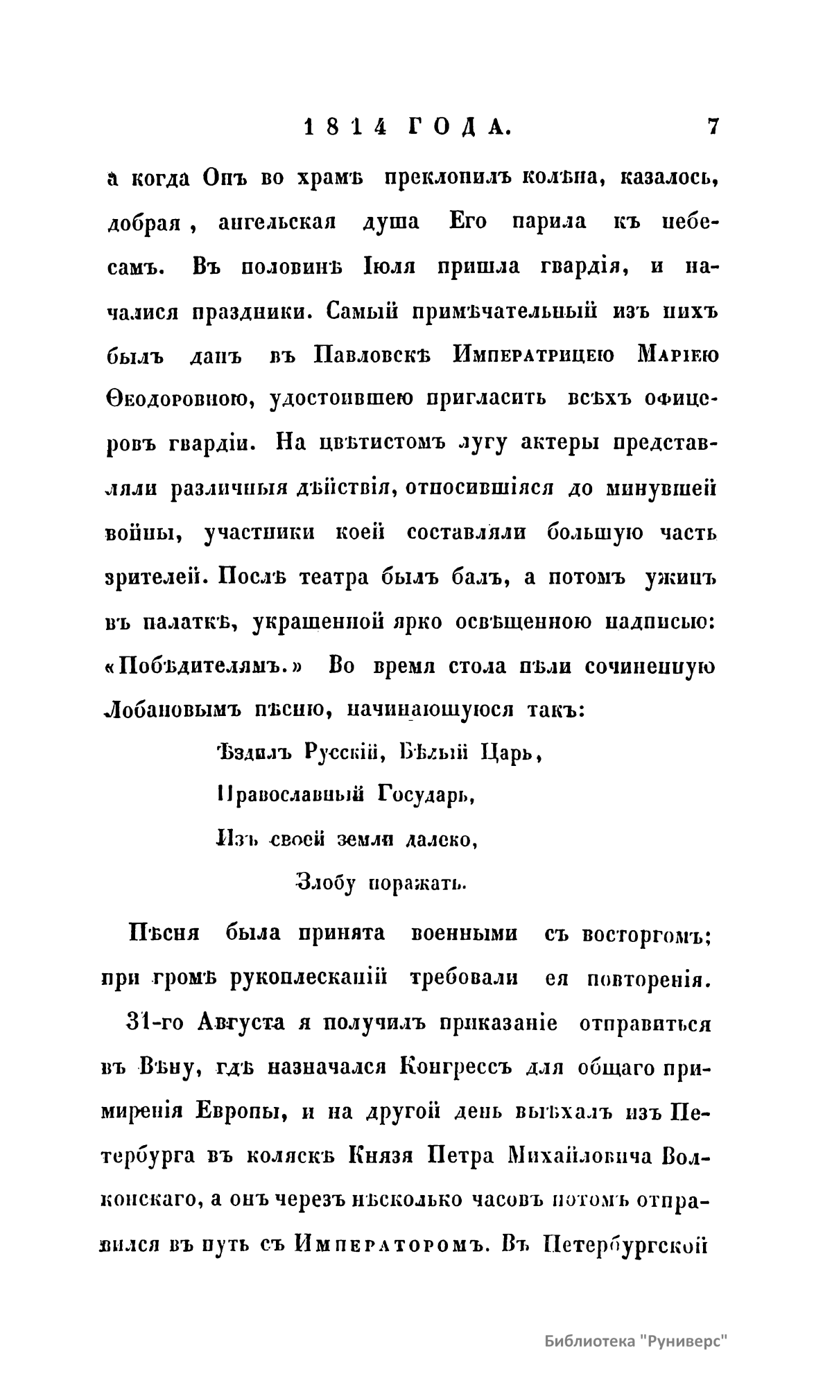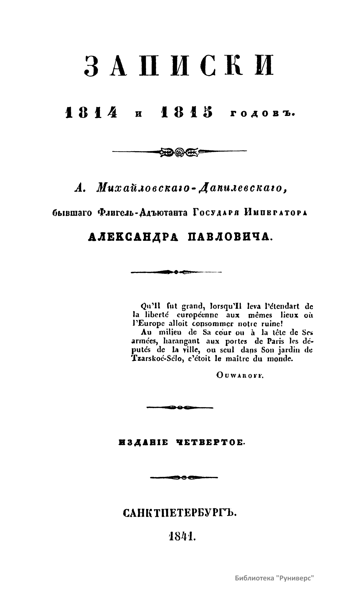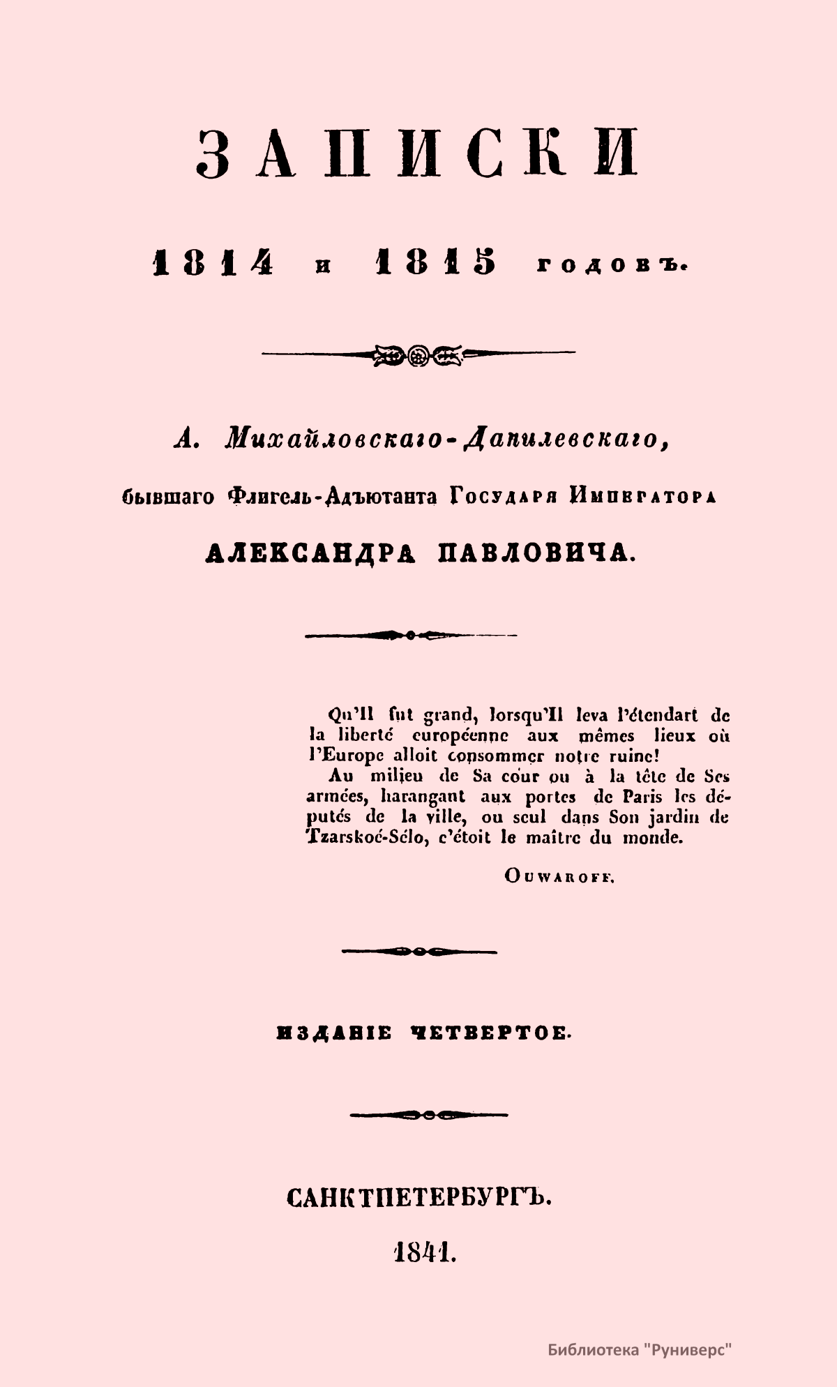 В книге опубликовано сочинение флигель-адъютанта Александра I А. Михайловского-Данилевского. Эти воспоминания выходили отдельными книгами в 1831 г.: «