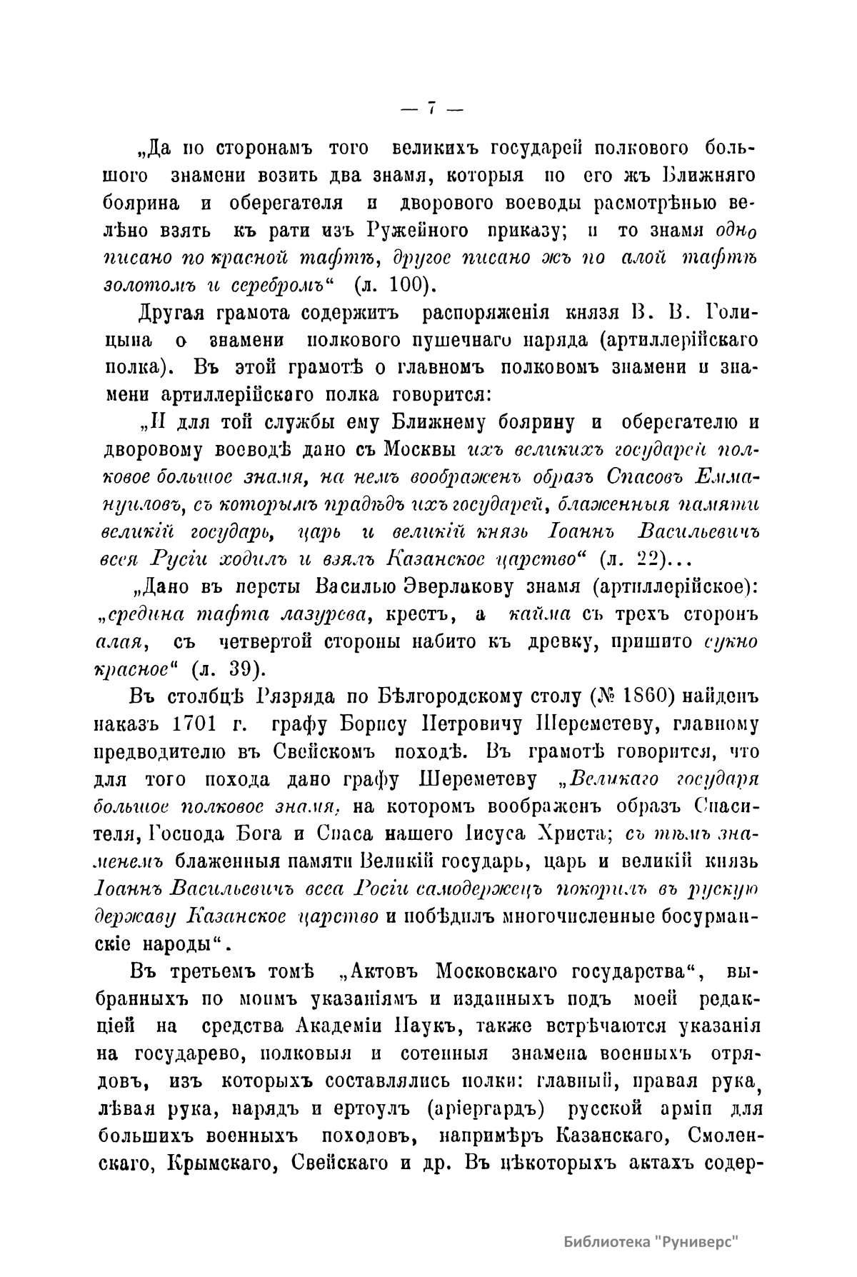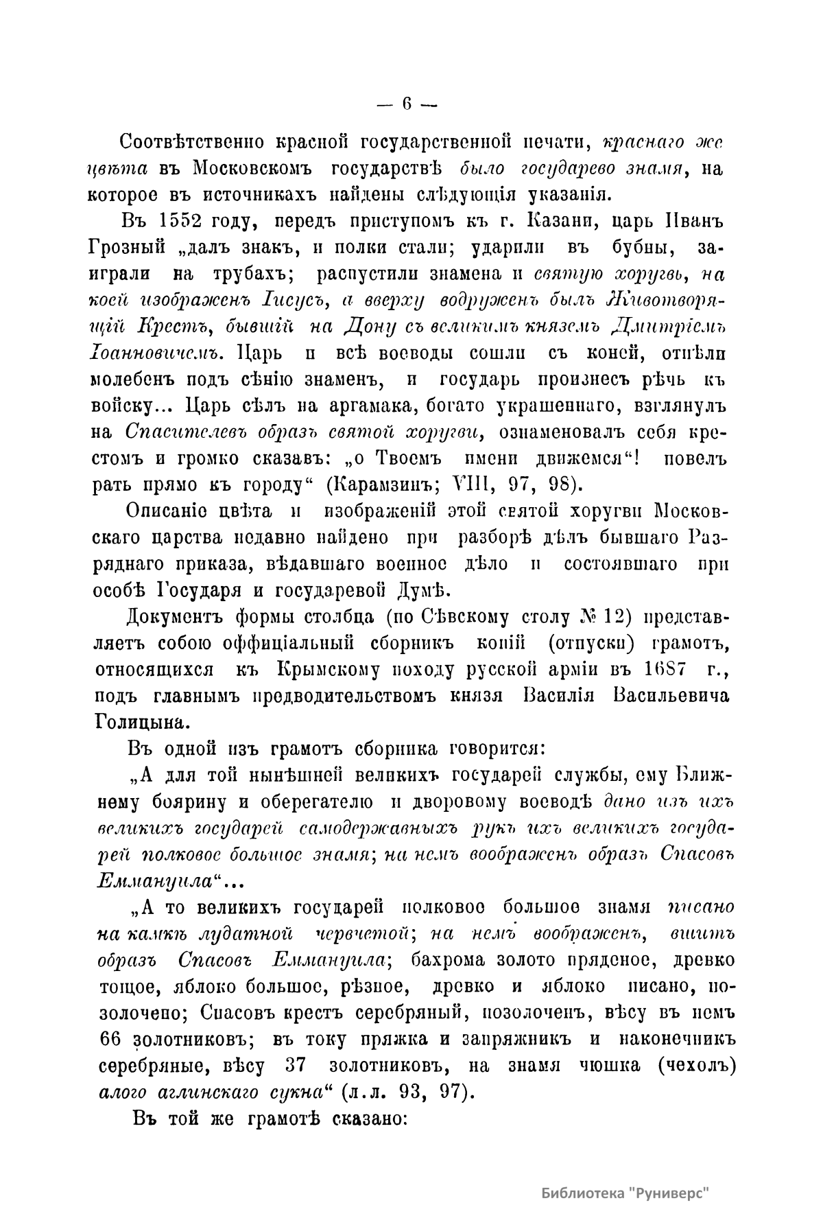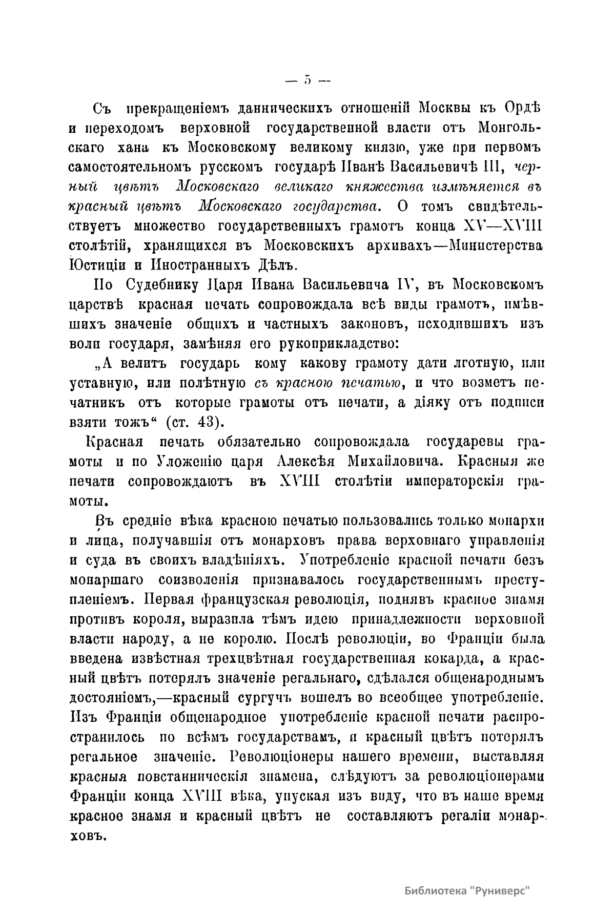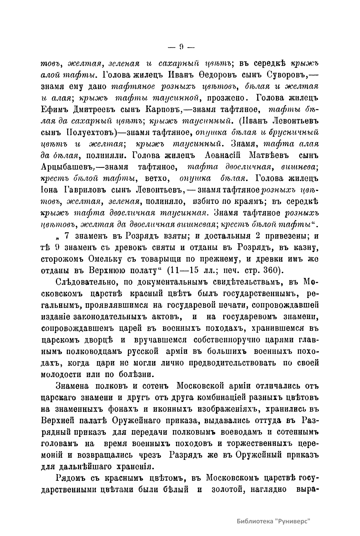 Государственный цвет проявлялся в древности на военных знаменах-стягах, хоругвях-штандартах и в печатях и гербах на государственных грамотах. Автор, проработав документы Московского архива министерства юстиции, делает вывод о роли алого, черного, красного, белого и золотого цвета.