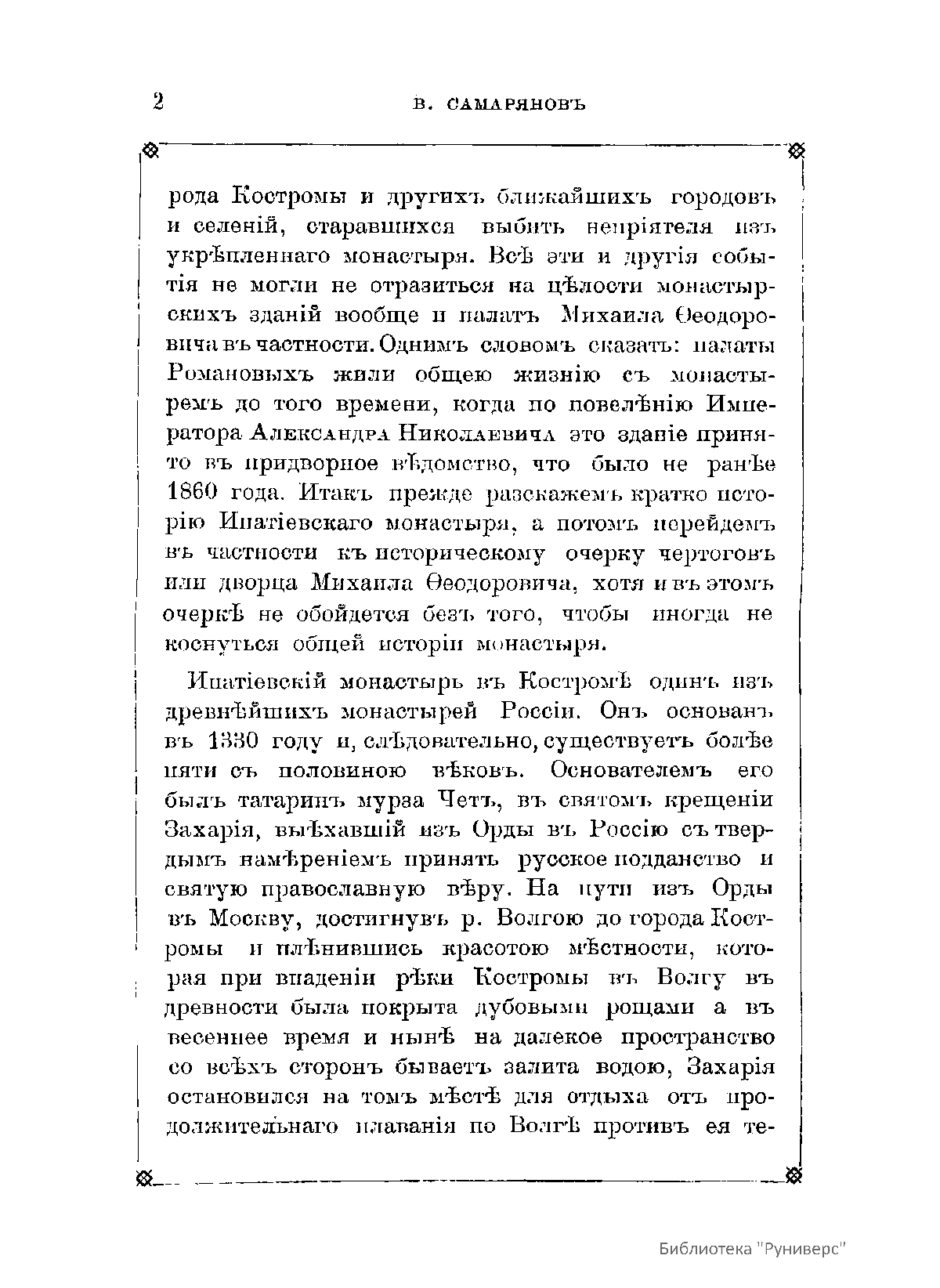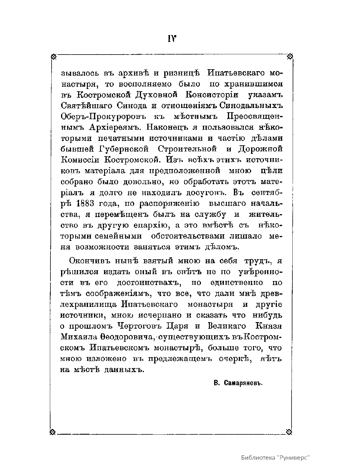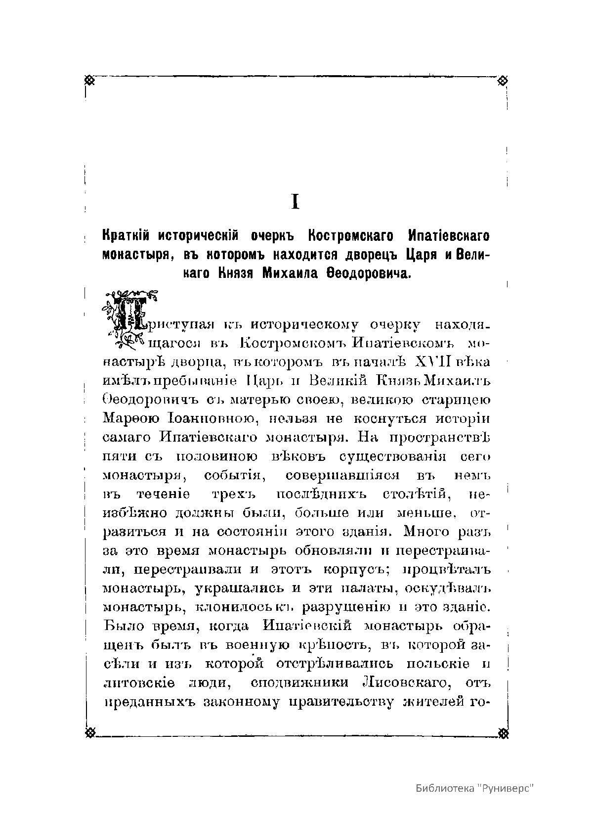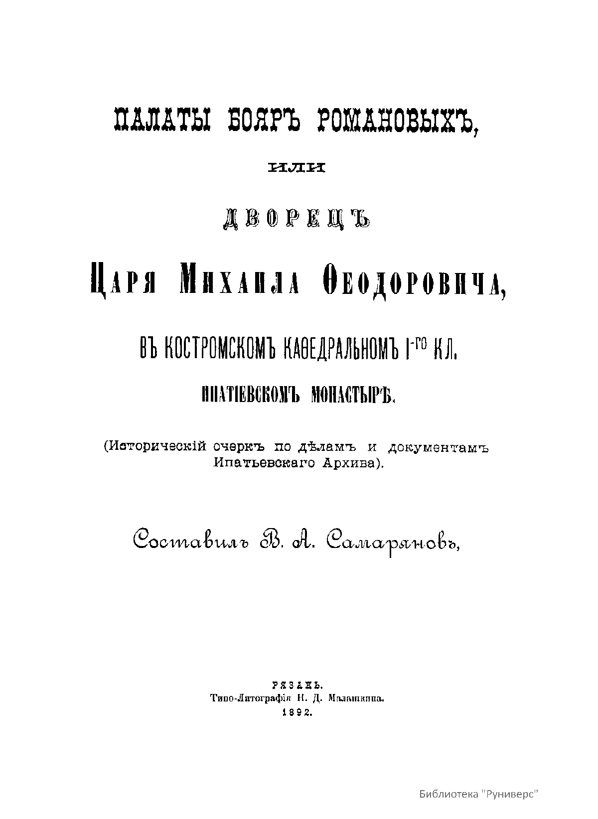 Исторический очерк по делам и документам Ипатьевского архива. В издании представлены: краткий исторический очерк костромского Ипатьевского монастыря (10); сообщение о месте, занимаемом палатами Романовых в монастыре, когда и кем они построены, кто занимал это здание до и после 1613 г. (19); сообщение о состоянии наместнических келий в XVII и XVIII вв. (28); о наместнических кельях в начале XIX в., которые принимают название царских чертогов и дворца царя и великого князя Михаила Федоровича, и о ряде мер со стороны епархиального начальства к охранению чертогов от разрушения (41); о следах особого внимания членов царствующего Дома к келиям Михаила Федоровича в Ипатьевском монастыре по делам и документам с XVII по XIX в. (67); о посещении Ипатьевского монастыря и палат Михаила Федоровича Высочайшими особами царствующего в России Дома. К изданию прилагаются: вид костромского Ипатьевского монастыря с восточной стороны (8); портрет Михаила Федоровича (26); портрет патриарха Филарета Никитича (80); портрет великой старицы инокини Марфы Иоанновны (82); изображение памятника костромскому крестьянину Ивану Сусанину, «за царя, спасителя веры и царство живот свой положившему» (66); план Ипатьевского монастыря 1794 – 1799 гг. и его экспликация (93); смета майора и архитектора Мичурина на исправление ветхостей в кельях наместнических 1742 г.; вид палат царя Михаила Федоровича в 1832 г. (100); различные планы палат; опись древностей Ипатьевского монастыря (104).