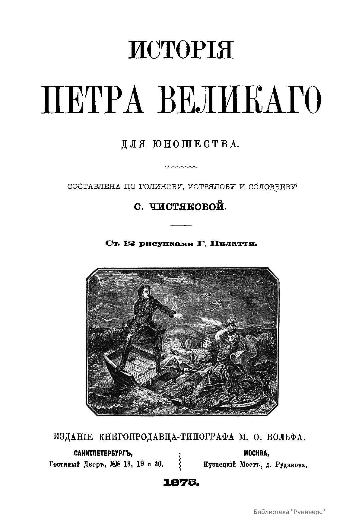 Обстоятельная история Петра Великого для юношества, составленная автором по Голикову, Устрялову и Соловьеву, с 12 рисунками Г. Пилатти: 1. Купцы с поклоном подносят подарки (21). 2. Раскольники в Грановитой палате (55). 3. Петр Великий на железном заводе (167). 4. Петр Великий на корабельной верфи в Саардаме (191). 5. Петр изучает корабельную архитектуру (211). 6. Первая морская удача в устьях Невы (293). 7. Петр Великий закладывает Санкт-Петебрург (299). 8. Осада Нарвы (323). 9. Полтавская битва (379). 10. Портрет Петра (407). 11. Петр спасает погибающих (443). 12. Кабинет в домике Петра Великого (589).