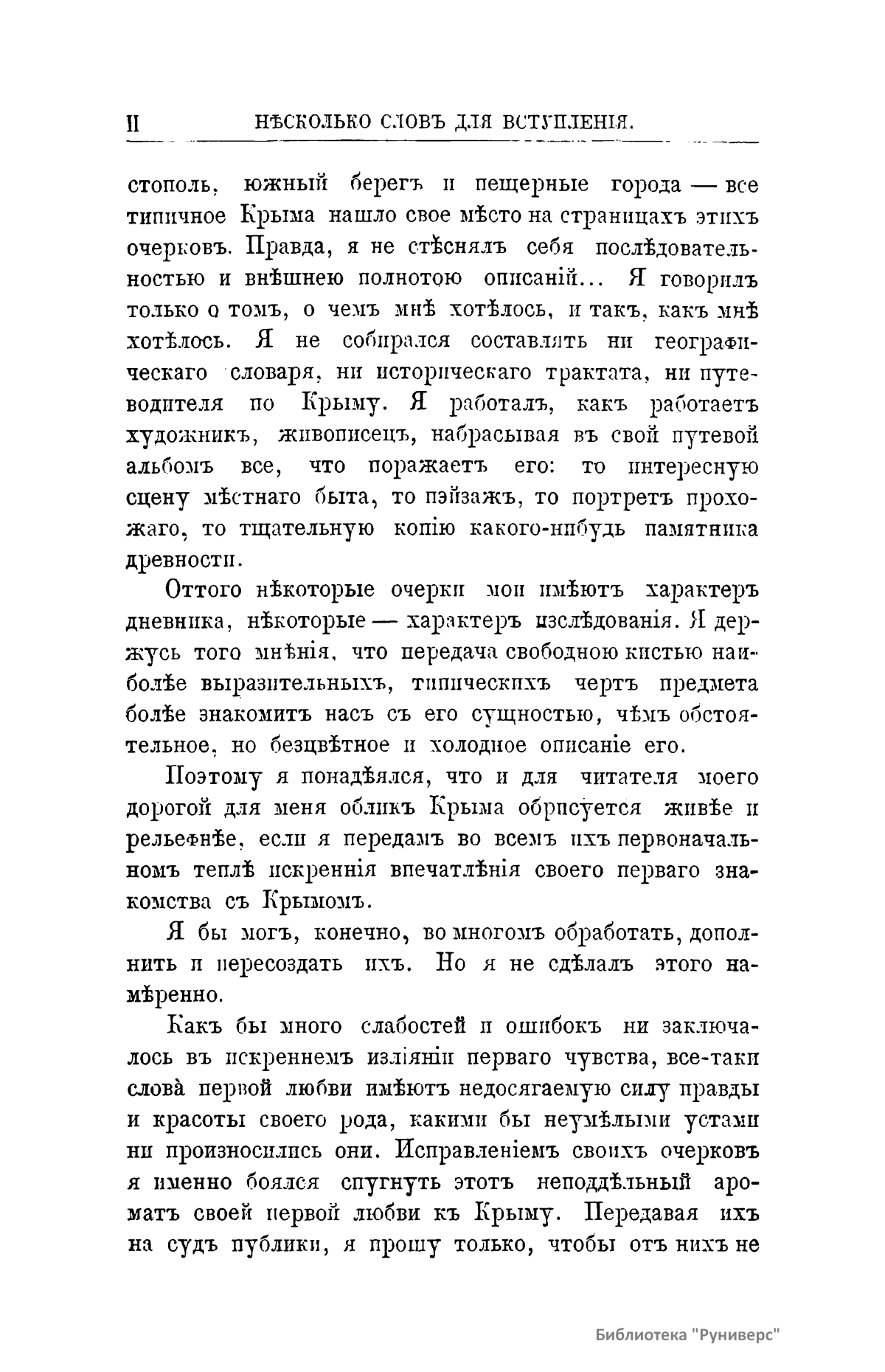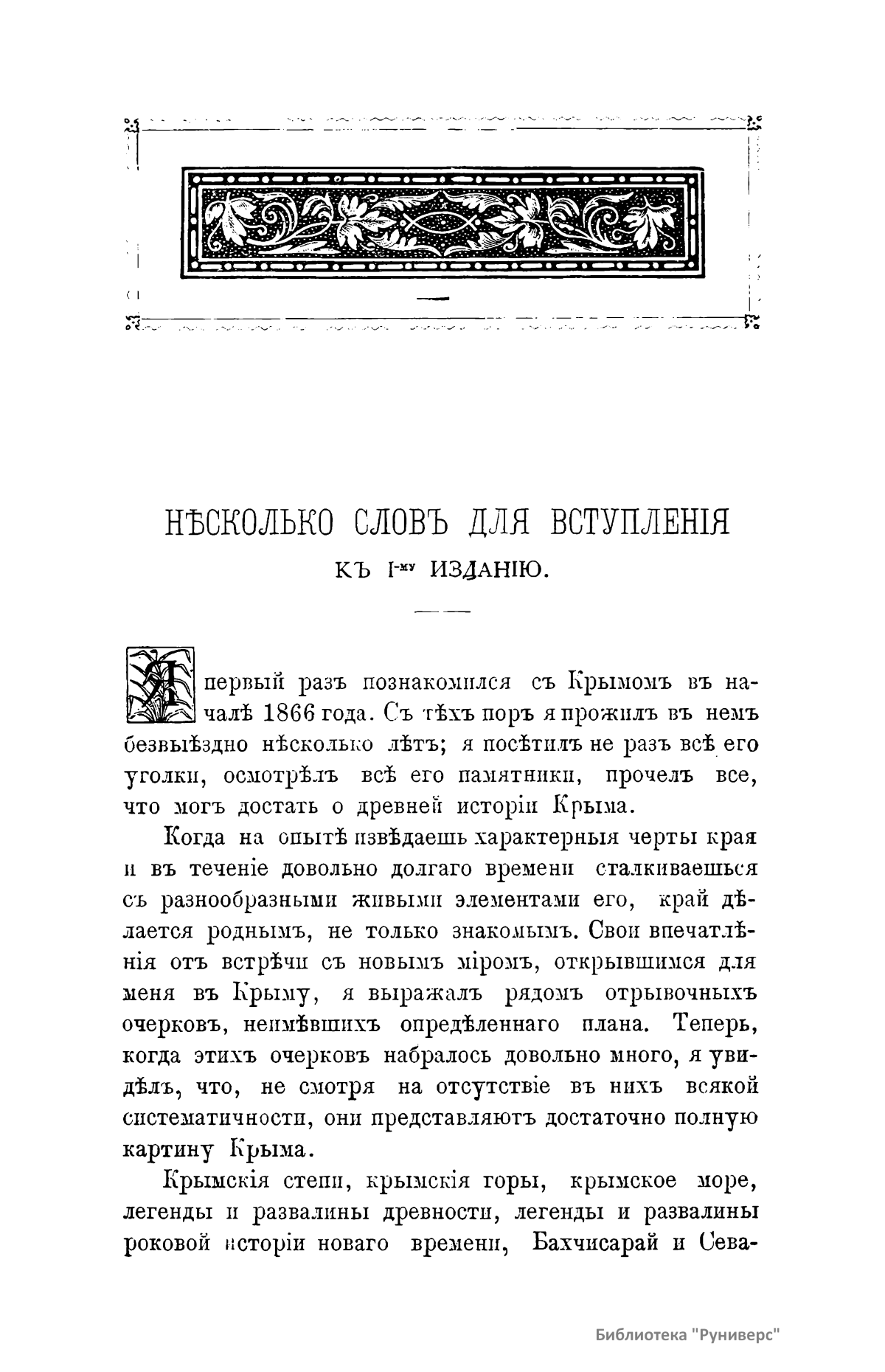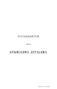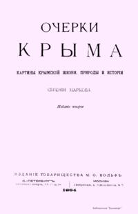 Автор описывает свои впечатления от встречи с новым миром, открывшимся для него в Крыму в 1866 г. Издание представляет собой собрание очерков. Крымские степи, крымское море, крымские горы, легенды и развалины древности, легенды и развалины истории нового времени, Бахчисарай и Севастополь, южный берег и пещерные города – все типичное Крыма нашло свое место на страницах этих очерков. Автор не стесняет себя последовательностью и внешней полнотой описания, он набрасывает в свой путевой альбом все, что поражало его, и признается в том, что лучшие дни его жизни протекли в этом чудесном краю. «Очерки» опубликованы в 1883 г., когда исполнилось сто лет со дня присоединения Крыма к России. Воспоминание об этом важном событии русской государственной истории должно, по мнению автора, побудить русского читателя ознакомиться как можно ближе с прошлым и настоящим этого очаровательного края, который вошел сто лет назад в состав русского царства как его лучшая жемчужина, по счастливому выражению великой императрицы.