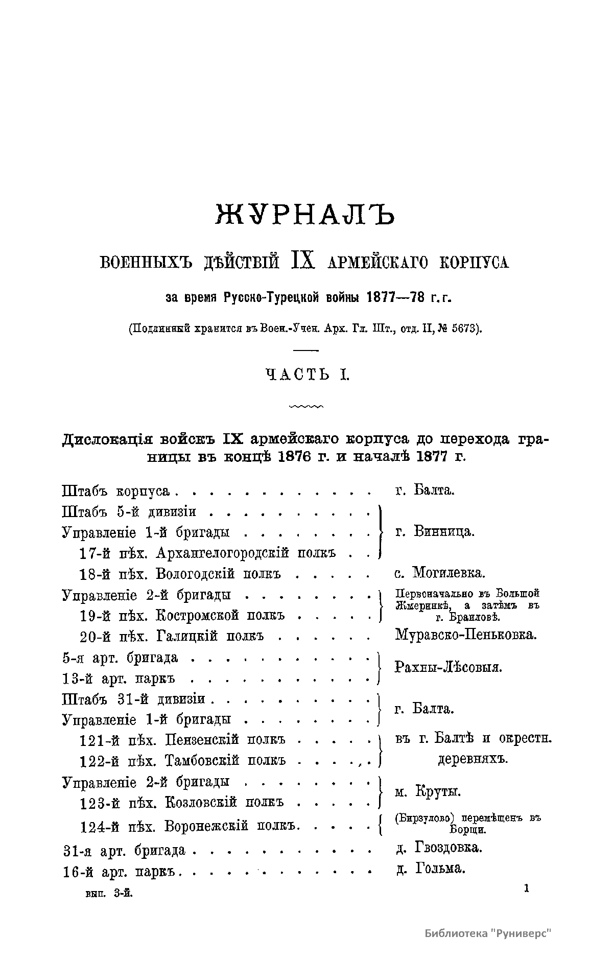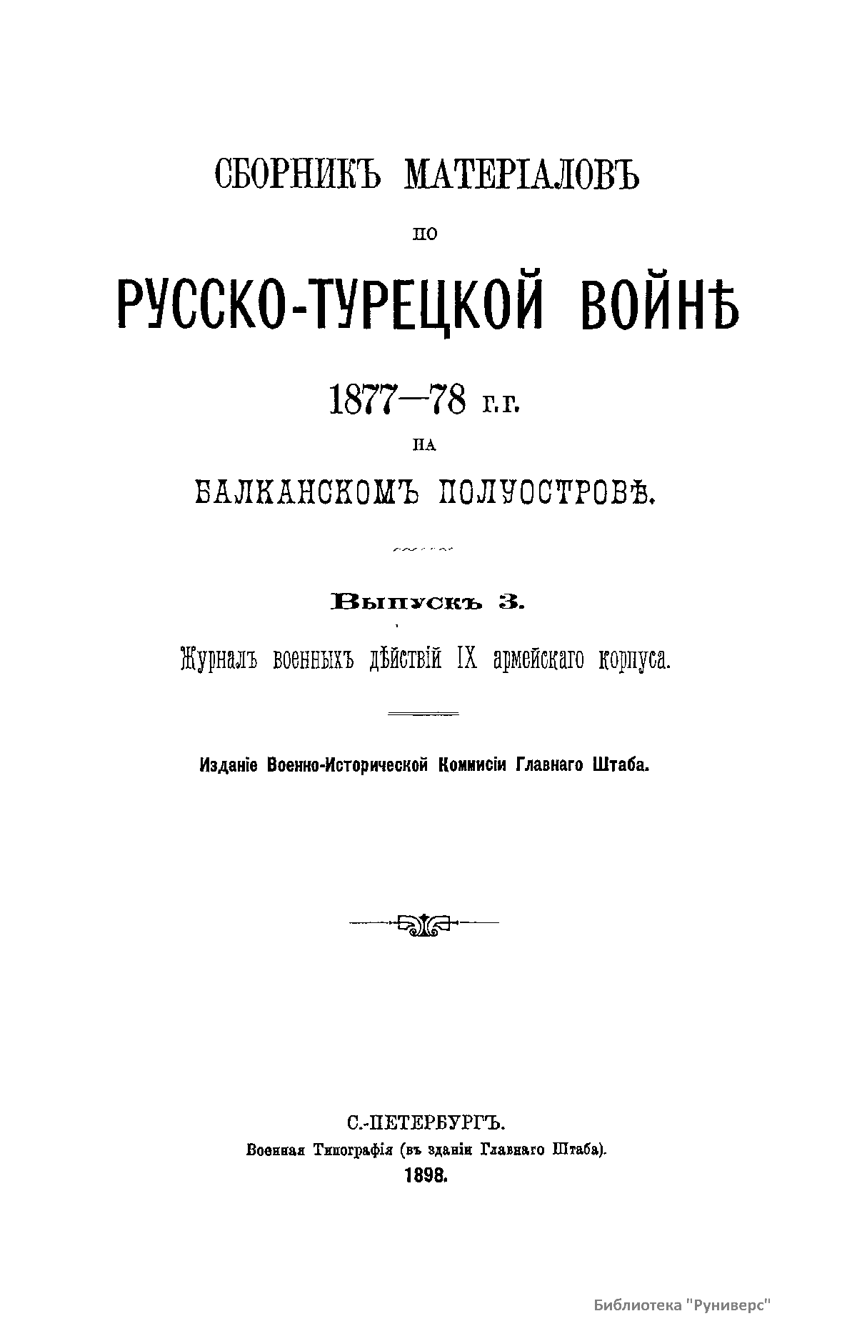 Сборникъ матерiаловъ по русско-турецкой войнѣ 1877-1878 г.г. на Балканскомъ полуостровѣ. Выпускъ 3. Журналъ военныхъ дѣйствiй IX армейскfго корпуса