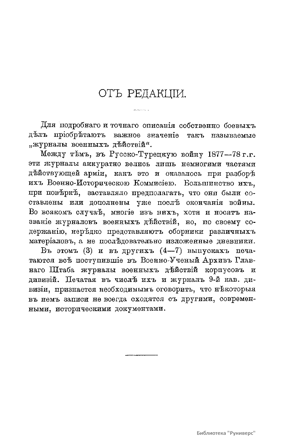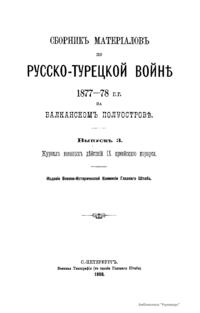 Военно-историческая комиссия Генерального штаба представляет сборник материалов по русско-турецкой войне 1877 – 1878 гг. на Балканском полуострове в 97 выпусках. Издание формирует полное представление о военных действиях и участниках этой войны. Русско-турецкая война 1877 – 1878 гг. была вызвана нежеланием Турции принять меры к улучшению положения подвластных ей христианских княжеств, обусловленному парижским трактатом 1856 г, и стремлением России укрепить свое влияние на Балканах. Способствовала освобождению народов Балканского полуострова от османского владычества. Россия объявила войну Турции 12 апреля 1877 г. Основные события: 1877 – сражение на Шипке, осада и взятие русскими войсками Плевны и Карса; 1878 – зимний переход русской армии через Балканский хребет, победы у Шипки – Шейново, Филиппополя, взятие Адрианополя. Завершилась Сан-Стефанским миром 1878 г., который обеспечил независимость балканским народам и территориальные приобретения России. Но Берлинский трактат ограничил независимость Болгарии и влияние России на Балканах.