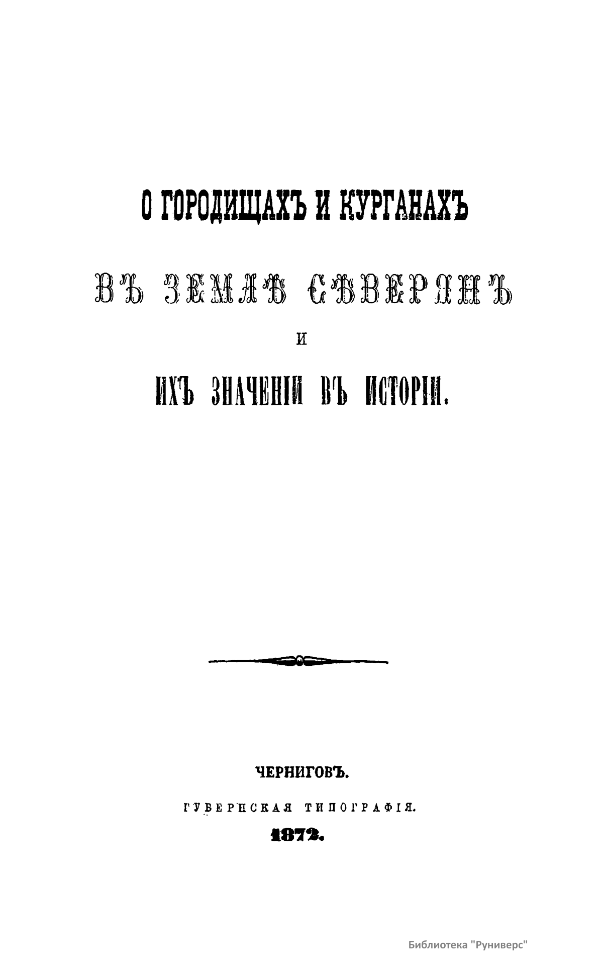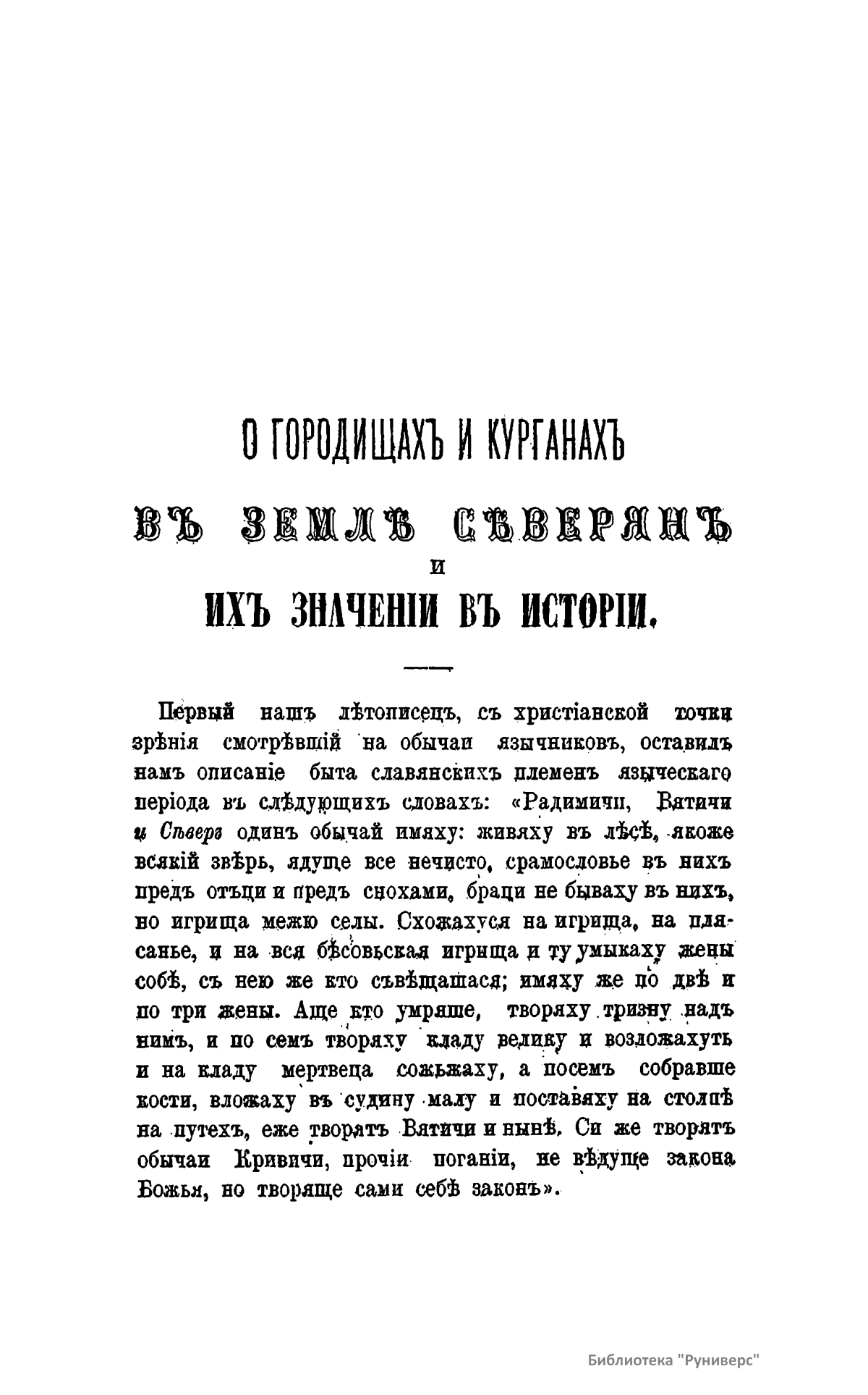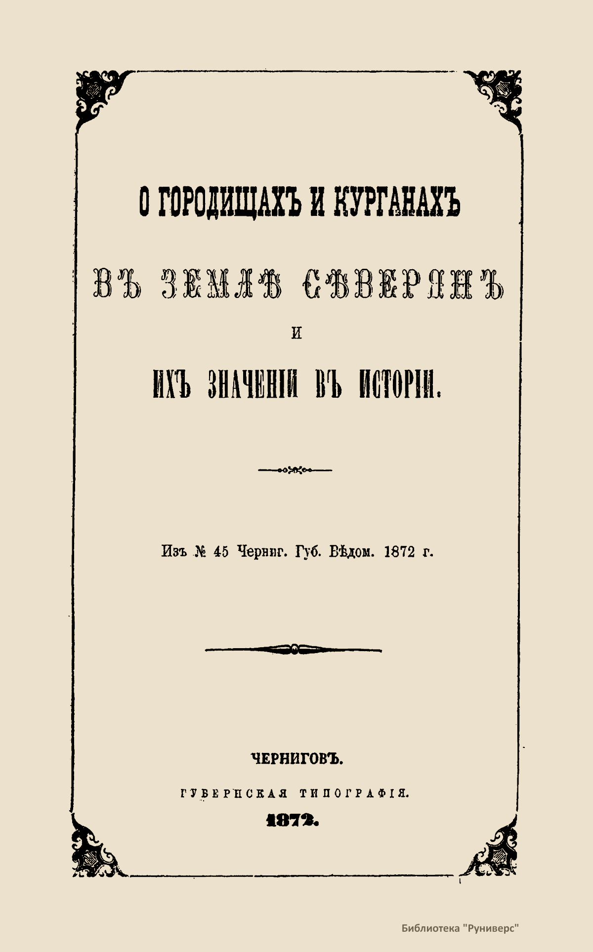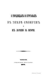 Городища и курганы – памятники жизни северян языческого периода. Автор брошюры полемизирует с Гебгарди, Шлецером, Карамзиным и другими историками, считавшими древних северян полудиким народом. Руководствуясь данными археологических раскопок, он доказывает, что северяне языческого периода – народ значительно цивилизованный, с политическими союзами, политической властью, общими обычаями, народ культурный.