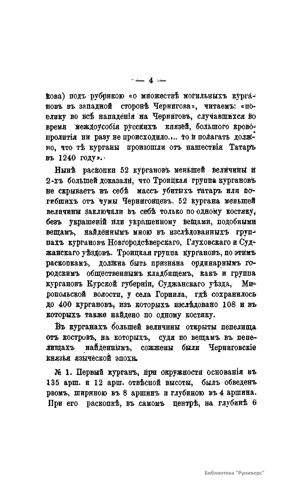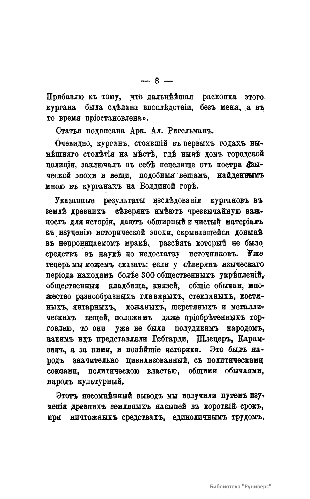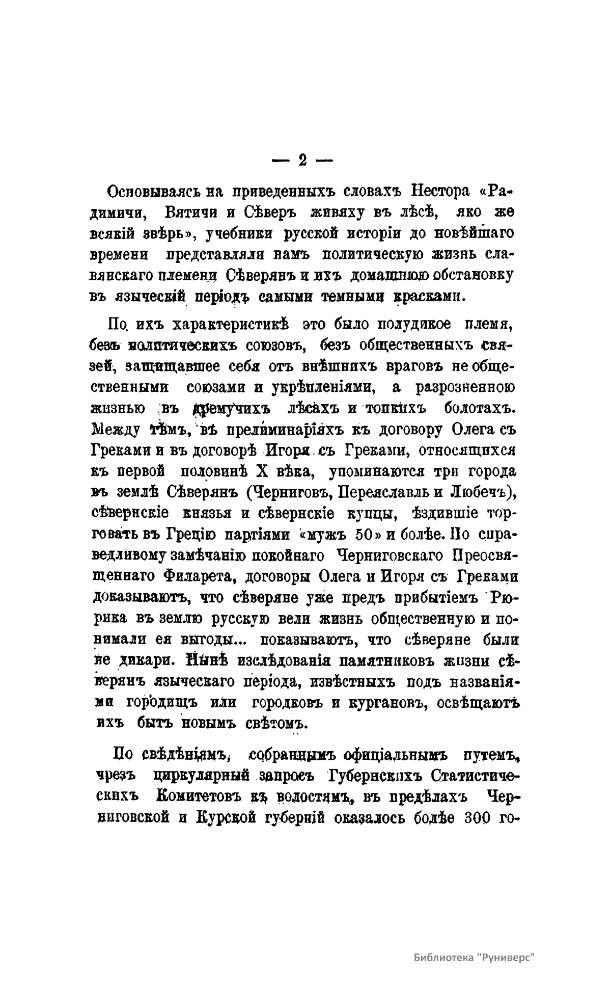 Городища и курганы – памятники жизни северян языческого периода. Автор брошюры полемизирует с Гебгарди, Шлецером, Карамзиным и другими историками, считавшими древних северян полудиким народом. Руководствуясь данными археологических раскопок, он доказывает, что северяне языческого периода – народ значительно цивилизованный, с политическими союзами, политической властью, общими обычаями, народ культурный.