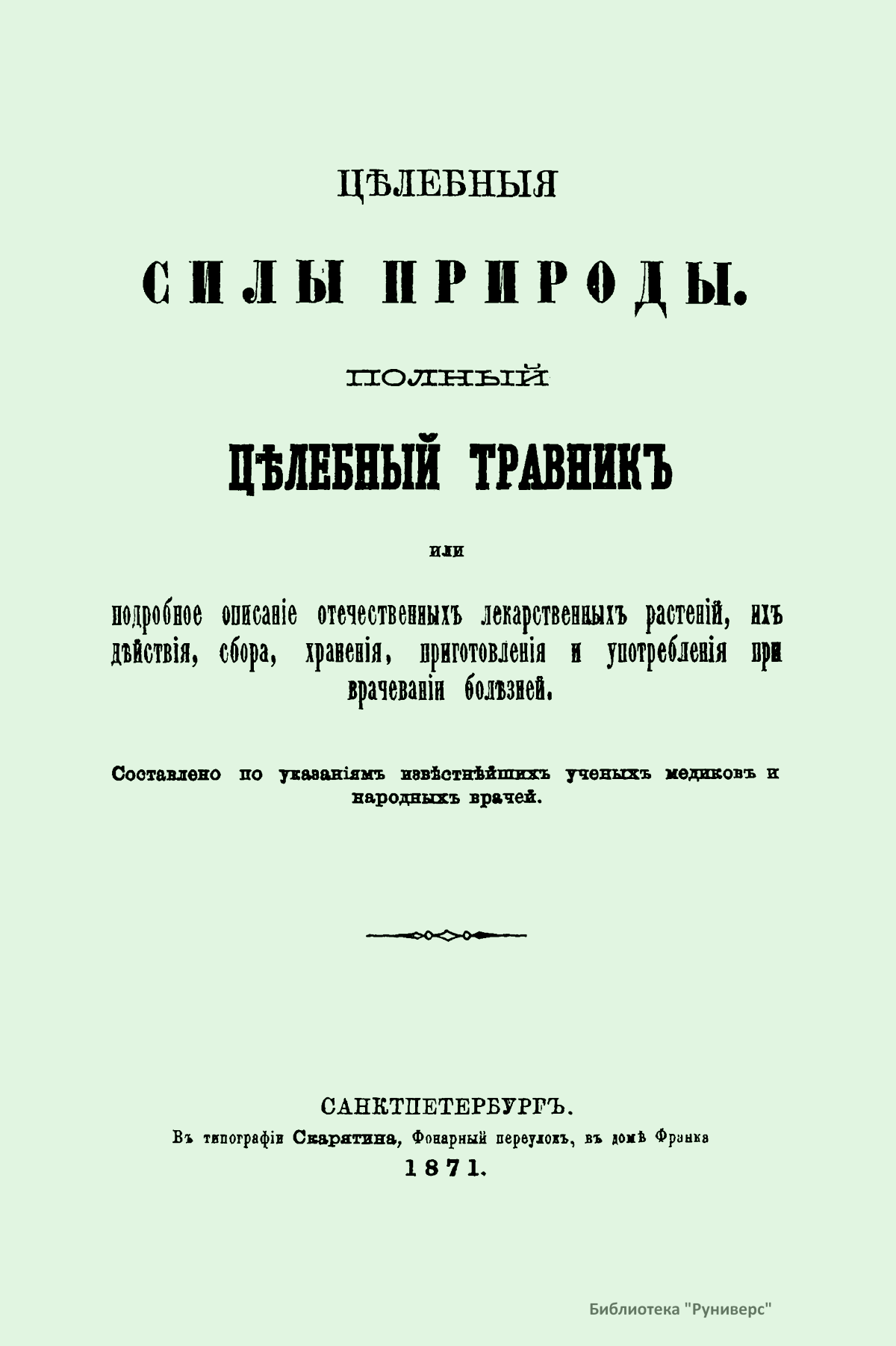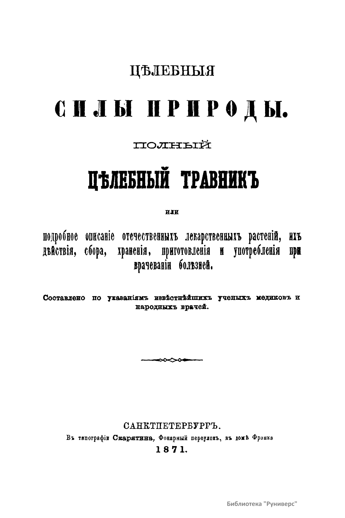 Цѣлебныя силы природы. Полный цѣлебный травникъ или подробное описанiе отечественныхъ лекарственныхъ растенiй, ихъ дѣйствiя, сбора, храненiя, приготовленiя и употребленiя при врачеванiи болѣзней