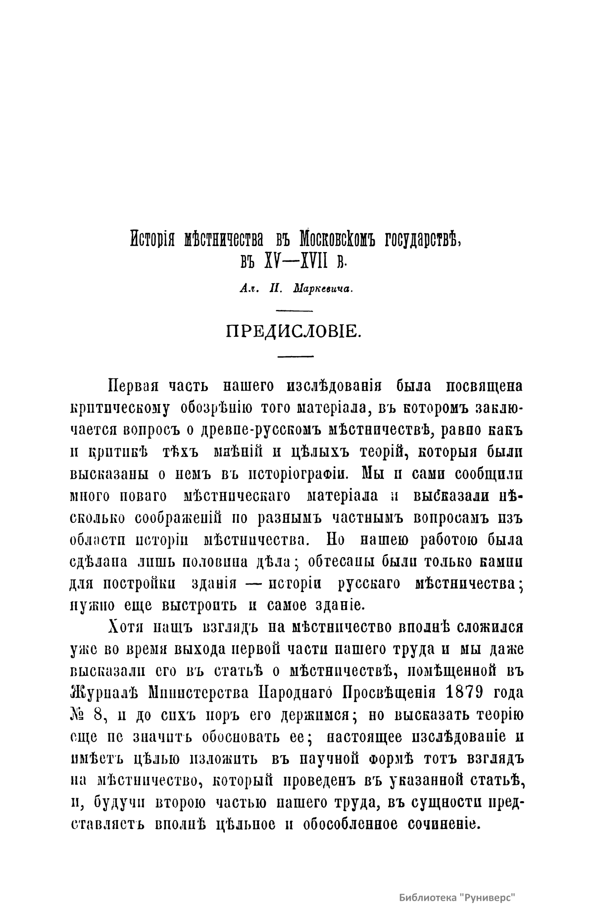 Предмет настоящего исследования – собственно местничество, существовавшее в служилых сферах Московского государства. Здесь местничество явилось вполне оригинальным институтом, даже в частных случаях встречающим себе очень редкую аналогию в жизни иных народов. Начиная изучение вопроса, автор был уверен в исторической важности местничества. Но чем более он изучал этот вопрос, тем ему становилось яснее, что он имеет дело с формами известного старшинства, которые хотя и интересны, но имеют весьма немного исторического значения. Но автор уверен, что столь малый по значению результат, купленный ценой большого труда, не является потерей в науке. Местничество – система иерархии в Русском государстве в 15-17 вв. Название произошло от обычая считаться «местами» на службе и за государевым столом. Тот, кто считал свое происхождение более древним, благородным и знатным либо личные свои заслуги значительными, занимал место ближе к царю и, соответственно, претендовал на более высокую должность в войске или в гражданской администрации. Было ликвидировано решением земского собора 1682 г.