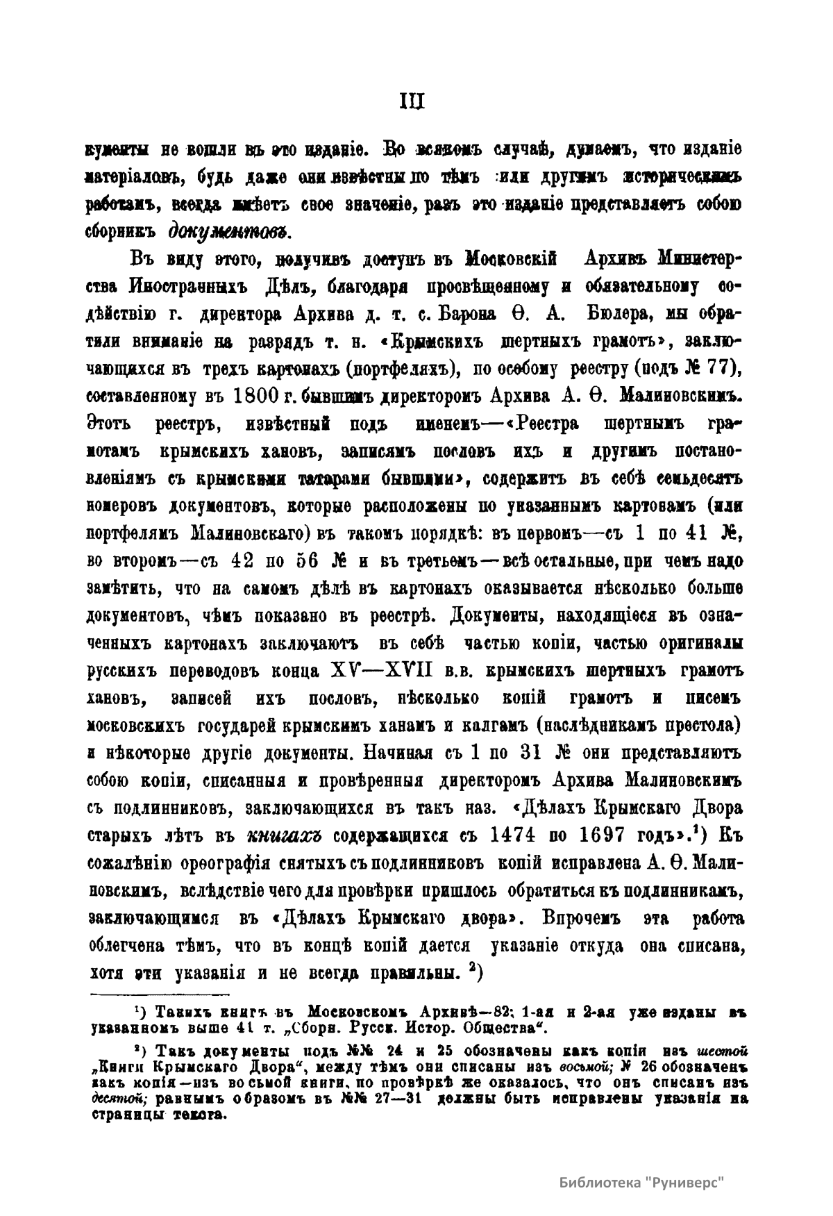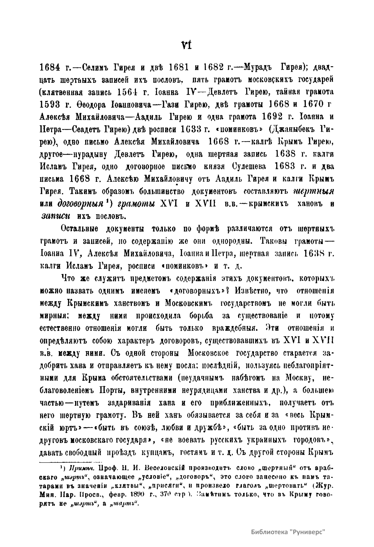 В настоящем издании опубликованы памятники дипломатических сношений Крымского ханства с Московским государством в XVI и XVII вв., хранившиеся в Московском главном архиве министерства иностранных дел. Большинство документов составляют шертные, или договорные, грамоты крымских ханов и записи их послов. Отношения между Крымским ханством и Московским государством не были мирные. Эти отношения и определяют характер договоров. С одной стороны, Московское государство старается задобрить хана и отправляет к нему посла, который, пользуясь неблагоприятными для Крыма обстоятельствами, а большей частью путем задаривания хана и его приближенных, получает от него шертную грамоту. В ней хан обязывается за себя и «за весь крымский юрт» «быть в союзе, любви и дружбе», «быть заодно против недругов московского государя», «не воевать русских украинных городов», «давать свободный проезд купцам» и т.д. С другой стороны, Крым дает шерт только на время, чтобы усыпить внимание врага или выждать более благоприятное время для враждебных действий, за которыми должен наступить новый договор и новые подарки. Таким образом главным предметом переговоров враждующих соседей была торговля, благодаря которой памятники дипломатических сношений Крыма с Москвой приобретают своеобразный характер, отличающий их от дипломатических документов других государств.