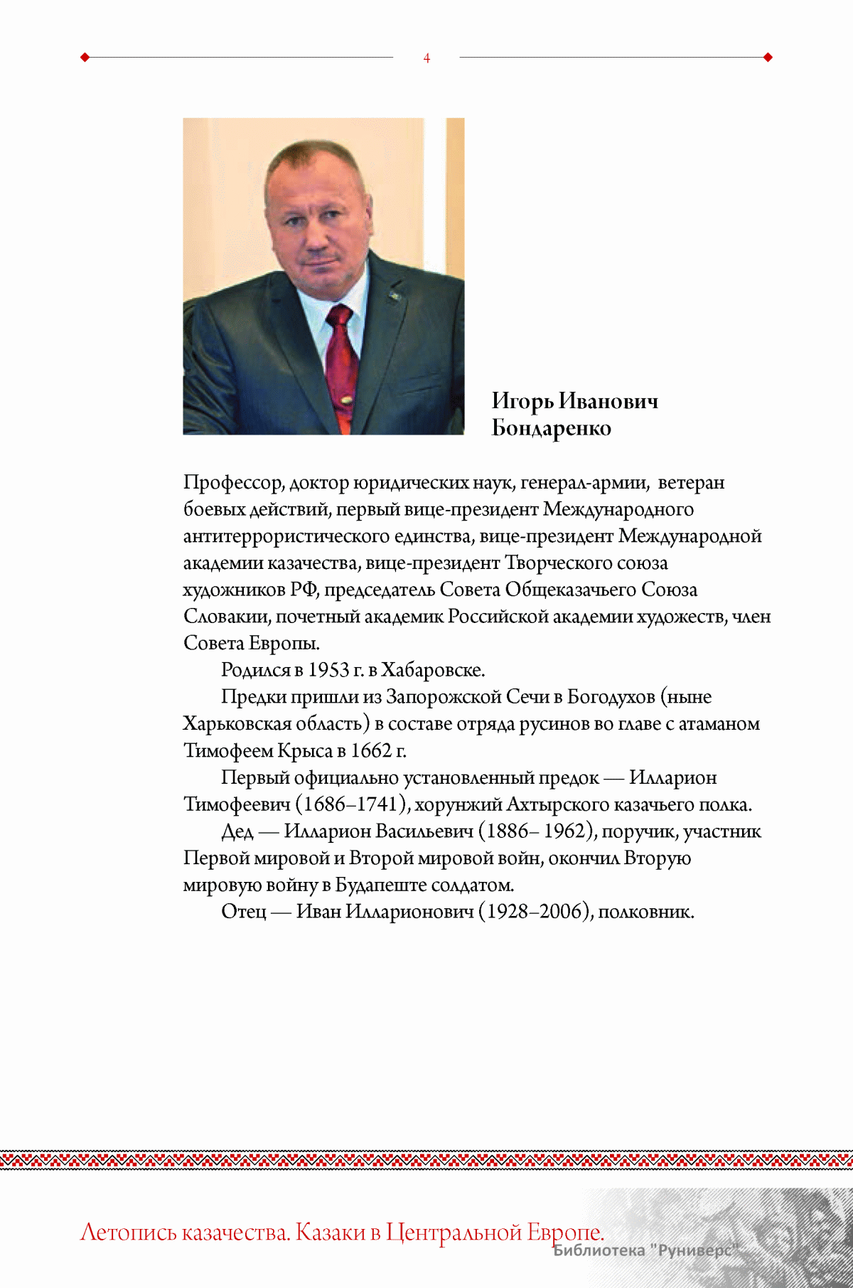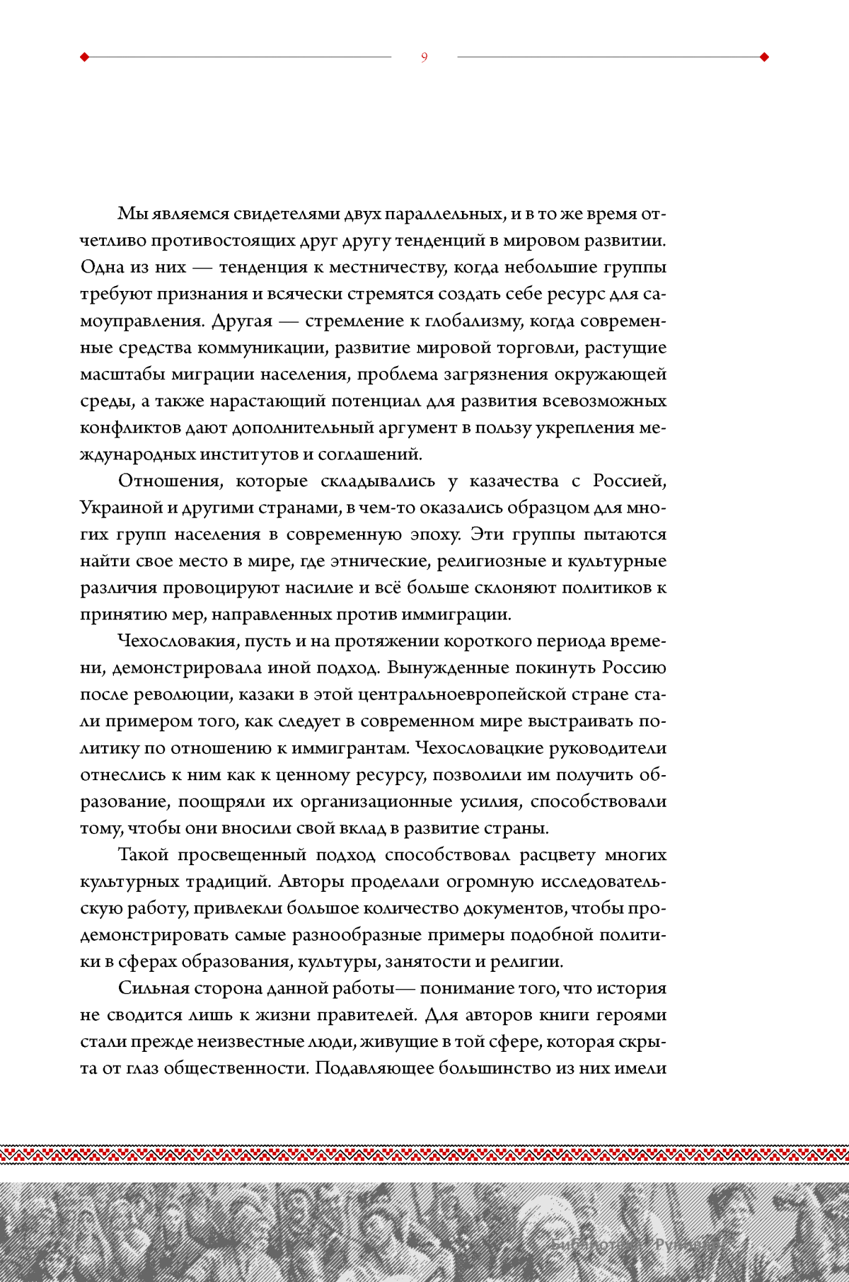 История казачества полна славных страниц побед и беззаветного служения Отечеству. В книге профессора И.И.Бондаренко и профессора И.Долейши на основе архивных документов и свидетельств очевидцев повествуется о пребывании казаков в Центральной Европе. Еще в середине XVIII века жители этой части Европы впервые познакомились с казаками, оказавшими неоценимую помощь монархам европейских стран в разрешении многочисленных споров и конфликтов того времени. Казаки в те далекие времена, как это подчеркивается в представленном исследовании, представляли собой нечто неведомое и даже пугающее, поскольку европейцы практически никогда ранее с ними не сталкивались и не имели ровно никакого представления о них. Однако храбрость, благородство и мужество лихих наездников снискали им уважение. В книге рассказывается и о трагическом и малоизученном периоде пребывания казаков в вынужденной эмиграции, вызванной перипетиями Октябрьской революции 1917 г. и последовавшей вслед за ней жестокой Гражданской войны в России. Буквально по отдельным фрагментам воссоздается общая картина жизни и быта казаков в непривычной для них обстановке. Немаловажное внимание уделено и периоду Второй мировой войны и не только массовым подвигам казаков, которые в составе Красной армии, спасли Европу от «чумы ХХ-го века» — фашизма, но и тем, кто шел на сотрудничество с врагом, совершая преступления против человечества. Ценность исследования состоит в том, что в нем прослеживается связь эпохи поколений, говорится и о дне сегодняшнем, возрождении традиций казачества как в нынешних Чехии и Словакии, так и на исторической Родине казаков в России.
