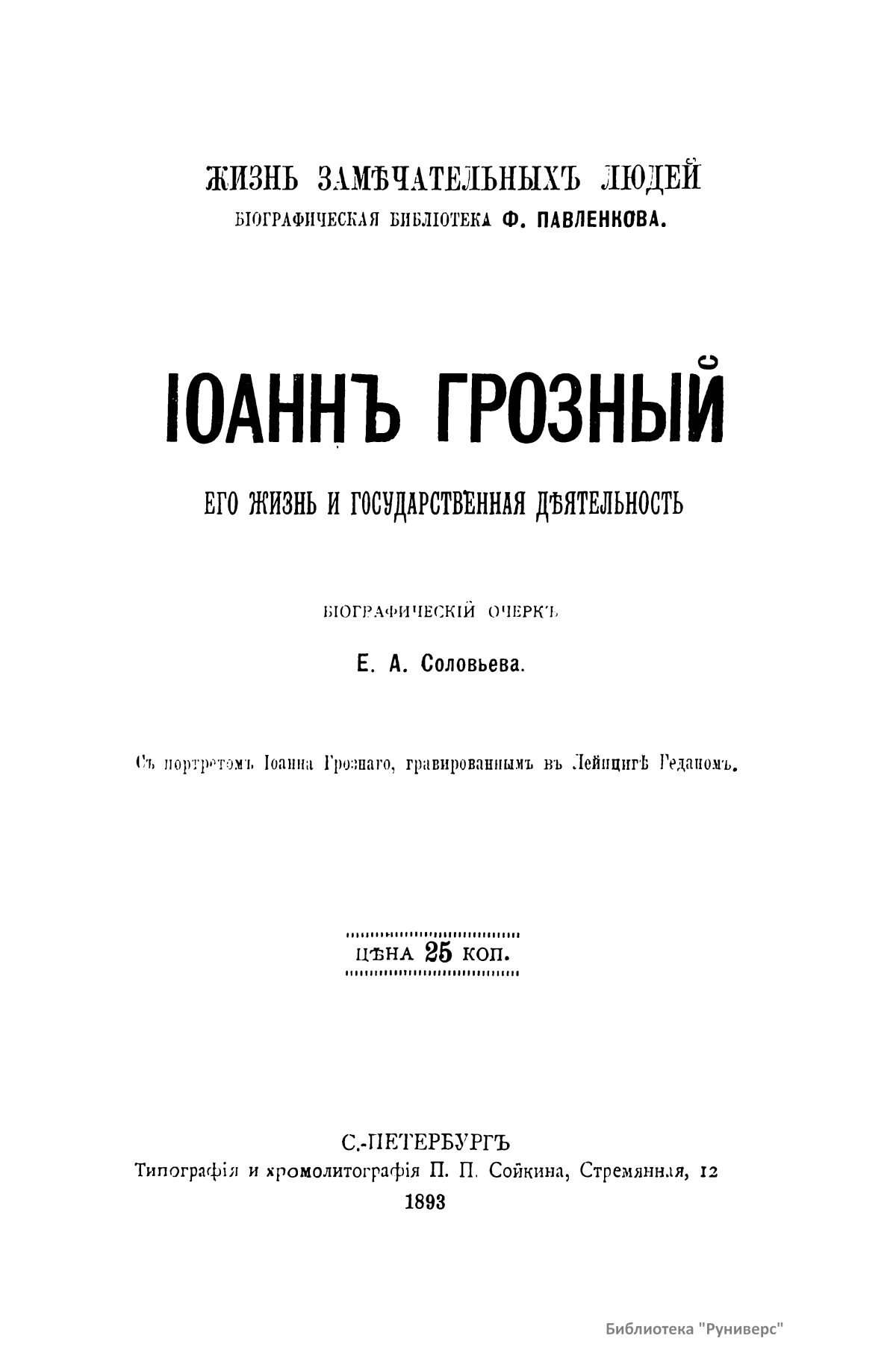 Биографический очерк из серии «Жизнь замечательных людей» с портретом Ивана Грозного, гравированным в Лейпциге Геданом. Иван IV Васильевич Грозный (1530 – 1584), великий князь Московский и всея Руси (с 1533 г.), первый русский царь (с 1547 г.), сын Василия III. С конца 40-х гг. правил с участием Избранной рады. При нем начался созыв Земских соборов, составлен судебник 1550 г. Провел реформы управления и суда (Губная, Земская и др. реформы). Покорил Казанское (1552) и Астраханское (1556) ханства. В 1565 г. ввел опричнину. Вел Ливонскую войну (1558 – 1583). При Иване IV установились торговые связи с Англией (1553), создана 1-я типография в Москве. Началось присоединение Сибири (1581). Внутренняя политика Ивана IV сопровождалась массовыми репрессиями.