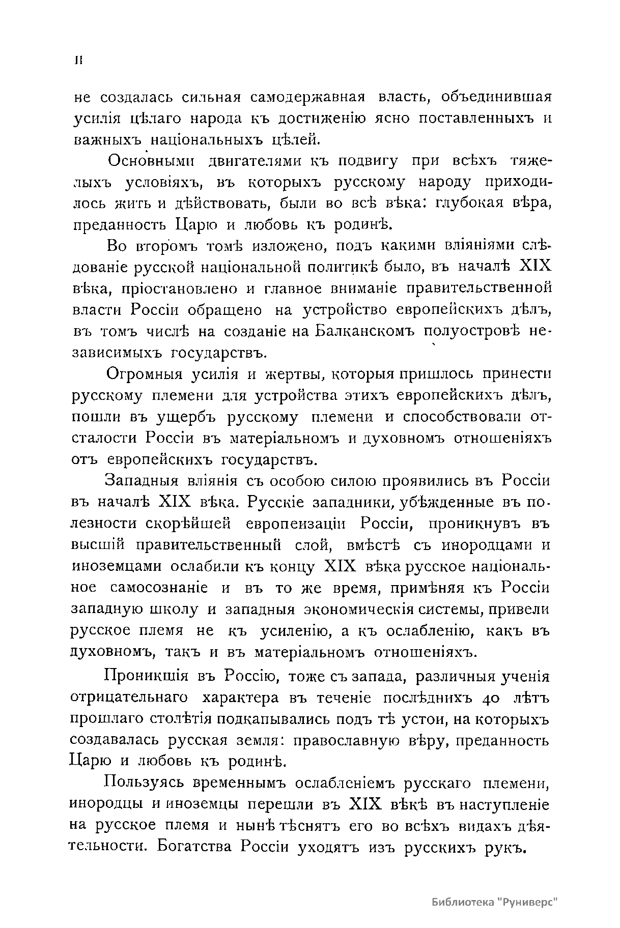 В настоящем издании автор рассуждает об исторических путях России и будущих задачах русской армии. В первом томе изложены задачи русской армии в XV – XVIII вв., выполненные ею в целях объединения русского племени и расширения пределов России до естественных рубежей: морей Балтийского, Черного и Каспийского, океанов Ледовитого и Восточного. Здесь говорится о том, какие русскому народу потребовались усилия, чтобы выйти победителем из борьбы с татарами, литовцами, поляками, ливонцами, шведами, турками и создать могущественное русское государство. По мнению автора, основными двигателями к подвигу во все века были: глубокая вера, преданность царю и любовь к родине. Во второй том вошли главным образом войны в начале XIX столетия с Наполеоном I и войны освободительного характера на Балканском полуострове. Главное внимание правительственной власти в это время ушло на устройство европейских дел, в том числе и на устройство на Балканском полуострове независимых государств. Автор считает, что такая политика, а также западные влияния пошли в ущерб русскому племени и способствовали отсталости России в материальном и духовном отношении от европейских государств. В третьем томе говорится о положении России к концу XIX в. и намечены главные задачи России и русской армии в XX в. Для того чтобы эти задачи были выполнены, необходимо, по мнению автора, вернуться к русской национальной политике.