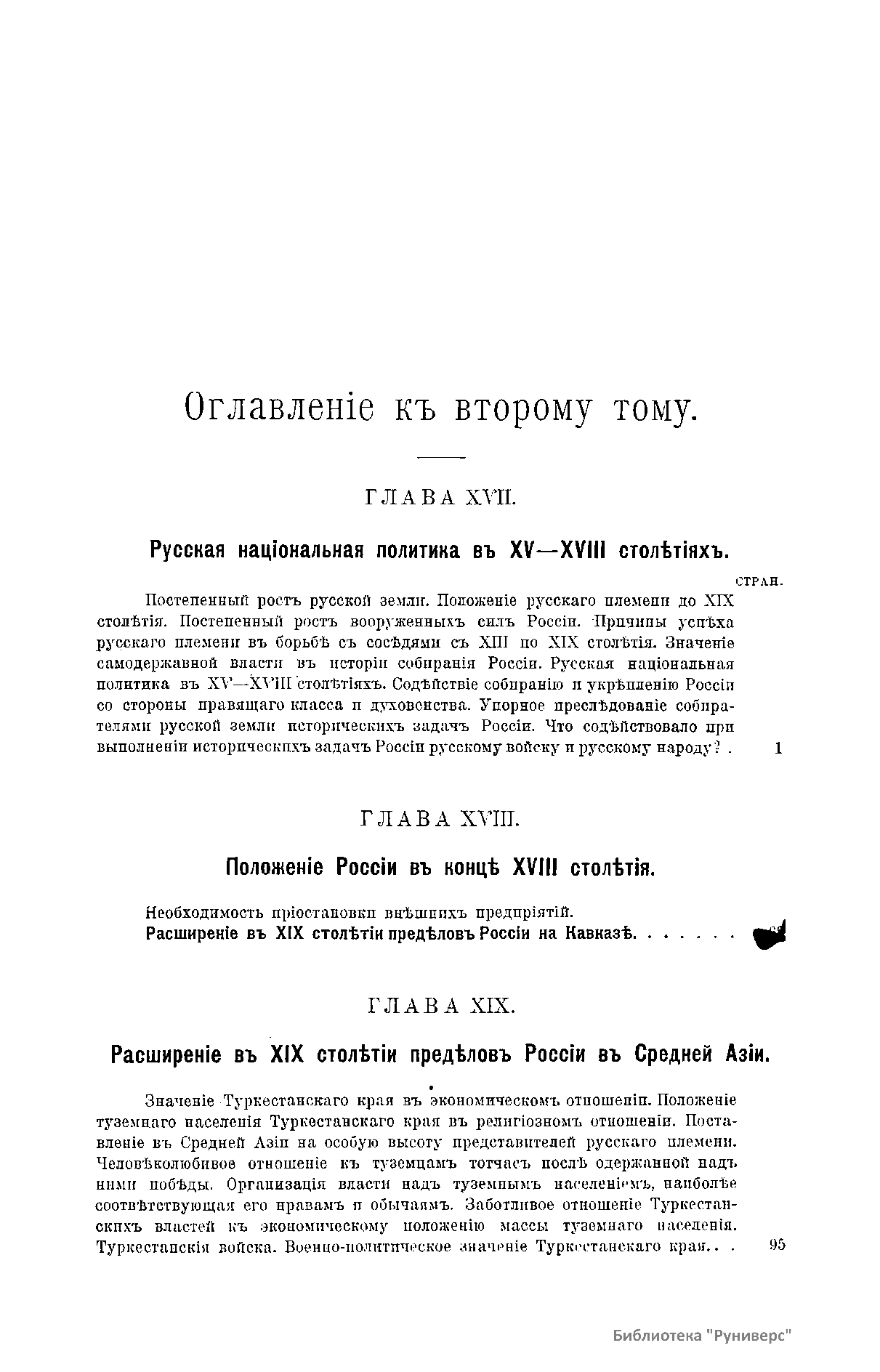 В настоящем издании автор рассуждает об исторических путях России и будущих задачах русской армии. В первом томе изложены задачи русской армии в XV – XVIII вв., выполненные ею в целях объединения русского племени и расширения пределов России до естественных рубежей: морей Балтийского, Черного и Каспийского, океанов Ледовитого и Восточного. Здесь говорится о том, какие русскому народу потребовались усилия, чтобы выйти победителем из борьбы с татарами, литовцами, поляками, ливонцами, шведами, турками и создать могущественное русское государство. По мнению автора, основными двигателями к подвигу во все века были: глубокая вера, преданность царю и любовь к родине. Во второй том вошли главным образом войны в начале XIX столетия с Наполеоном I и войны освободительного характера на Балканском полуострове. Главное внимание правительственной власти в это время ушло на устройство европейских дел, в том числе и на устройство на Балканском полуострове независимых государств. Автор считает, что такая политика, а также западные влияния пошли в ущерб русскому племени и способствовали отсталости России в материальном и духовном отношении от европейских государств. В третьем томе говорится о положении России к концу XIX в. и намечены главные задачи России и русской армии в XX в. Для того чтобы эти задачи были выполнены, необходимо, по мнению автора, вернуться к русской национальной политике.