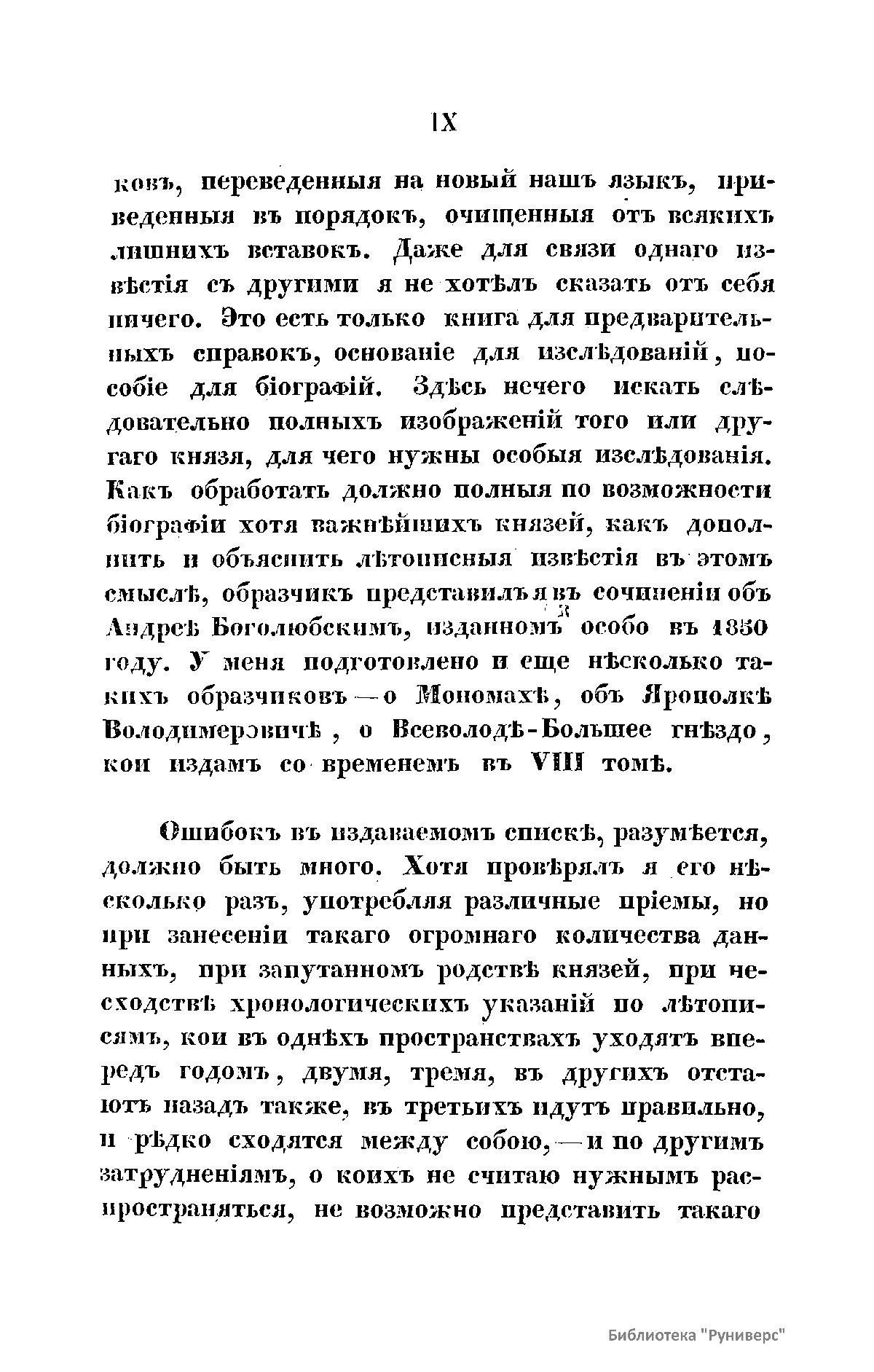«На пользу науке, на славу Отечества, к чести своего времени» Первый том посвящен источникам древнейшей русской истории и преимущественно Несторовой летописи. В его состав вошло уже напечатанное прежде исследование, к которому присоединены замечания о прочих источниках: Русской правде, церковных уставах, северных сагах и пр. Приведен разбор всех мнений о Несторовой летописи. Предмет второго тома – происхождение Варягов-Руси. Здесь помещено первое рассуждение автора об этом предмете, исправленное и дополненное новыми исследованиями и открытиями. Автор разбирает также новые мнения о происхождении Варягов-Руси. В этом томе опубликованы лекции о славянах, в которых заключается краткое извлечение о Славянских Древностях Шафарика. Третий том содержит исследования и замечания о событиях первого периода, который автор называет Варяжским, или Норманским (862 – 1054), с объяснением всех мест Несторовой летописи, и сравнение русского начала с началом прочих западных государств, где показан источник различия между их последующими историями. Четвертый том посвящен приготовительным и общим исследованиям: об источниках для удельного периода, т.е. о летописях и их хронологии, о родах князей, о пределах и городах Ярославовых княжеств, о праве великокняжеского наследства, об отношении великого князя к прочим князьям, об отношении их между собой. В пятом томе исследуются междуусобные войны князей и их сношения, внешние войны и внешние сношения. В шестом томе автор приводит азбучный список русских князей до монгольского ига; список русских князей до монгольского ига по степеням и старшинству; список князей по княжествам и уделам. В седьмом томе автор рассуждает о князе, его дружине, боярах и отроках; о городах и их обитателях; о волостях и их отношении к городам; о военном деле; о праве; торговле; церкви, грамотности и образовании.