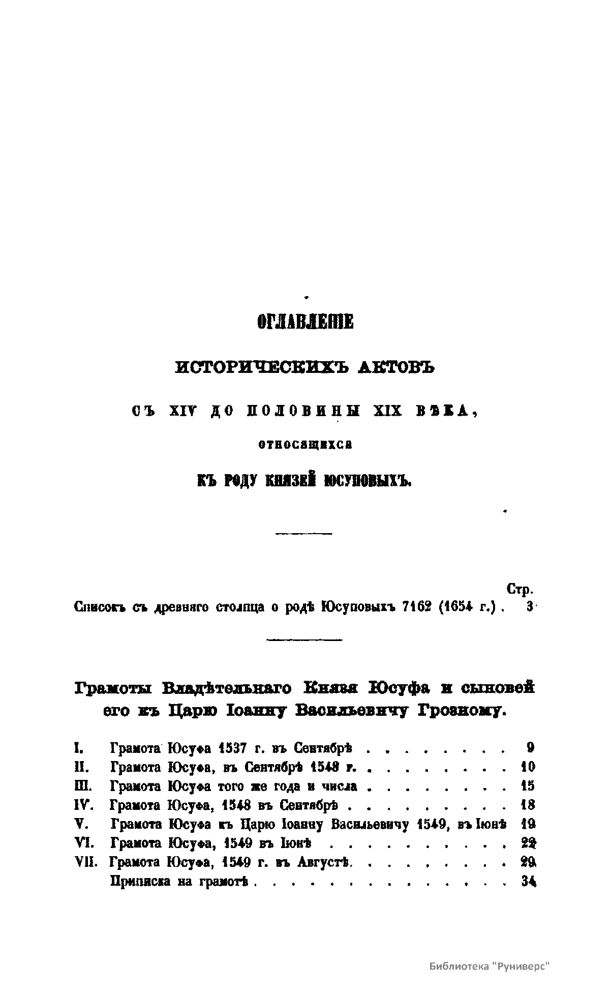 Первую часть составляют отдельные жизнеописания представителей рода князей Юсуповых. Во второй части опубликованы исторические акты с XIV до половины XIX века