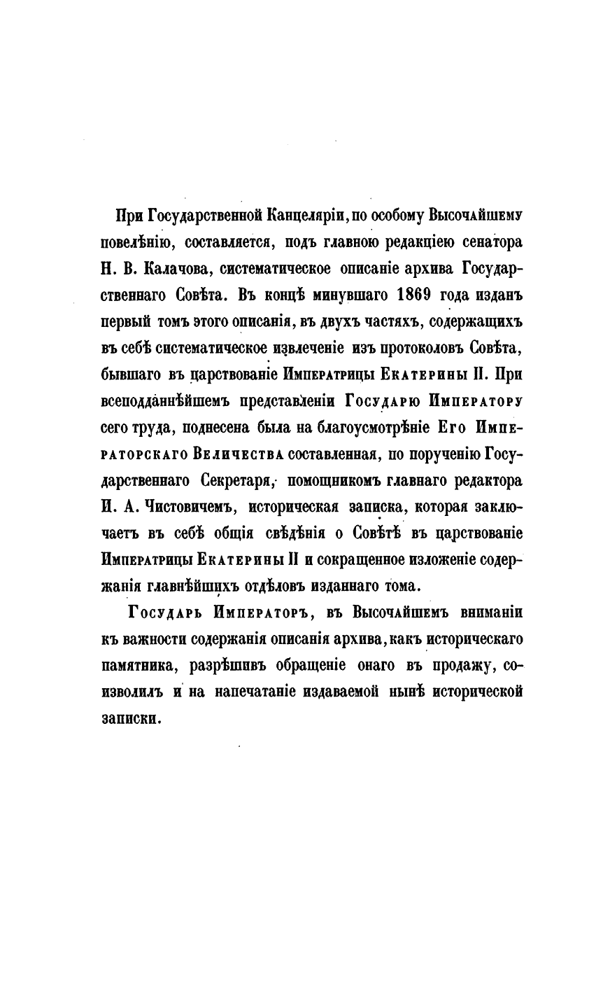По поручению главного редактора «Описания», историка-академика и сенатора Н.В. Калачова, его помощник, профессор Иларион Алексеевич Чистович, составил историческую записку, в которой сообщаются главные сведения о екатерининском Совете и приводится сокращенное изложение основных разделов ранее выпущенных томов.
