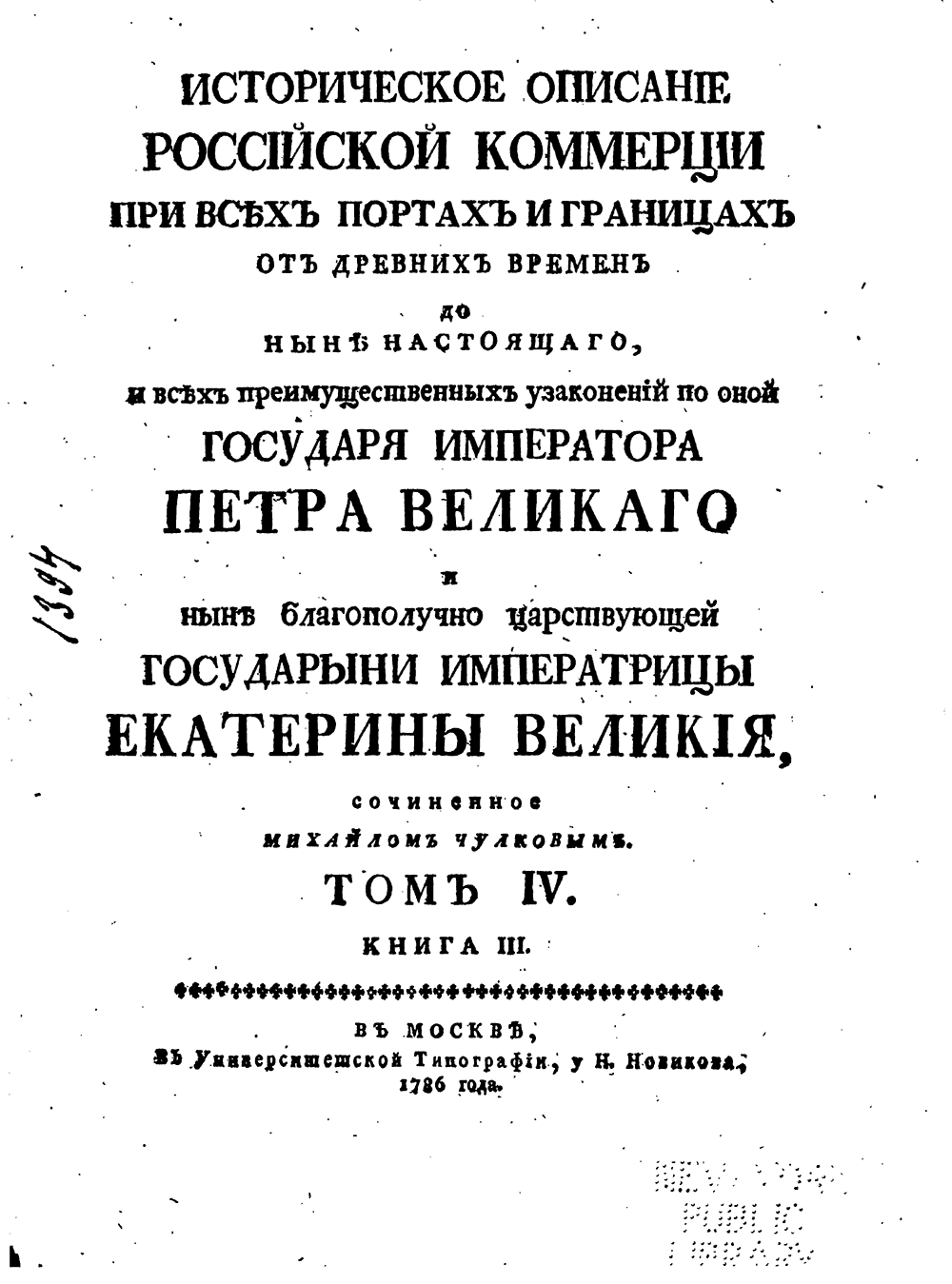 Историческое описание Российской коммерции при всех портах и границах от древних времен до Нынешнего. Том IV. Книга III