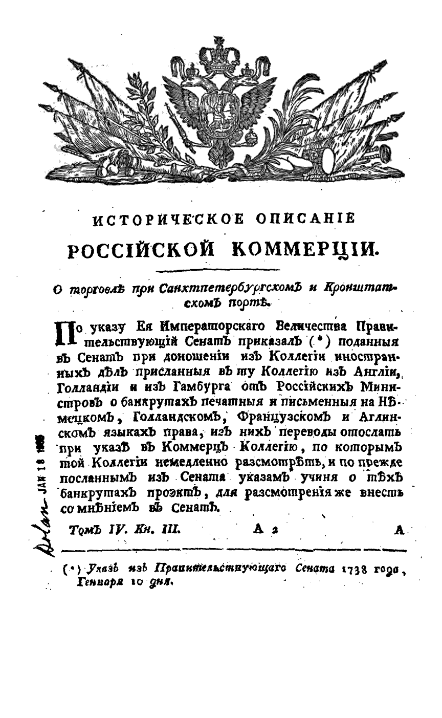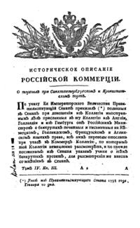 Историческое описанiе Россiйской коммерцiи при всѣхъ портахъ и границахъ отъ древнихъ временъ до Нынѣ настоящаго