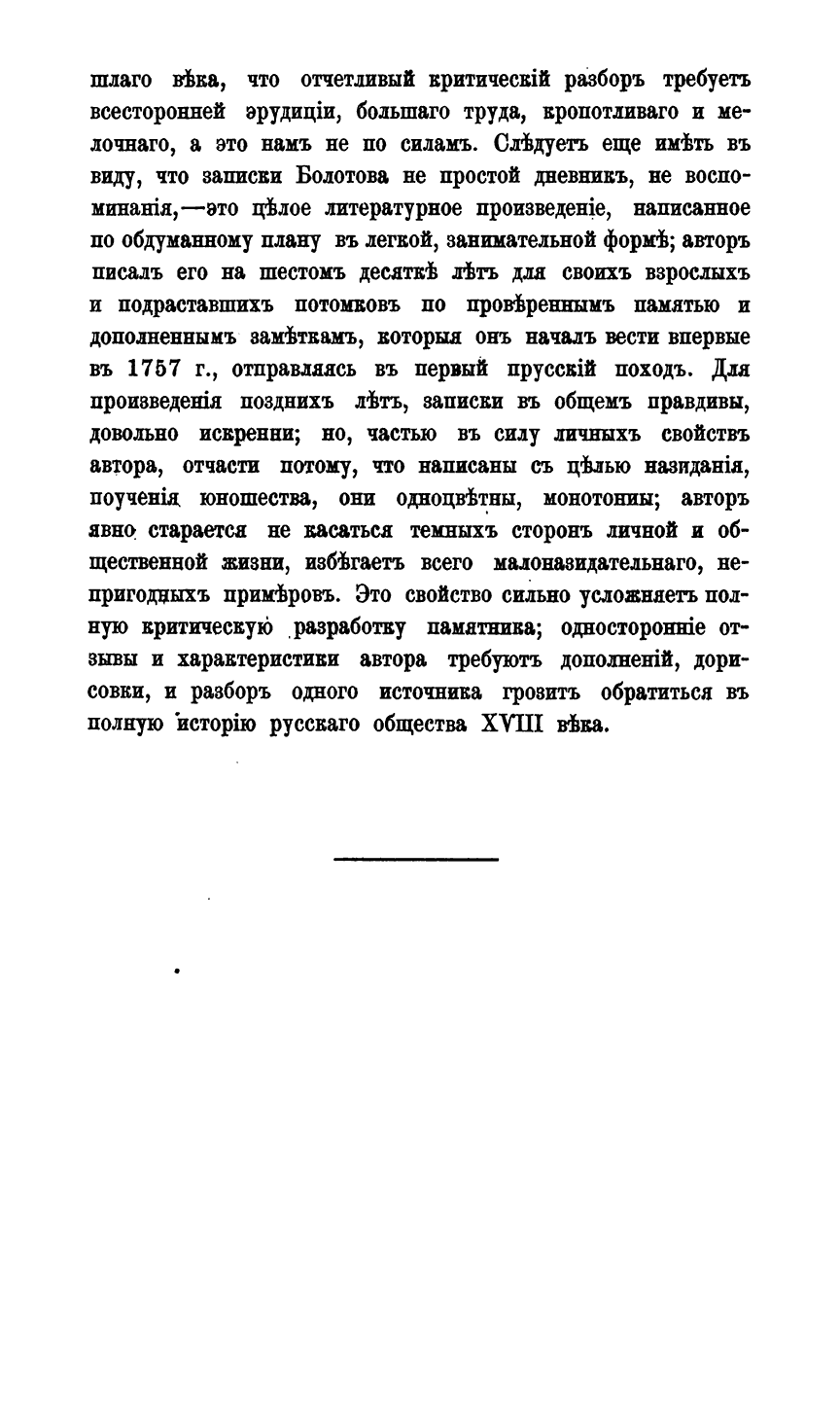 «...Свои «Записки» Болотов составил в 1789 - 1816гг., в 29 частях; они занимают исключительное место в русской мемуарной литературе, как по своему интересу, так и вследствие правдивости и объективности их изложения. Автор подчас наивно, но беспристрастно, излагает историю своих предков, свою собственную жизнь и жизнь окружавшего его общества, злоупотребления и неурядицы современного социального строя и пр. «Записки» дают богатый материал для изучения быта провинциального дворянства XVIII века и дают возможность определить степени культурности русского общества в ту эпоху. С этою целью ими воспользовалась Е. Щепкина в своем труде: «Старинные помещики на службе и дома, 1578 - 1762»