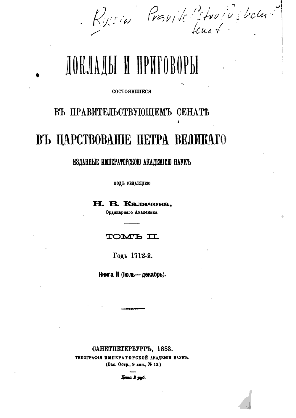 Доклады и приговоры состоявшиеся в Правительствующем Сенате в царствование Петра Великого. Том II. Год 1712. Книга II (июль-декабрь)