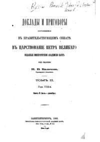 Доклады и приговоры состоявшiеся въ Правительствующемъ Сенатѣ въ царствованiе Петра Великаго