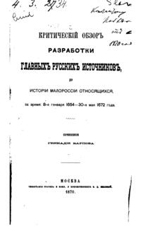 Критическiй обзоръ разработки главныхъ русскихъ источниковъ, до исторiи Малороссiи относящихся, за время: 8-е генваря 1654 - 30-е мая 1672 года