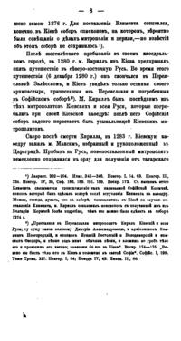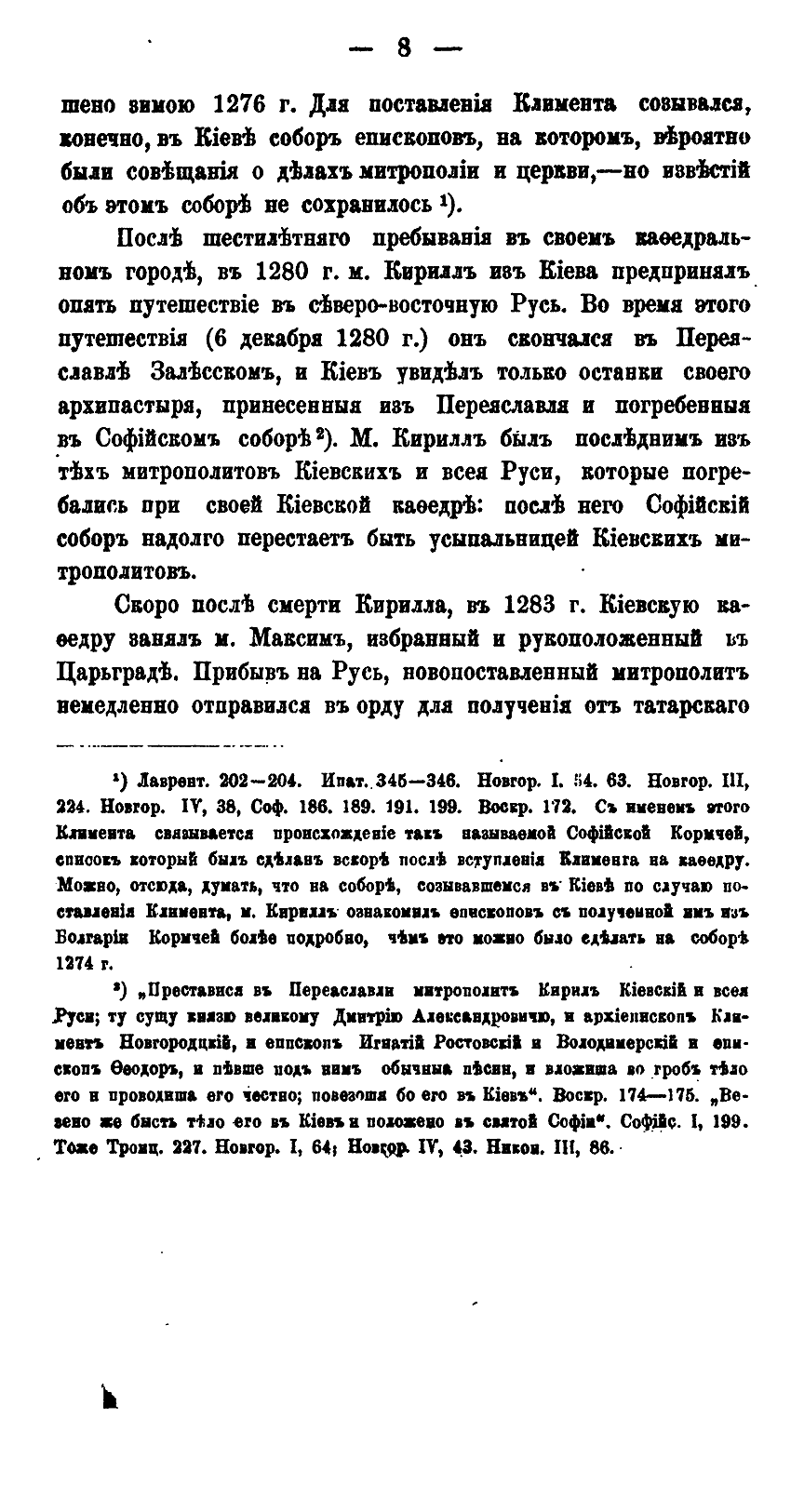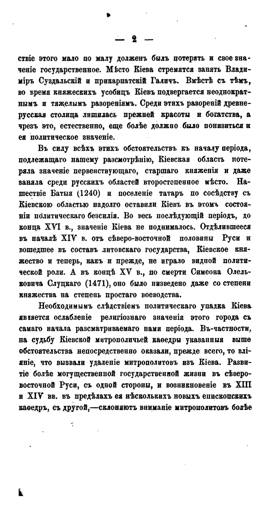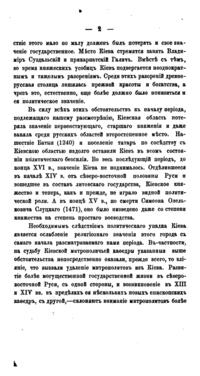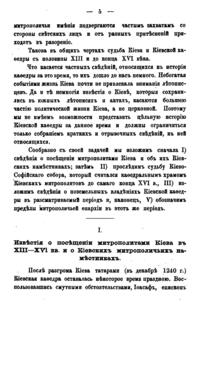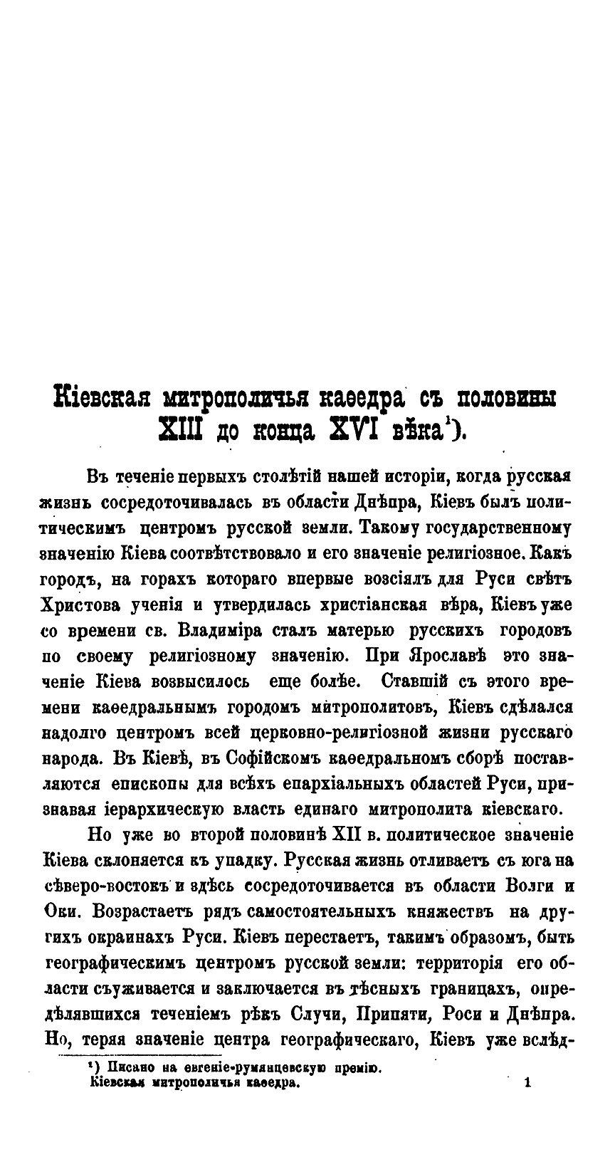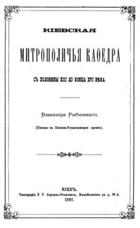 В своей небольшой, но насыщенной фактами работе известный писатель и богослов В.П. Рыбинский детально изучает судьбу Киевской мирополичьей кафедры в период, когда Киев утратил свое главенствующее положение среди русских городов. Нашествие Батыя, а затем отпадение Киевского княжества от Северо-Восточной Руси, где сосредоточилась политическая и духовная жизнь страны привели к тому, что уже с XIII века митрополиты удалились из города. Присоединение Киева к Литовскому государству также не способствовало возрождению духовного центра. Литовские князья добились независимости киевской митрополии от Москвы, однако и теперь митрополиты продолжали управлять кафедрой через своих наместников, приведя к концу XVI века дела Киевской митрополии к полному разорению…