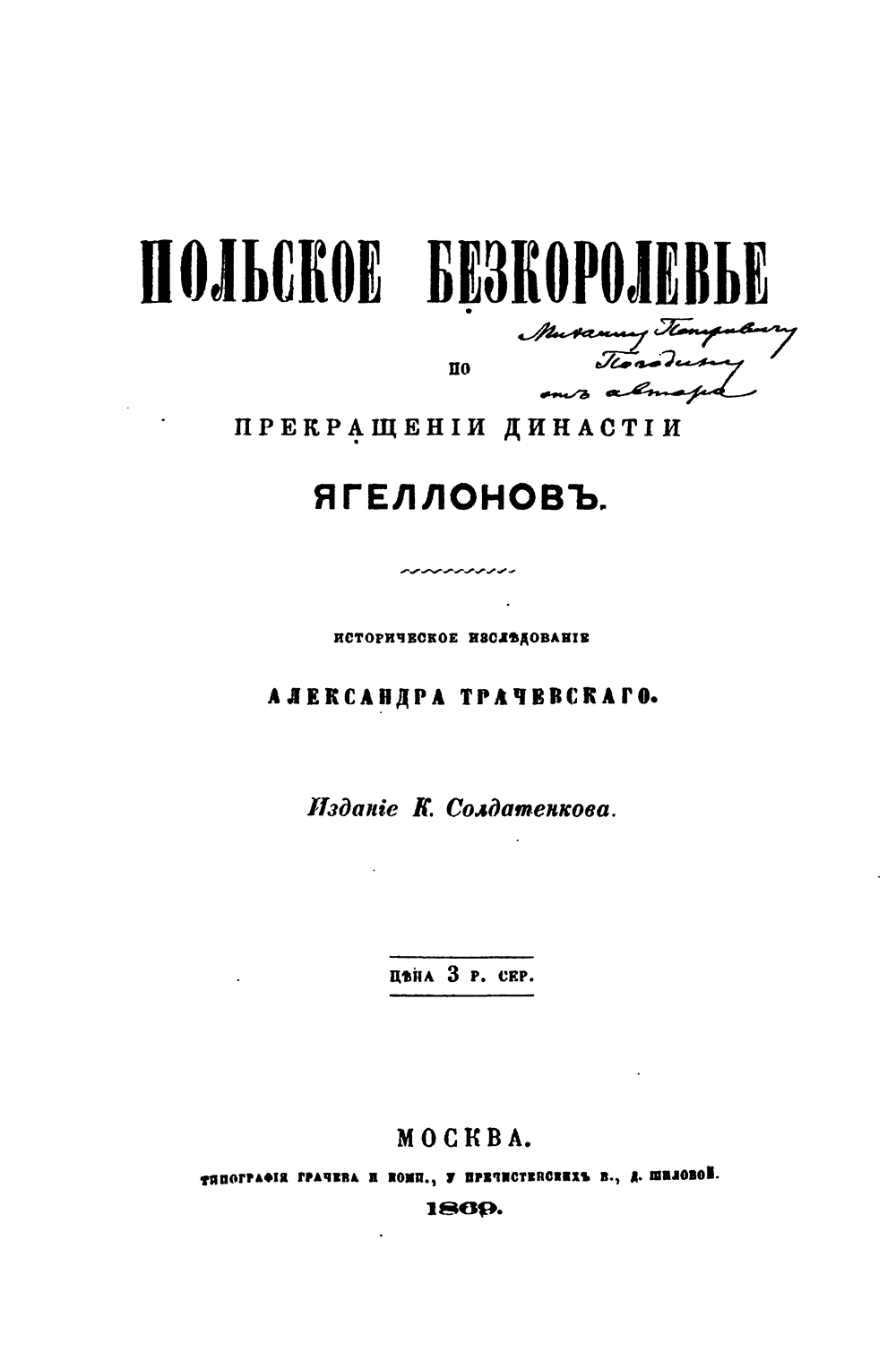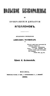 «Польское бескоролевье» - магистерская диссертация, которую Трачевский защитил, когда ему было уже за 30. Однако напечатанная вскоре издательством К. Солдатенкова одноименная книга, выглядит так, будто научная работа была начисто переписана свежеиспеченным магистром в расчете на успех у массовой аудитории. Автор полностью отказывается от кропотливой академичности, свойственной московской исторической школе, и пишет так, будто эмоционально выступает со сцены, развлекая образованную публику летним вечером в Нескучном саду. «Нами руководил не исключительно научный интерес», — откровенно признается Александр Семенович в предисловии и на шестистах последующих страницах демонстрирует блестящее красноречие, стройность слога, огромный словарный запас и способность удерживать читательский интерес не хуже иного матерого беллетриста.