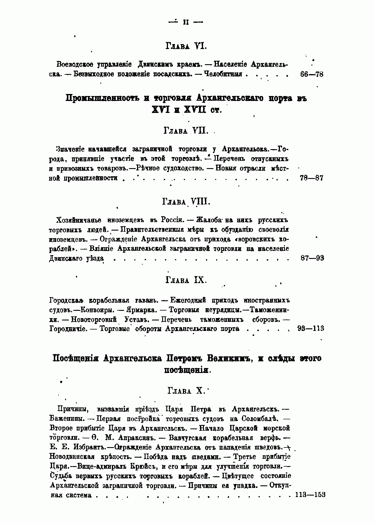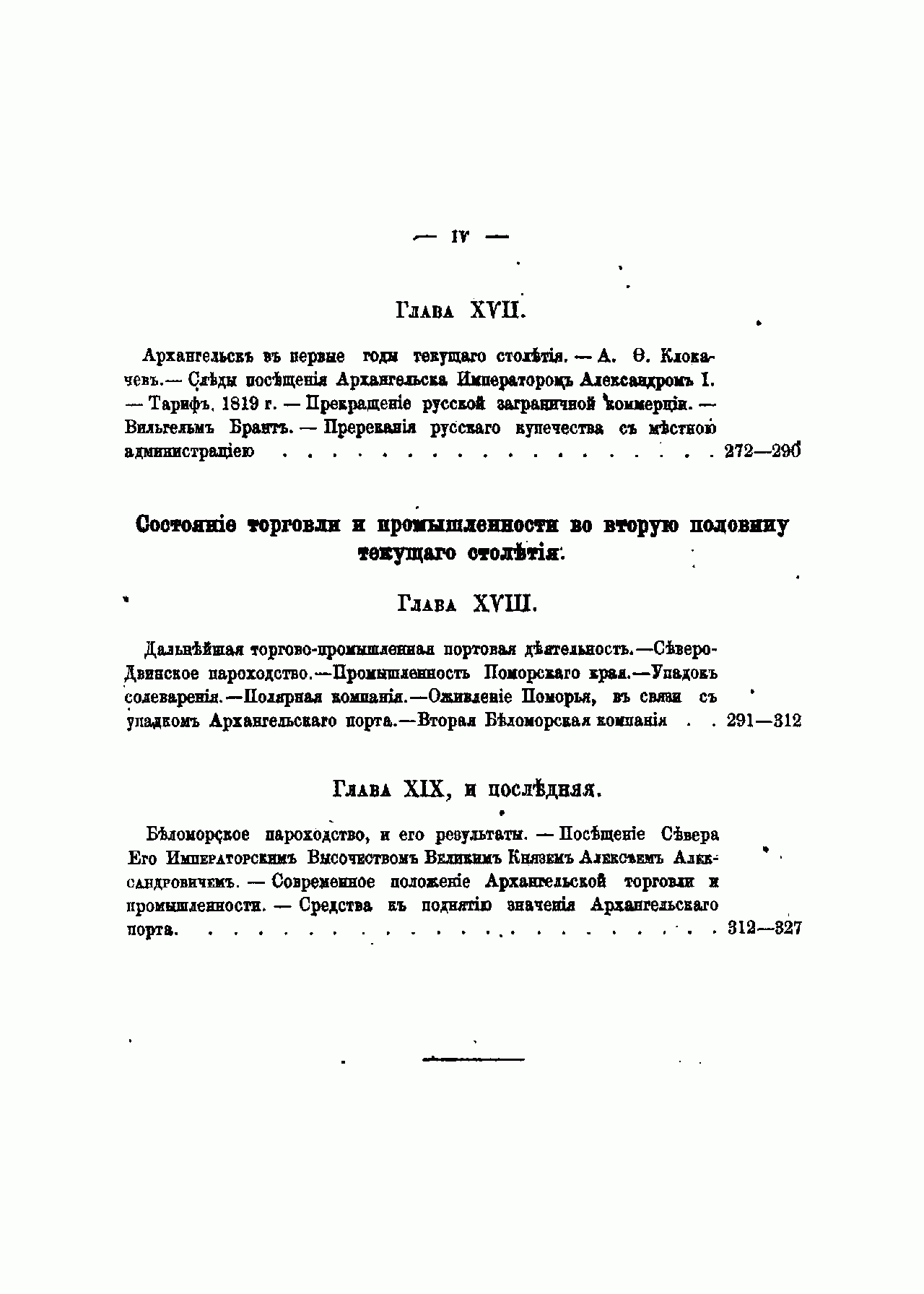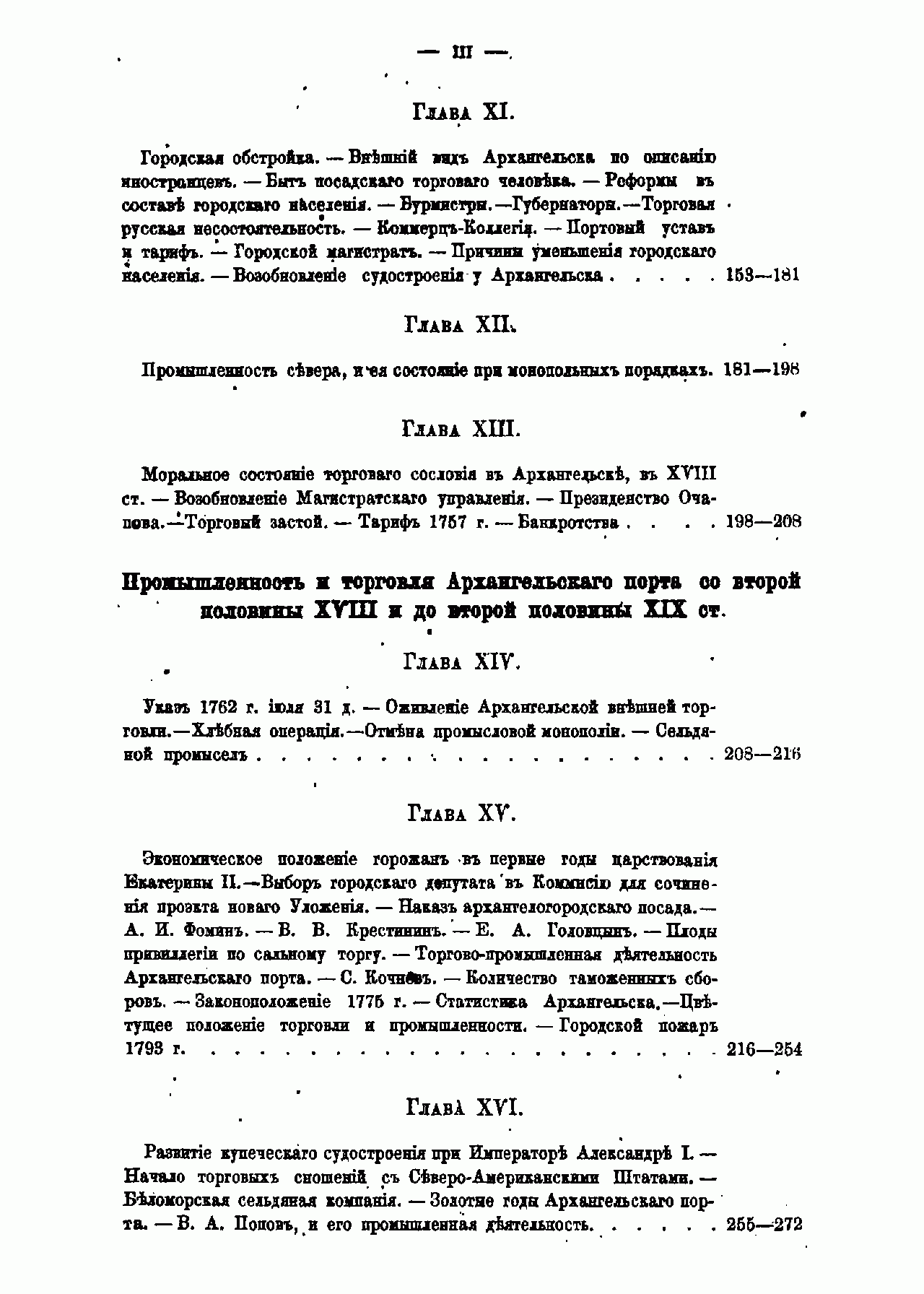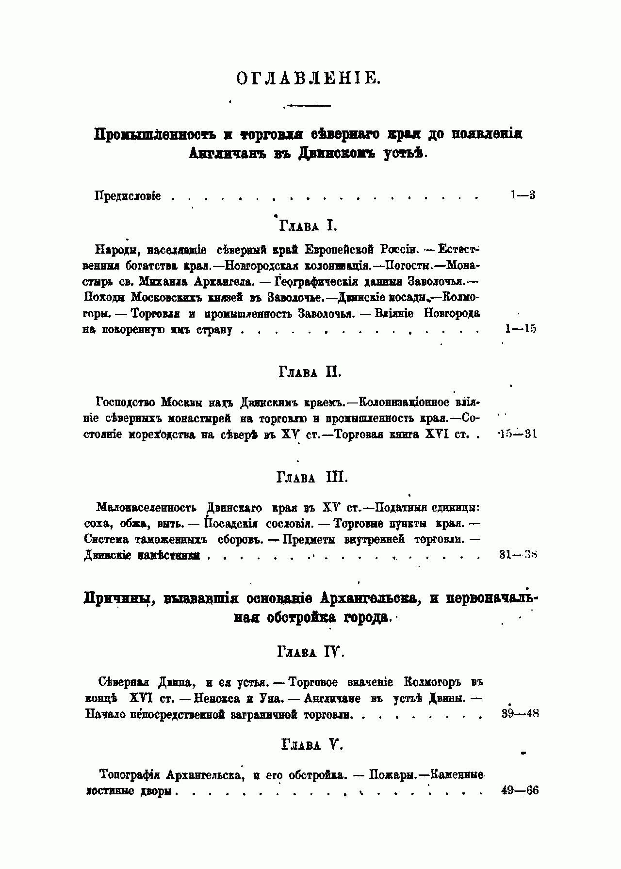 Автор ставит перед собой задачу изучить трёхсотлетнюю историю города Архангельска и прежде всего выяснить причины, тормозившие естественное развитие торговли Архангельского порта и соответственно промышленности края. В книге говорится о промышленности и торговле северного края до появления англичан в Двинском устье; о причинах появления города и первоначальном строительстве; о промышленности и торговле архангельского порта в XVI и XVII веках; о посещении города Петром Великим; о промышленности и торговле порта со второй половины XVIII и до первой половины XIX века. Завершает книгу глава о состоянии торговли и промышленности в современную автору эпоху (вторая половина XIX в.), в которой он говорит о том, что необходимо сделать, чтобы поднять значение архангельского порта.