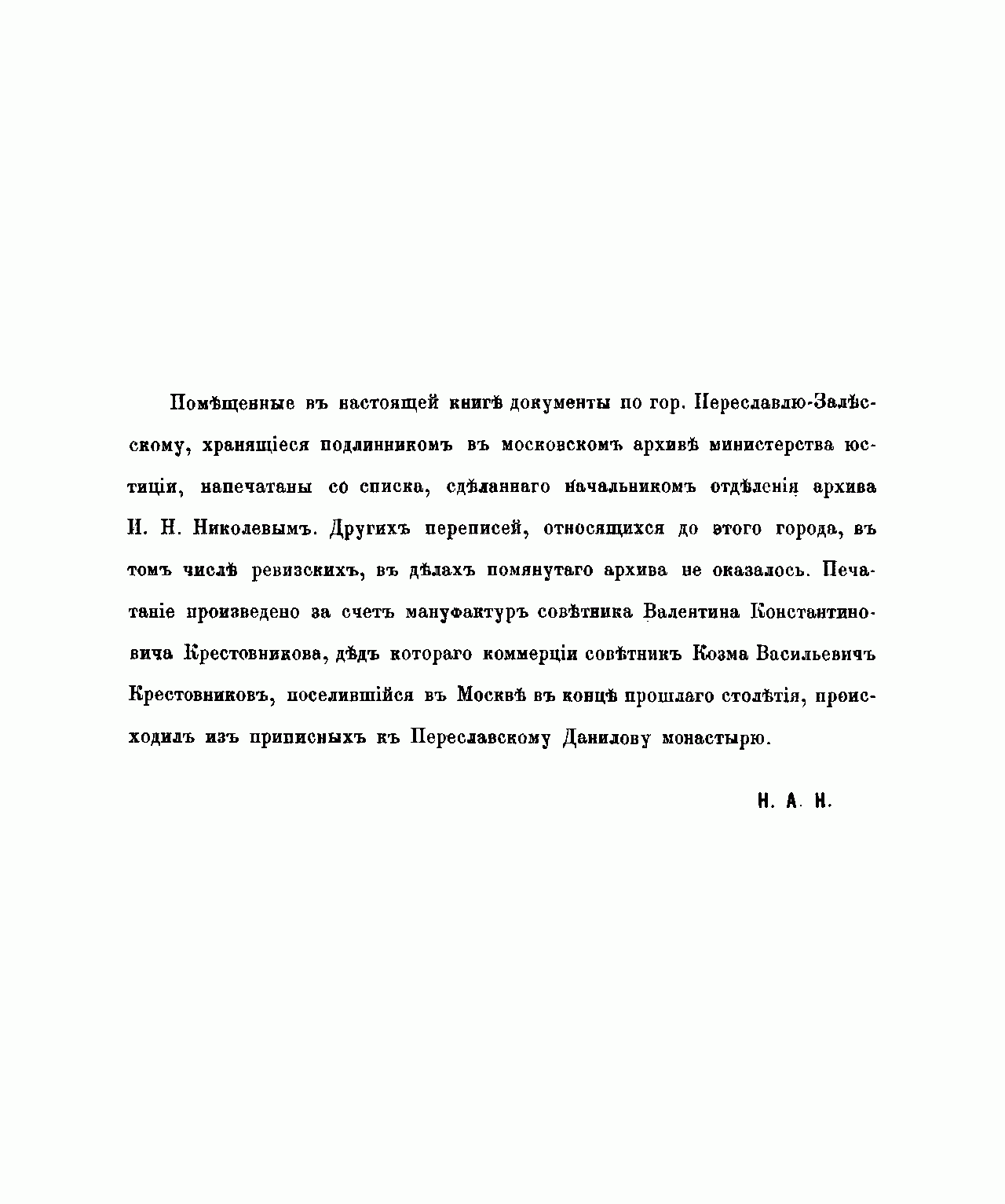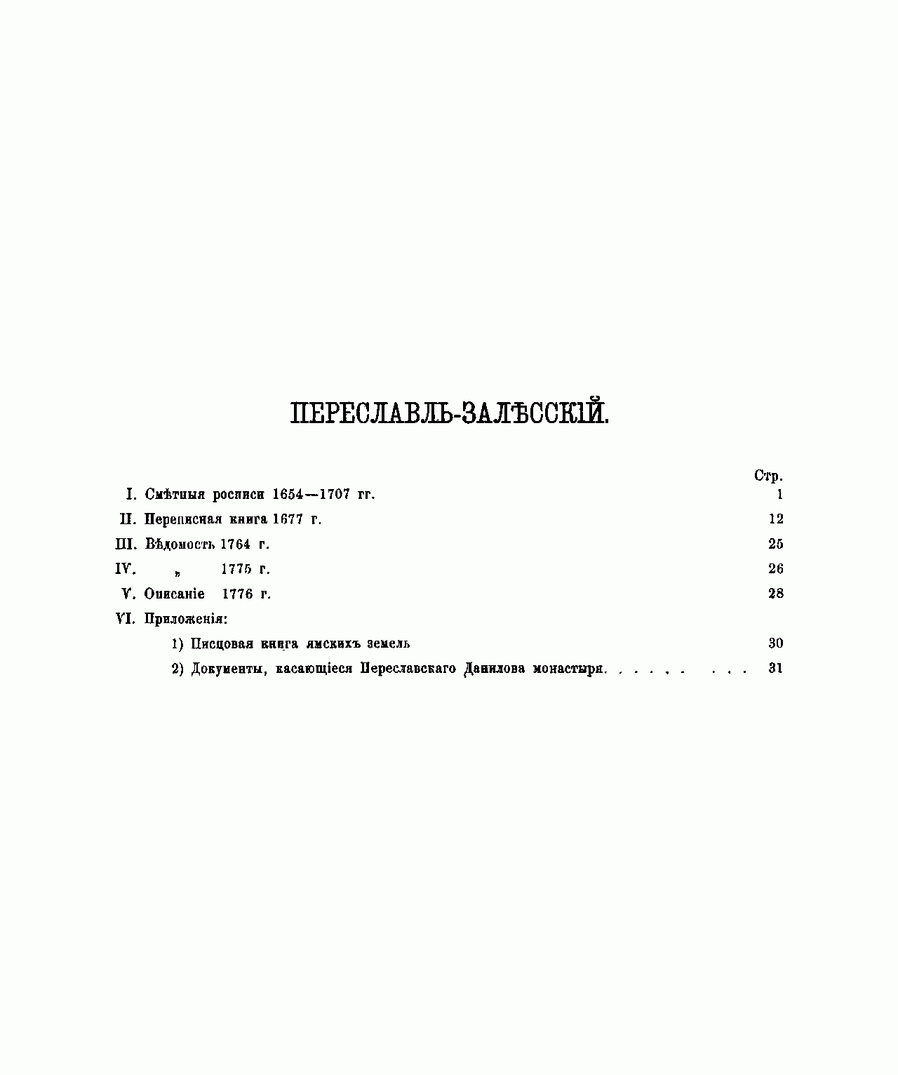 Публикация исторических документов XVII и XVIII вв. осуществлена на средства мануфактур-советника В. Н. Крестовникова, происходившего из города Переславль-Залесского. В книге опубликованы: сметные росписи 1654 – 1707 гг.; переписная книга 1677 г.; ведомости 1764-го и 1775 г., описание города 1776 г., а также документы, касающиеся Переславльского Данилова монастыря, к которому был приписан дед В. Н. Крестовникова – К. В. Крестовников. Описание города 1776 г. позволяет получить представление о том, как выглядел и жил город в конце XVIII века.