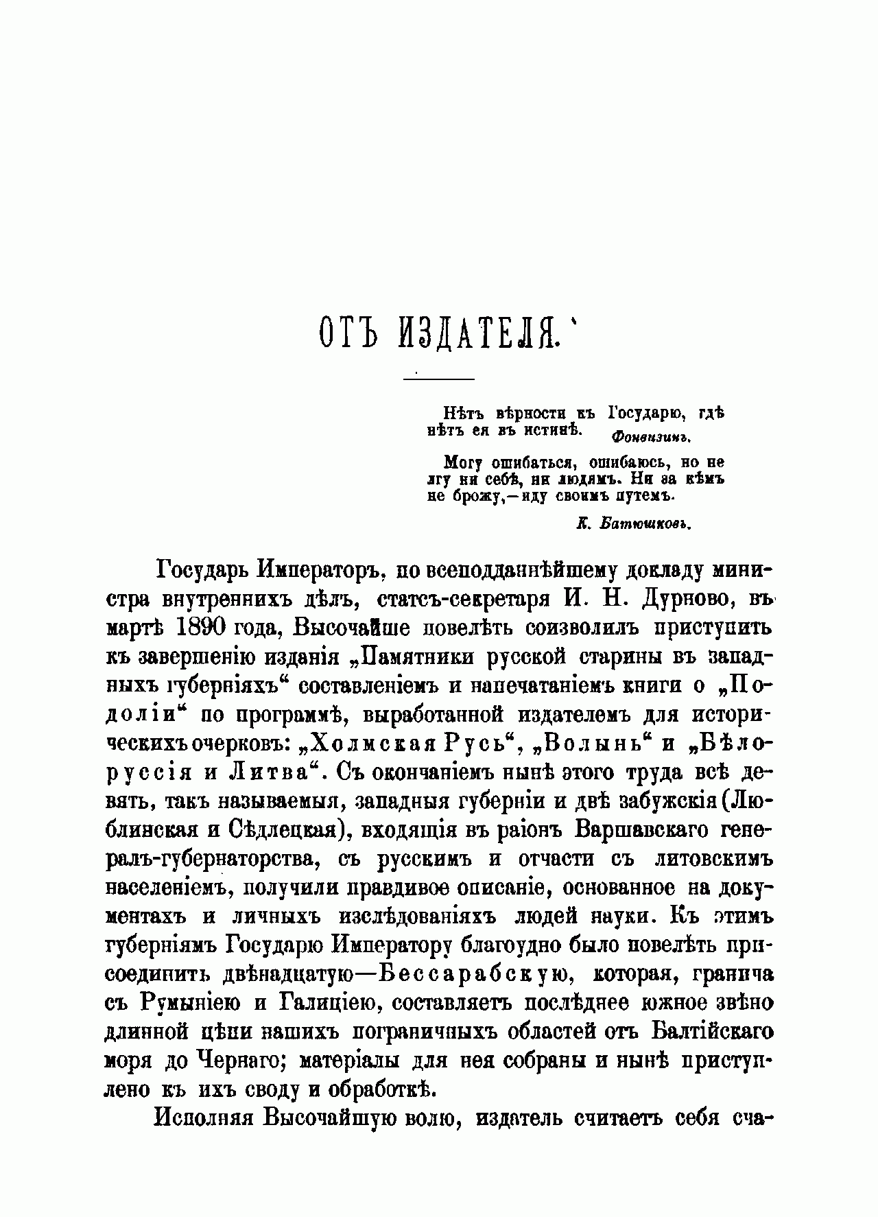 Книга о Подолии (историческая область в бассейне Южного Буга и левобережья Днестра на территории современной Украины) входит в серию «Памятники русской старины в западных губерниях». Издателем книги является П. Н. Батюшков. Автор исторического очерка о Подолии – профессор Киевской духовной академии Н. И. Петров. Автор статей, поясняющих помещённые в книге рисунки, – действительный статский советник М. И. Городецкий. Также в составлении книги приняли участие многие другие лица, указанные в главе «От издателя». Н. И. Петров рассматривает следующие периоды в истории Подолии: период самостоятельного существования и стремления местных русских славян к объединению и борьбы их с кочевниками; литовско-русский период процветания русской народности под властью Литвы и борьбы с наступающим на неё полонизмом со второй половины XIV века и до люблинской унии Литвы с Польшей в 1569 году; польско-русский период, или время стремления польских начал подавить русскую народность в крае; период восстановления русской народности в крае со времени воссоединения его с Россией в 1793 году.