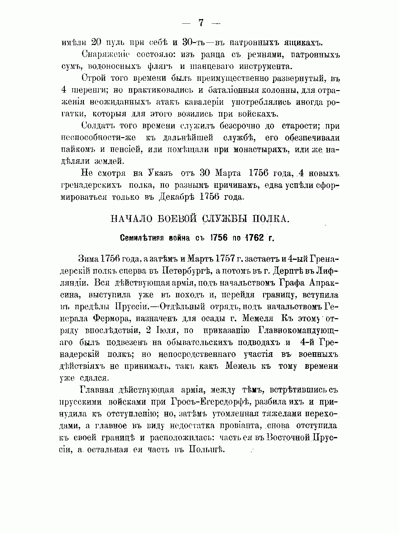 Малороссийский 10-й Гренадерский генерал-фельдмаршала графа Румянцева-Задунайского полк (это наименование он носил с 1790 г.) был сформирован по указу императрицы Елизаветы Петровны, наряду с другими четырьмя первыми в российской армии гренадерскими полками, в конце 1756 г. в связи со вступлением России в Семилетнюю войну 1756-1763 гг. Затем полк был расформирован и уже в царствование Екатерины II принимал участие в русско-турецких войнах конца XVIII – начала XIX вв., войнах с Наполеоном, Отечественной войне 1812 г. и заграничных походах, в том числе сражениях при Аустерлице, Бородине, Лейпциге и взятии Парижа, польском походе 1830-1831 гг., Крымской и русско-турецкой 1877-1878 гг. войнах.