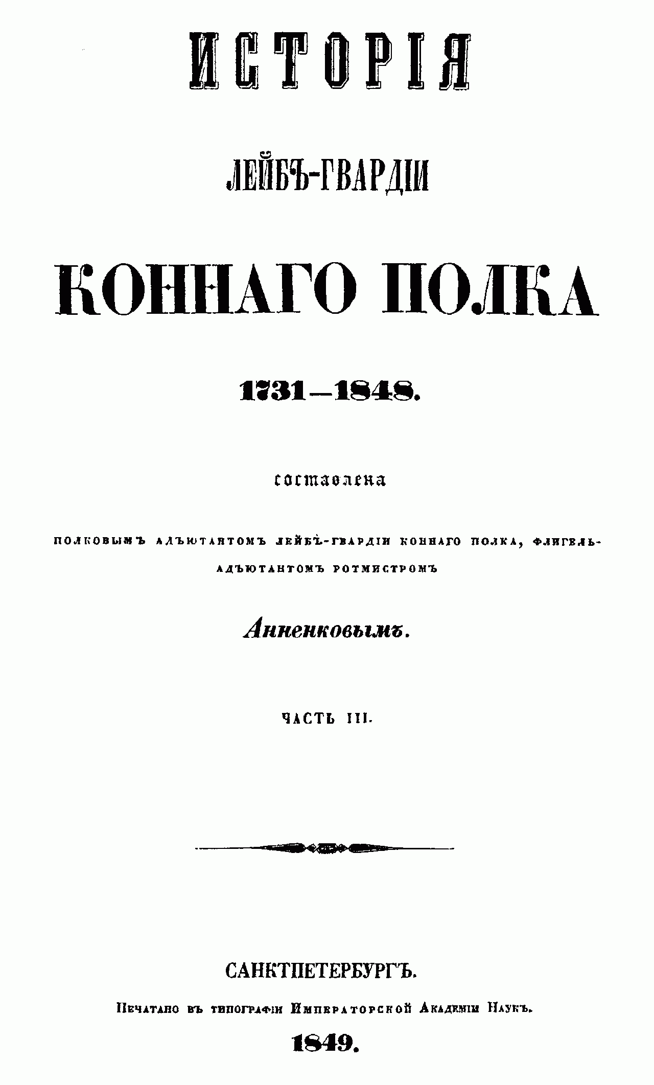 Лейб-гвардии Конный полк был сформирован в 1730 году как Конная гвардия из Кроншлотского драгунского полка, ведущего историю с 1706 года. Полк участвовал в войнах с Турцией, Швецией, Францией, подавлении Польского восстания 1831 года, участвовал в Первой мировой войне. Полк был одной из самых аристократических и блестящих частей гвардии, его командирами или шефами являлись императоры. Начальную историю Конного полка вы можете узнать, познакомившись с книгой И. В. Анненкова. Анненков Иван Васильевич — генерал-адъютант, генерал от кавалерии (1814–1887). Окончив курс в школе гвардейских подпрапорщиков и кавалерийских юнкеров в 1833 году, он вышел прапорщиком в лейб-гвардии Конный полк, где прослужил до 1852 года. В 1849 году Анненковым составлена обширная «История лейб-гвардии Конного полка, от 1731 до 1848 года». Всего было подготовлено 4 части и атлас на 25 листах. История полка представлена по периодам царствующих особ, в книге широко представлен статистический материал.
