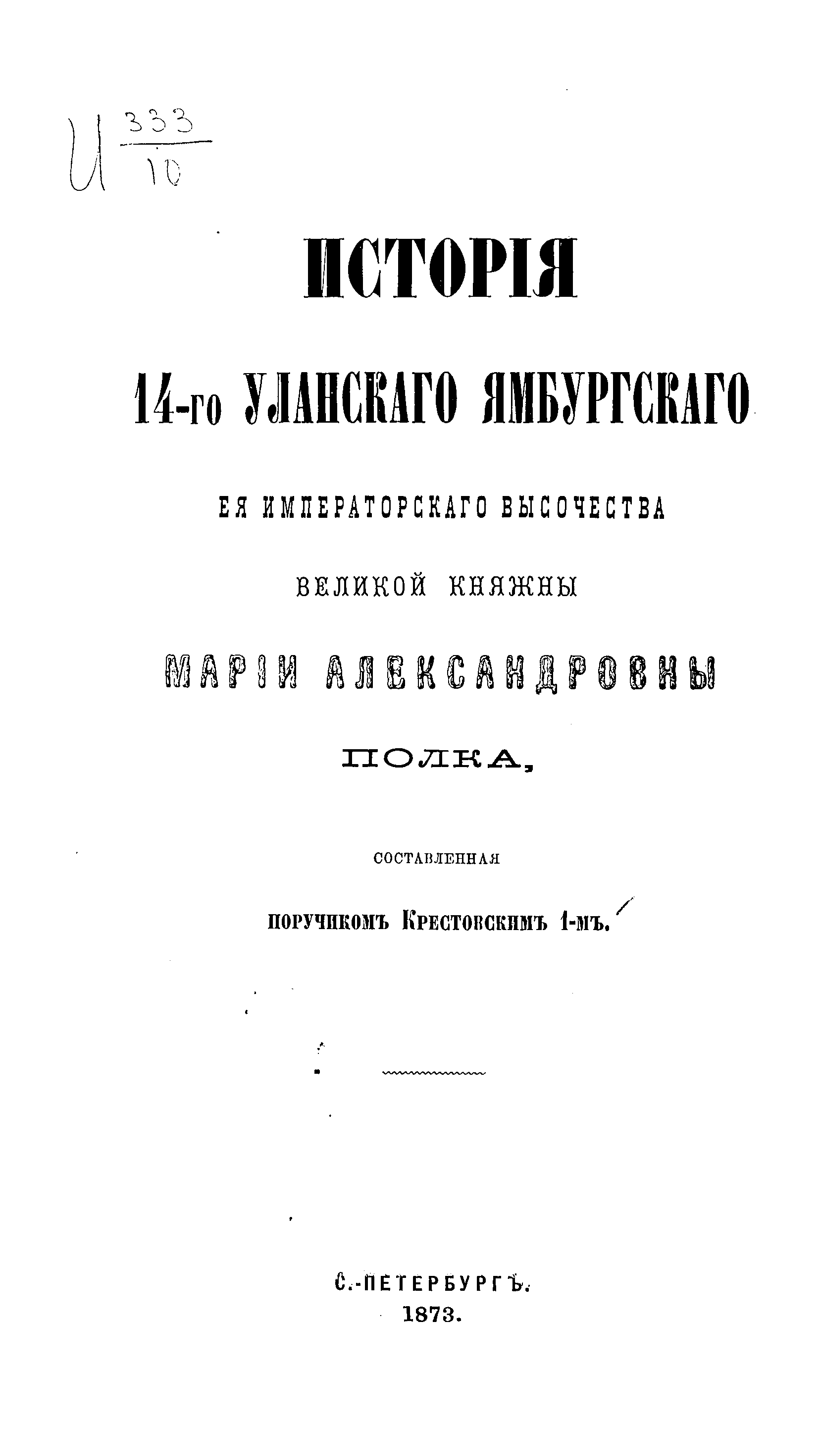 Документальное описание боевых действий полка и знаменательных исторических событий, связанных с ним, за период 1771 – 1871 годов. Приведены поименные послужные списки шефов, командиров и офицеров полка, кавалеров ордена св. Георгия. Крестовский Всеволод Владимирович — полковник, участник русско-турецкой войны 1877—1878 гг., писатель, с 1892 г. издатель и редактор издающейся в г. Варшаве русской литературно-политической газеты «Варшавский дневник». Произведения, написанные им после поступления на военную службу в конце 60-х годов: роман «Вне закона» (1873, 1876); историческая повесть «Деды» (1875, 1885, 1891); «История 14-го Уланского Ямбургского Ее Императорского Высочества Великой княжны Марии Александровны полка» (1873); «Из походных очерков» (1874); «На траве» (1876); «История Лейб-гвардии Уланского Его Величества полка» (1876); «Двадцать месяцев в действующей армии» (1879); описание в журнале «Русский вестник» кругосветного плавания в эскадре адмирала Лесовского в 1880 г.; «В гостях у эмира Бухарского» (1887); «Очерки кавалерийской жизни» (1892).