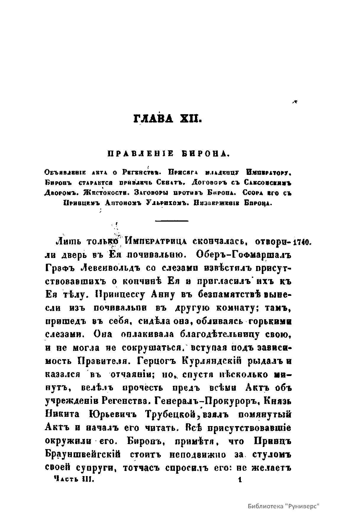 В первой части настоящего издания автор рассказывает о кончине Петра Великого; царствовании Екатерины I Алексеевны; царствовании Петра II Алексеевича; о начале царствования Анны Иоанновны. Вторая часть посвящена царствованию Анны Иоанновны. В третьей части говорится о правлении Бирона и о правлении великой княгини Анны Леопольдовны.