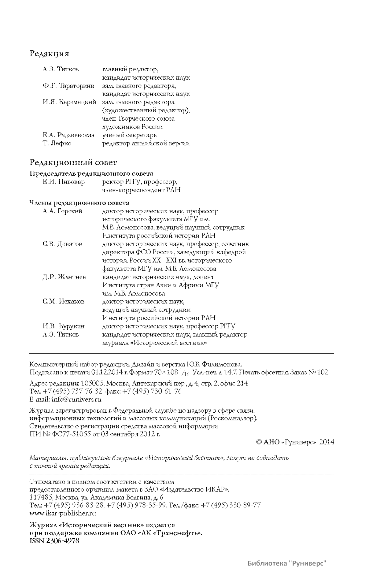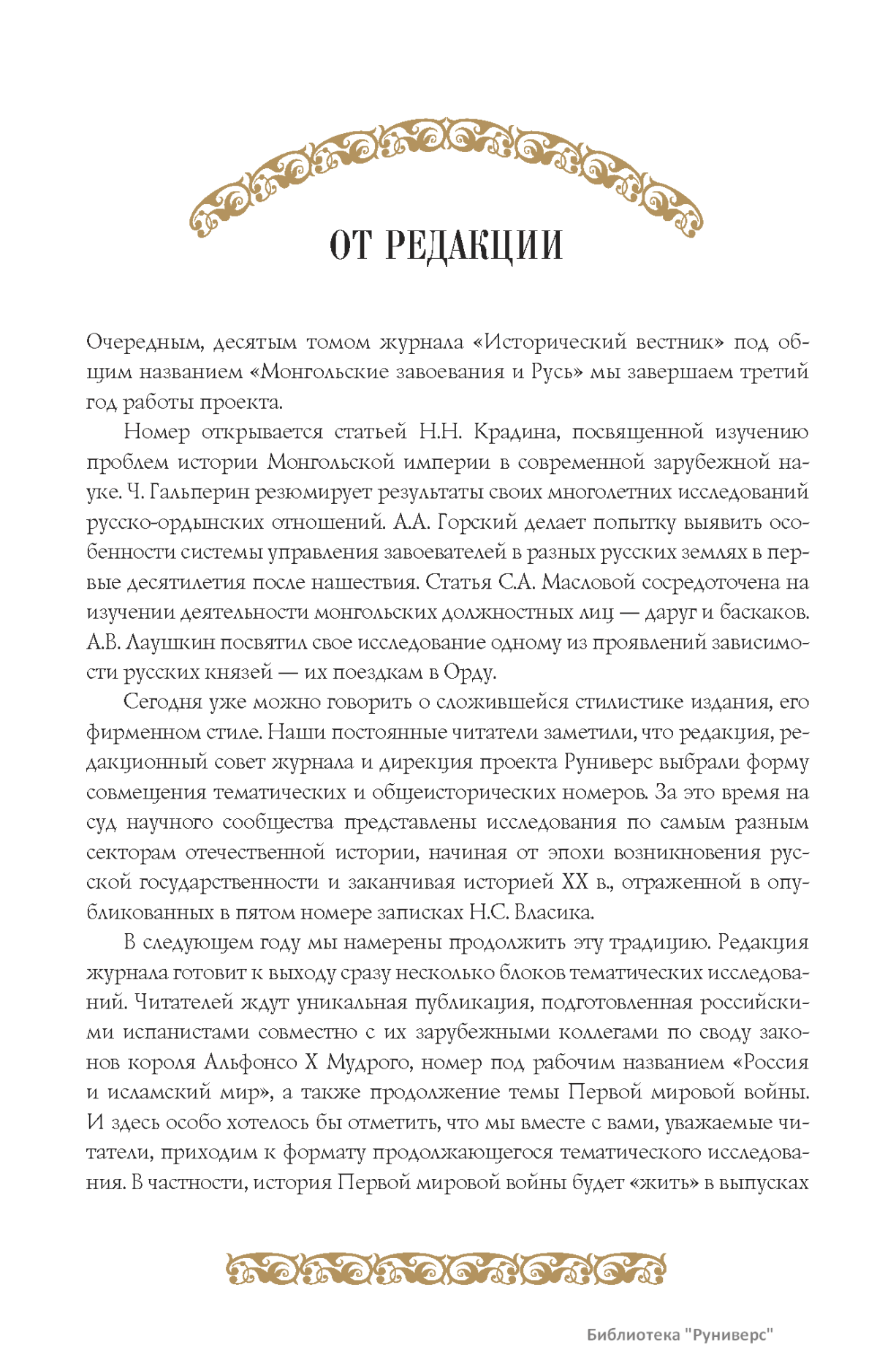 Дорогие коллеги, мы представляем вам первый номер «Исторического вестника», который одновременно обозначается 148-м томом, тем самым продолжая дореволюционное издание. Однако, перешагивая почти сто лет, мы понимаем, что реалии XXI века определяют и новое содержание журнала. История сегодня во многом актуализирована политикой. Именно геополитическая ситуация в мире, возвращающая нас к вопросам сохранения существующих границ, национальных и культурных ценностей, моральных и религиозных принципов, формирует еще одно измерение — проблему аутентичного исторического бытования народов и государств. С одной стороны, это вопрос географических ареалов государственных образований, с другой — тема, связанная с соприкосновением, взаимодействием процессов, культур и традиций. Во многом мы стоим и перед важнейшей этической проблемой. Мы должны не только вежливо и настойчиво указывать нашим уважаемым соседям на свои исторические права, но и сами уходить от искушения искусственного удревнения собственной истории или присвоения чужой. И здесь на сцену выходит его величество Исторический Научный Факт. Он и есть главный цензор и законодатель. На этом незыблемом основании будет строиться редакционная и научная работа «Исторического вестника».