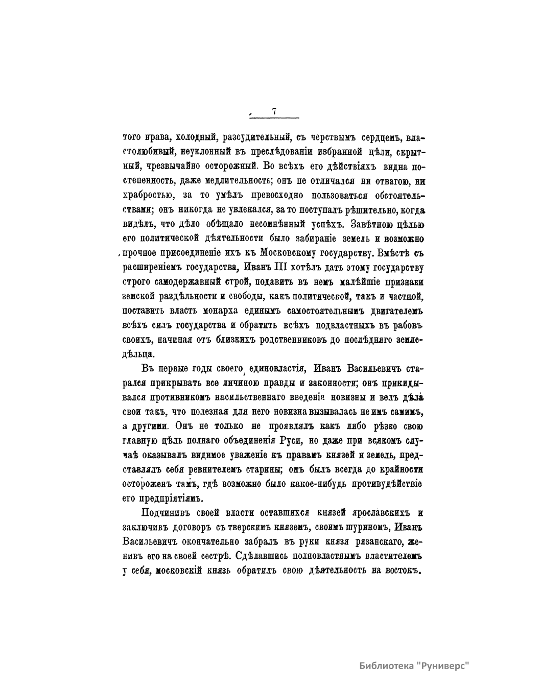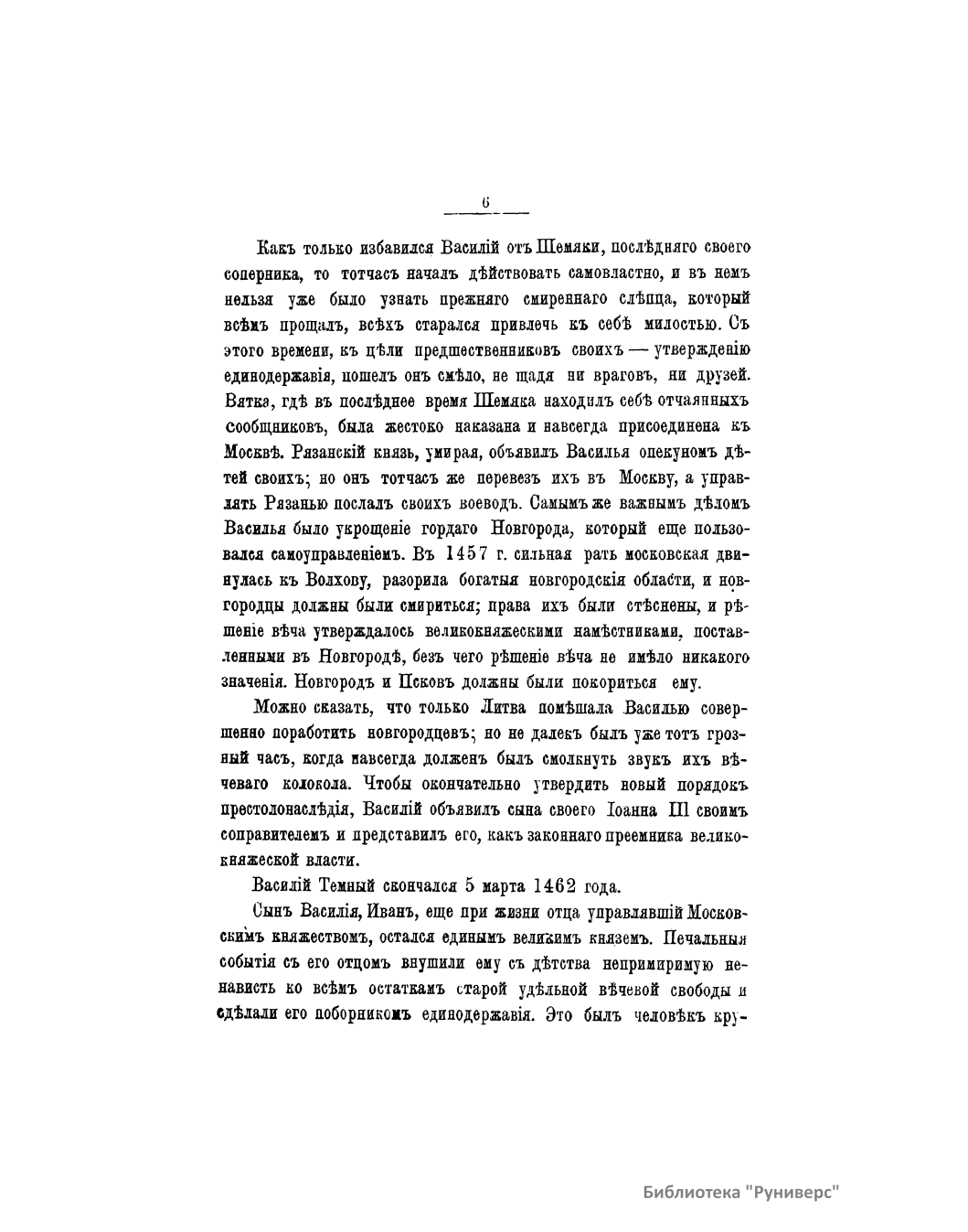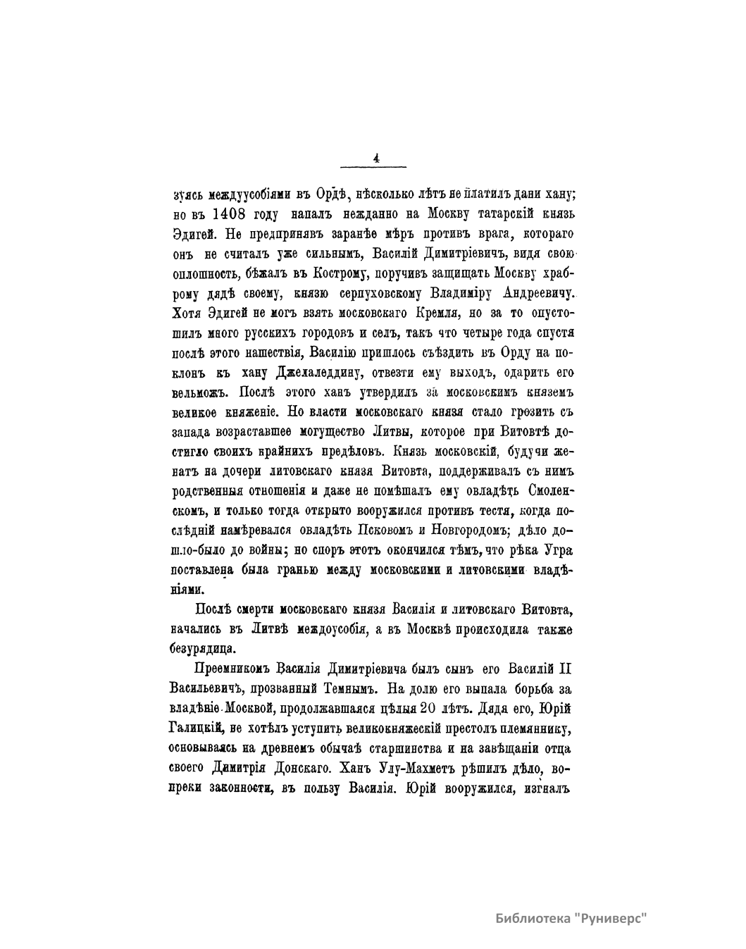 Популярная брошюра посвящена истории Московского княжества от смерти Дмитрия Донского до воцарения Ивана Грозного. Автор рассказывает о княжении Василия Дмитриевича, Василия II Васильевича (Темного), Ивана III Васильевича, Василия III Ивановича. Издание снабжено семью рисунками: Встреча иконы Владимирской Божьей матери на Кучковом поле. Примирение Василия Темного с Шемякою. Василий и сын его Иван III. Владыка Новгородский Симеон примиряет граждан. Уничтожение Новгородского веча. Иван III уничтожает ханскую басму. Торжество Василия III и кручина псковитян.