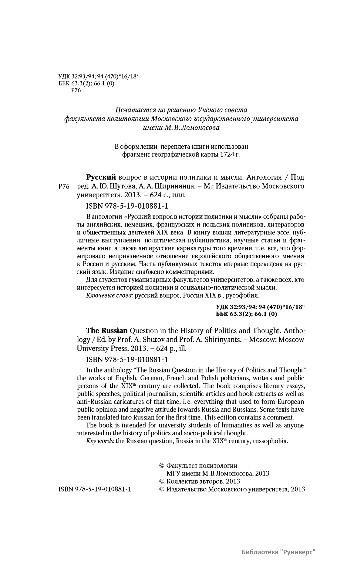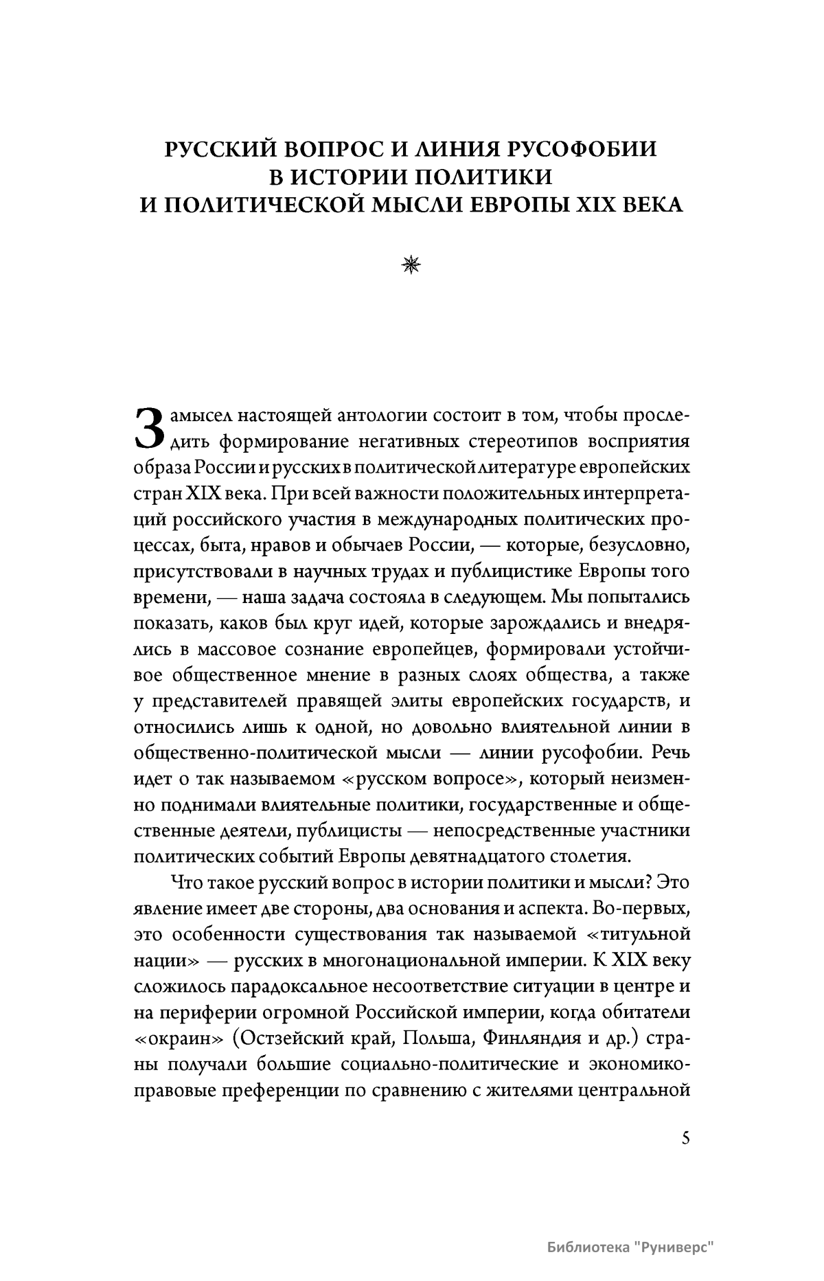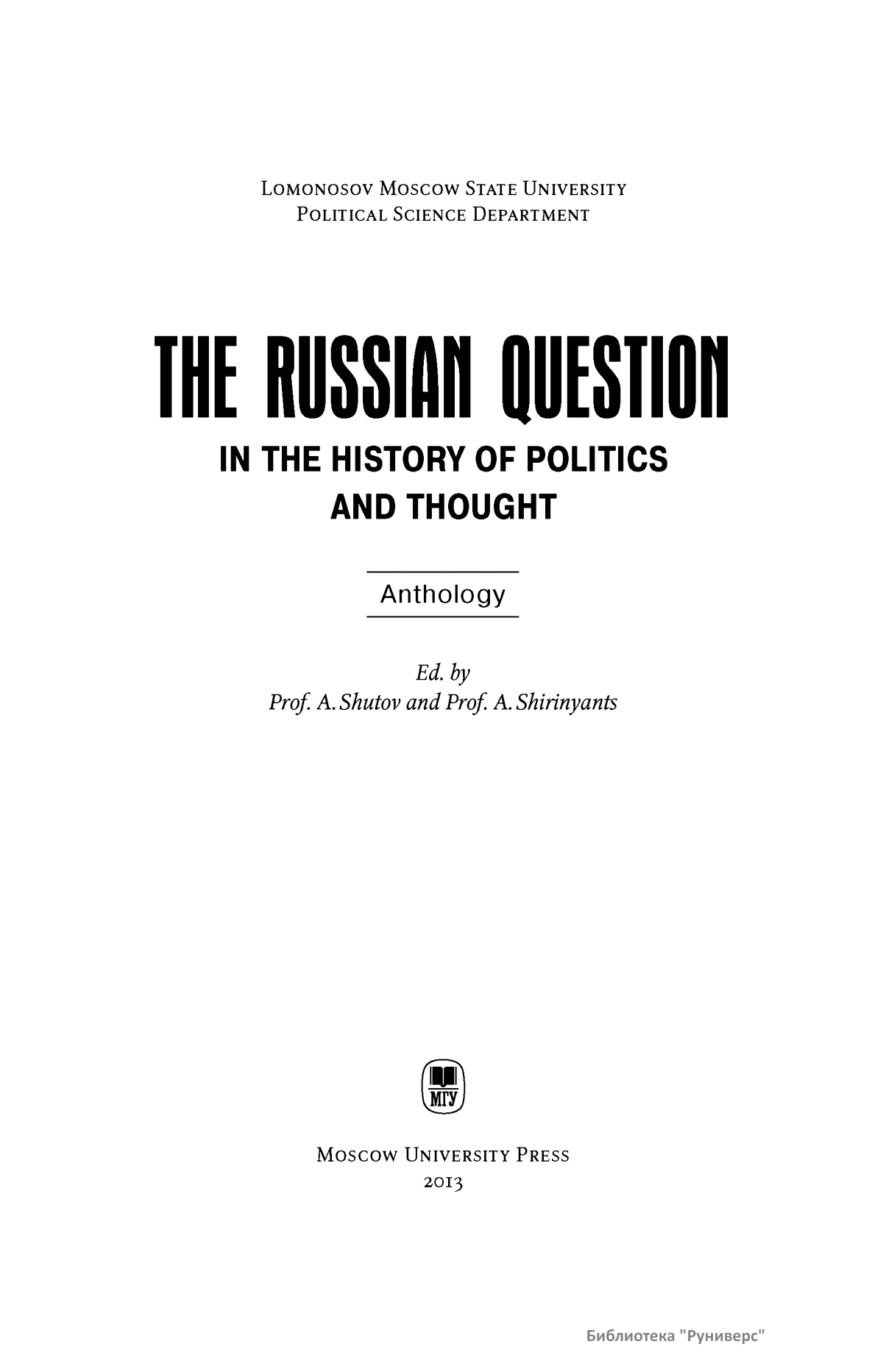 В антологии «Русский вопрос в истории политики и мысли» собраны работы английских, немецких, французских и польских политиков, литераторов и общественных деятелей XIX века. В книгу вошли литературные эссе, публичные выступления, политическая публицистика, научные статьи и фрагменты книг, а также антирусские карикатуры того времени, т. е. все, что формировало неприязненное отношение европейского общественного мнения к России и русским. Часть публикуемых текстов впервые переведена на русский язык. Издание снабжено комментариями. Для студентов гуманитарных факультетов университетов, а также всех, кто интересуется историей политики и социально-политической мысли.