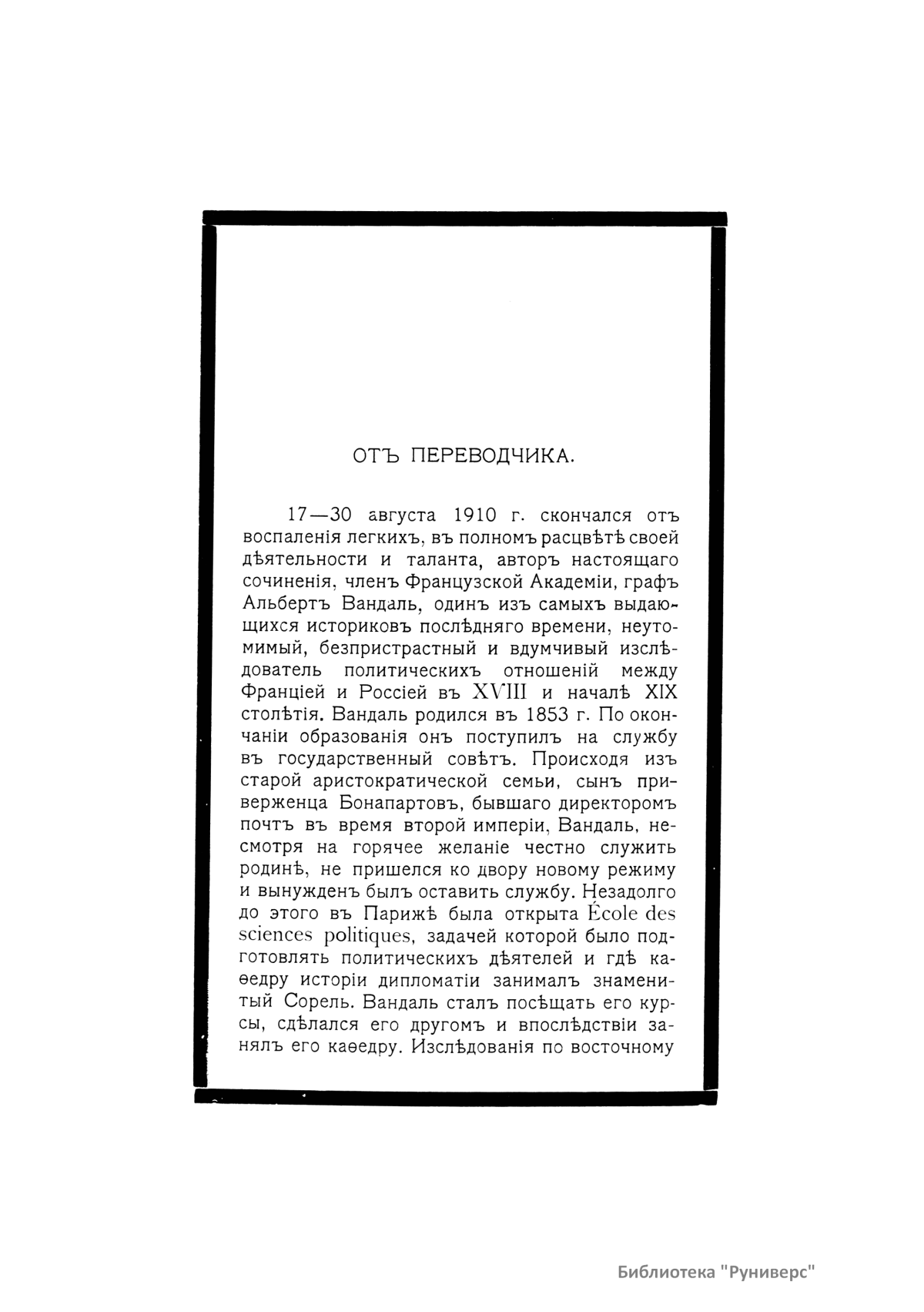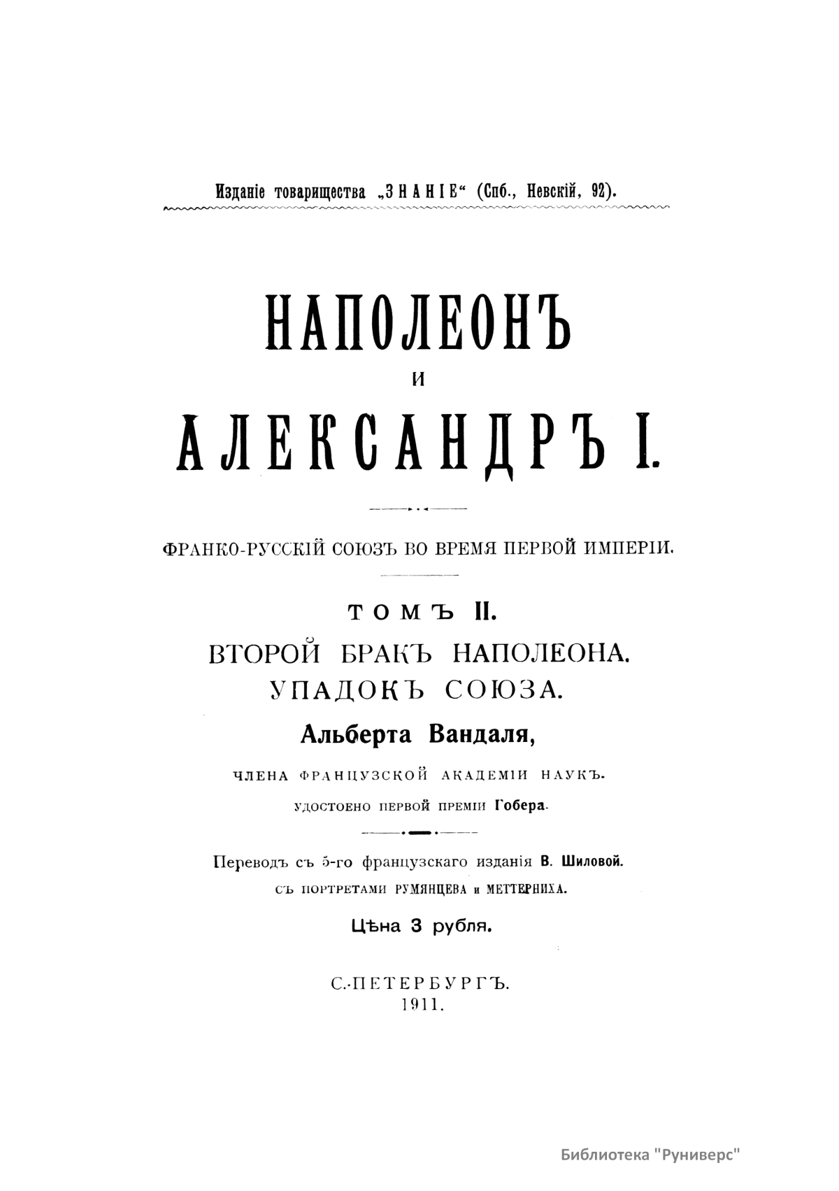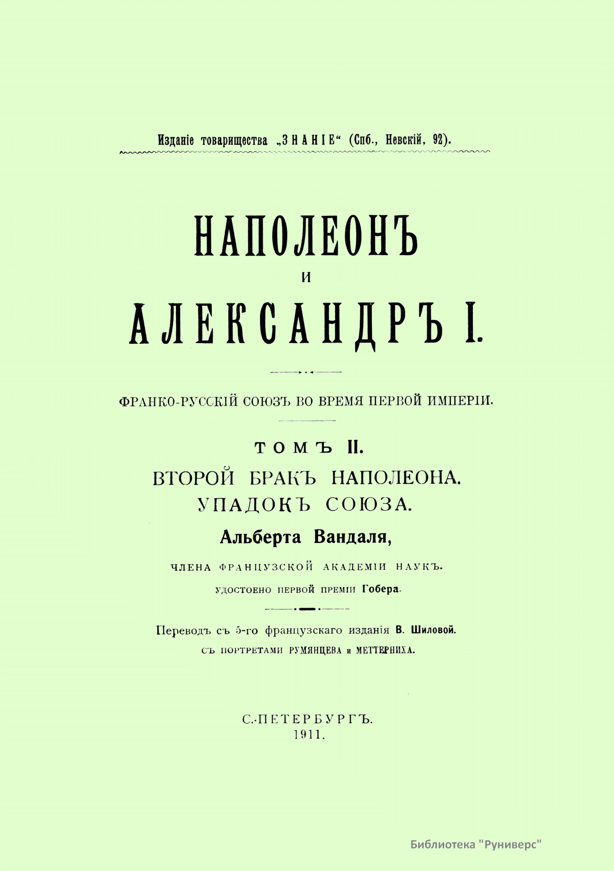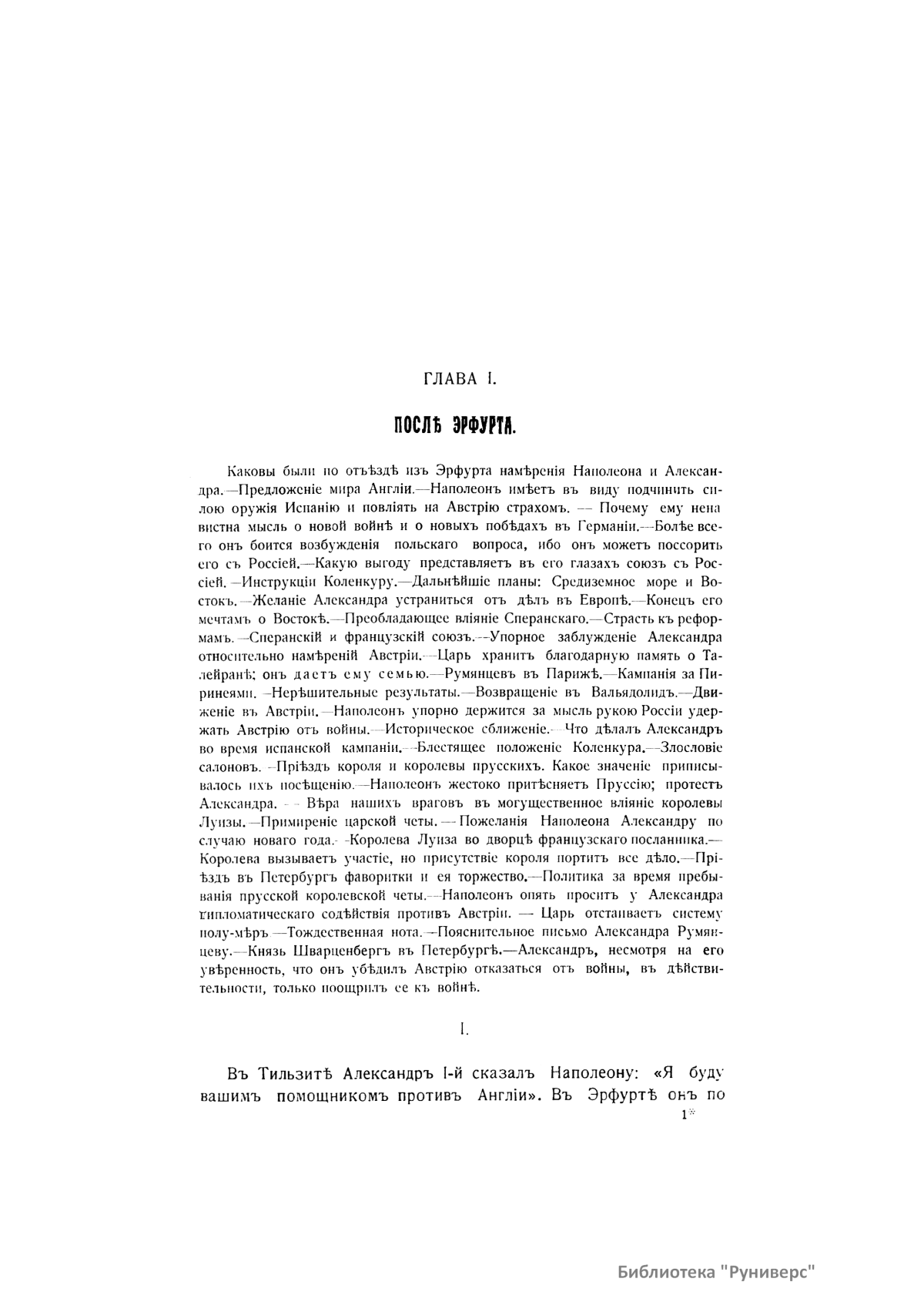 Автор настоящего исследования утверждает, что на протяжении всего своего царствования Наполеон преследовал во внешней политике одну неизменную цель: прочным миром с Англией обеспечить устойчивость своему делу, величие Франции и спокойствие мира. Главным политическим средством, которым он пользовался для достижения этой цели, в эпоху, сделавшуюся началом конца его карьеры, был союз с Александром I, русским императором. Если бы единодушие, к которому стремились в Тильзите, упрочилось и установилось надолго, быть может, Англия была бы побеждена и Франция и Европа приняли бы иной вид. Разрыв с Россией оживил угасавшую коалицию, вовлек Наполеона в роковые предприятия и привел его к гибели. Как образовался союз? Какие превратности встретил он на своем пути? Как видоизменялся и разрушался? Мог ли он существовать долее? Вот те вопросы, которые занимают главное место в европейской истории от 1807-го до 1812 г., т.е. от свидания в Тильзите до занятия Москвы. Изучение этих вопросов и составляет предмет настоящего труда.